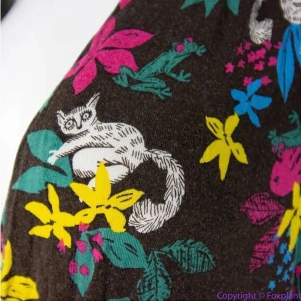 Modcloth Jungle Print Knit Dress, white cat blue bird, ring tailed lemur, XL Soft knit sleeveless dress with surplice V-neck, stretch fabric, elasticized waist , green chiffon contrast hem and sash, black with multicolored tropical floral and lemur print, unlined. You’ll smile every day that you wear this wild and whimsical ModCloth pick. Slip it on under a cardigan or blazer for the office, then wear it solo after-hours to show off the playful lemur print. Color: brown, white, blue The measurements provided are approximate and intended as a helpful reference but are not a guarantee of fit. Please review the measurements carefully and compare them to a similar garment you own before making a purchase. Actual colors may vary due to lighting conditions and monitor settings. Excellent condition with no noticeable flaws, stains, or damages.