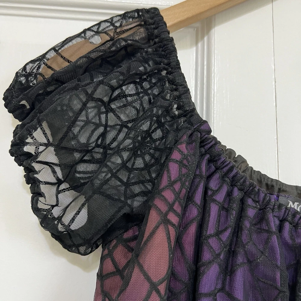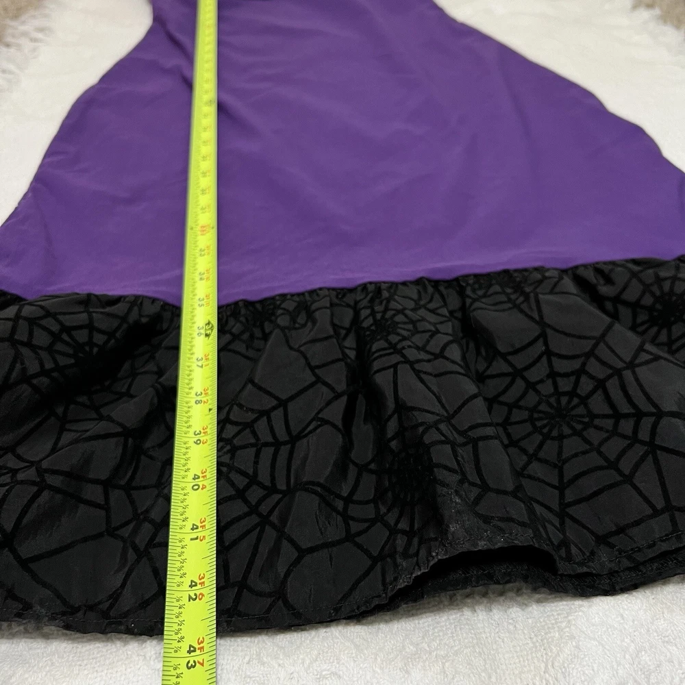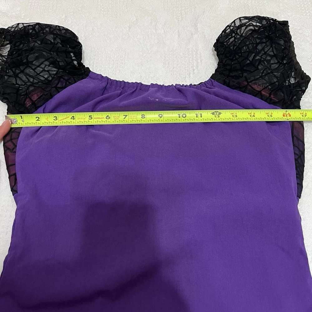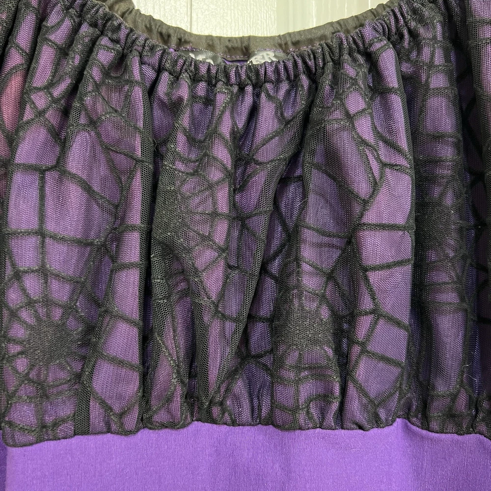 Approximate measurements: Across underarms - 16" Waist - 14" Length - 43" -pullover styling, stretchy fabric, satin fabric to the chest with mesh overlay, elastic neckline and sleeves, velvet spider web detailing to the ruffle trim -tiny spots/marks on the upper back as pictured -Made in USA Great preowned condition