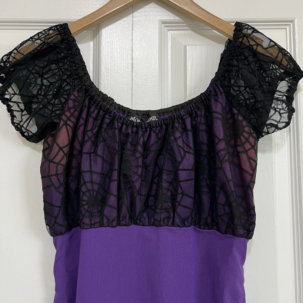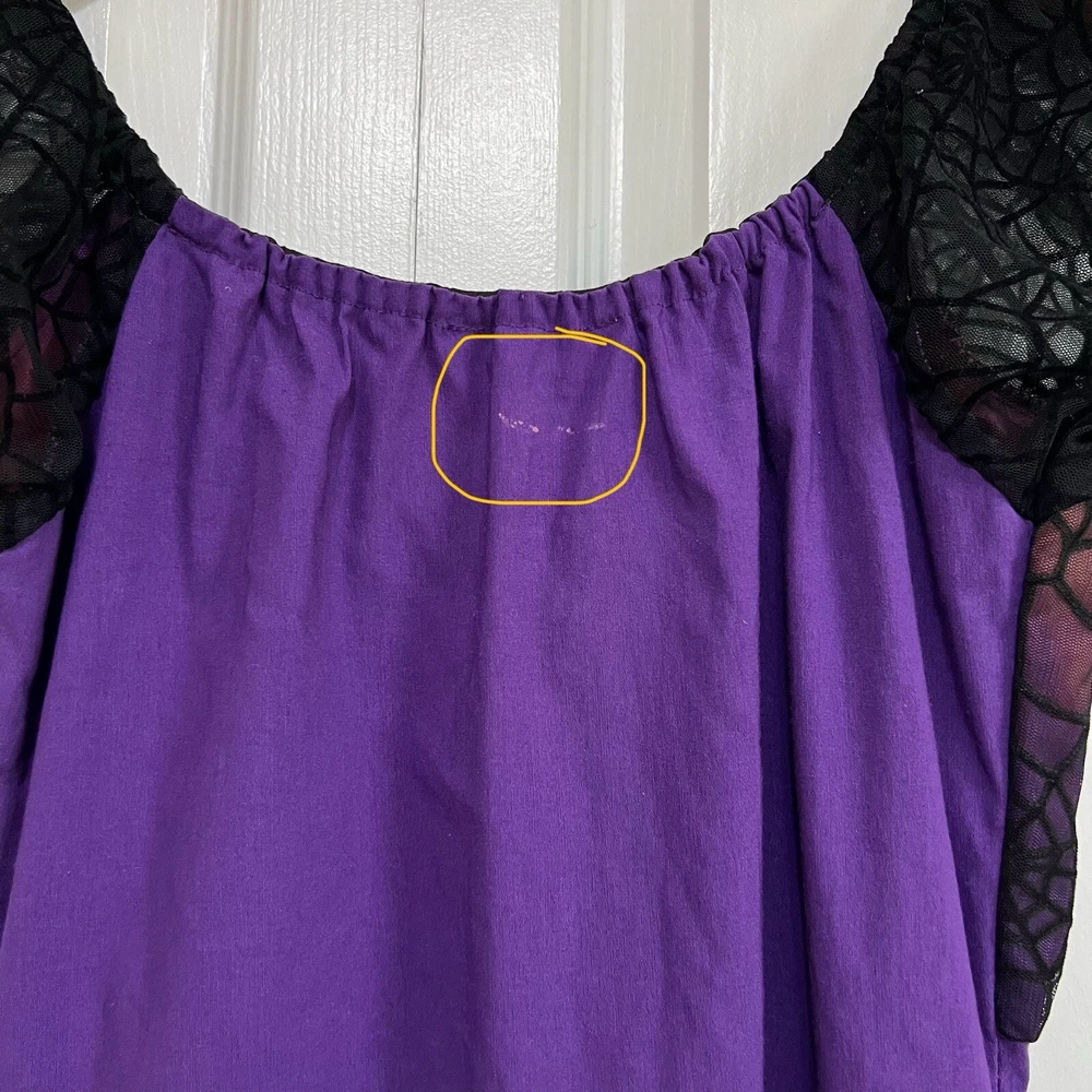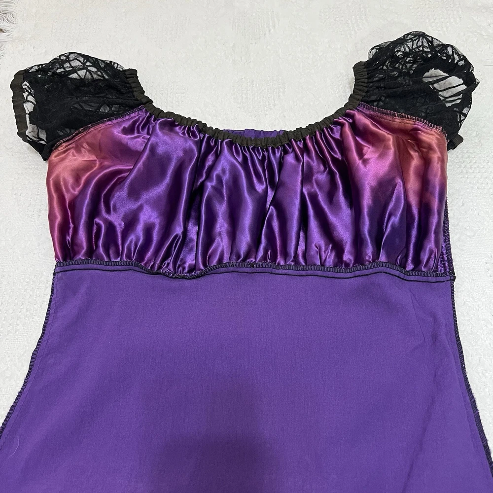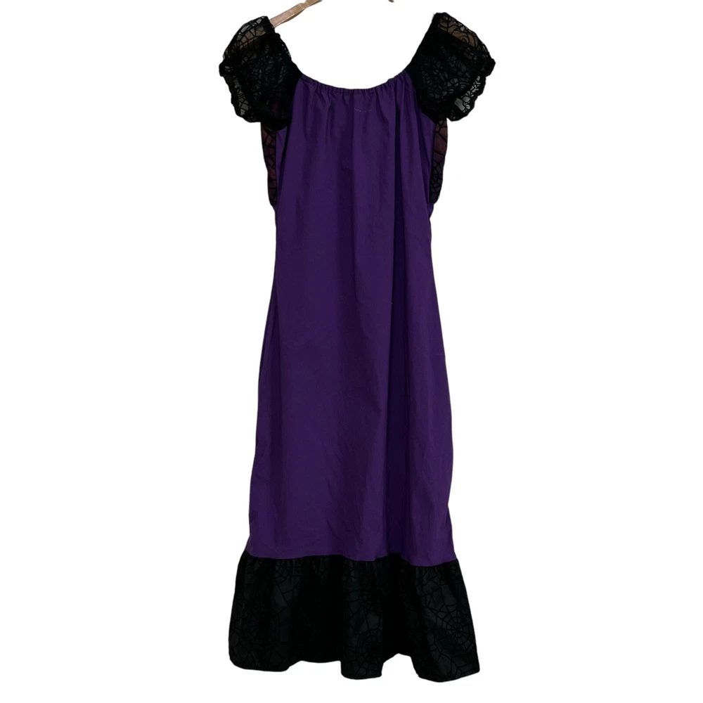 Approximate measurements: Across underarms - 16" Waist - 14" Length - 43" -pullover styling, stretchy fabric, satin fabric to the chest with mesh overlay, elastic neckline and sleeves, velvet spider web detailing to the ruffle trim -tiny spots/marks on the upper back as pictured -Made in USA Great preowned condition