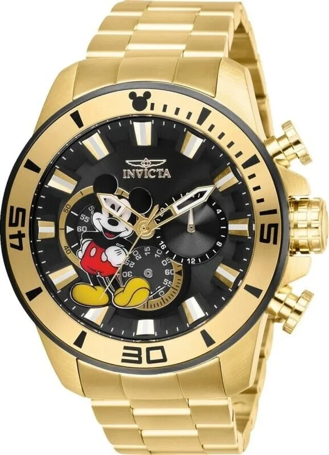This impressive Invicta Disney Limited Edition watch features a Quartz movement, all in a solid gold case. Its black metal dial is enclosed by a highly protective Flame Fusion Crystal. This watch is finished by a strong gold stainless steel band, and it offers 100m water resistance. Case & Dial Dial Color: Black Dial Material: Metal Case Size: 48.5mm Case Tone: Gold Case Material: Stainless Steel Bezel Function: Stationary Crown Type: Push Stone Type: None Luminous Color: White Luminous Material: Traser Tube Movement Movement Type: Quartz Movement Components: Japan Movement Vendor: TMI Movement Caliber: VD54 Movement Jewels: 0 Band Band Length (mm): 185 Band Size (mm): 24 Buckle Type: Regular: Interchangeable Band: No Clasp Type: Regular Other Band Tone: Gold Tone Crystal Type: Flame Fusion Chronograph Function: 60 Second Calendar Function: None Category: Watches Gender: Men's Country/Territory of Origin: Japan TERMS OF SALE: - Payment Is Expected Immediately. An Unpaid Item Case Will Be Opened After 48 Hours of Non-Payment. - All Items Usually Ship Within 1 Day of Cleared Payment Monday-Friday. All Orders That Come in Over the Weekend Won't Ship Until Monday Unless There's a Holiday. - Double Check Your Shipping Address Before Finalizing Purchase. We Ship to the Address Provided By eBay, Made Sure Yours Is Up to Date. - Your Tracking Number Will Be Uploaded on Ebay Once We Print Label for Your Order. - Buyers Can Use "ask seller a question" For Questions and We Will Respond Promptly. OUR RETURN POLICY: - Returns Are Accepted Within 14 Days After the Delivery Date. - Returned Item Must Be in Its Original Condition Including Box Packaging & All Accessories (protective plastics intact, tags and documents, boxes, and accessories unused and undamaged). - Refund Is for Exchange When Available or Full Refund Less the Shipping Charges Paid to Shipping Company for Delivery to Your Location. - Refused Shipments or Returns Due to Buyer's Remorse Would Incur a Restocking Fee Of 15% Of the Item. Addresses Entered Incorrectly and Customers Not Available for Delivery Are Included as Refused Shipments. - Items Returned in Any Condition Other Than as Shipped Out May Add to the Restocking Fee Up to 50% Or Cause the Item to Be Refused and Shipped Back with No Refund Applied at Buyer's Expense
