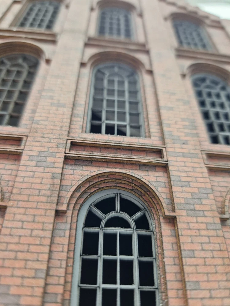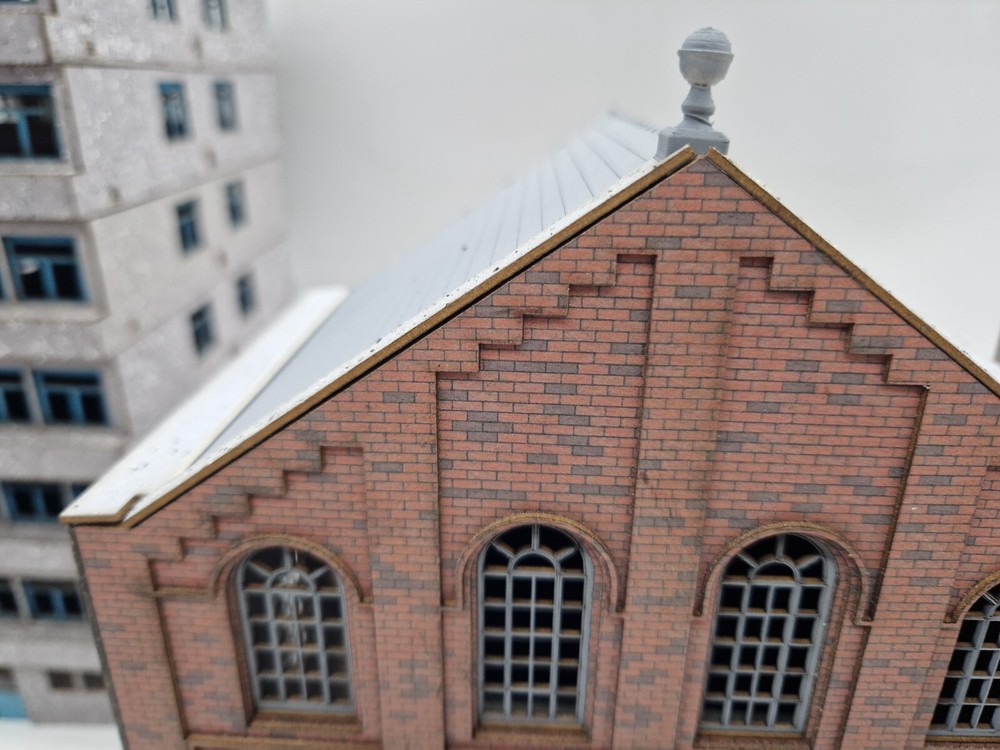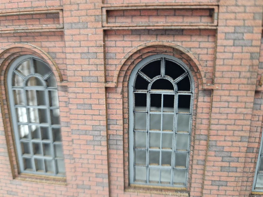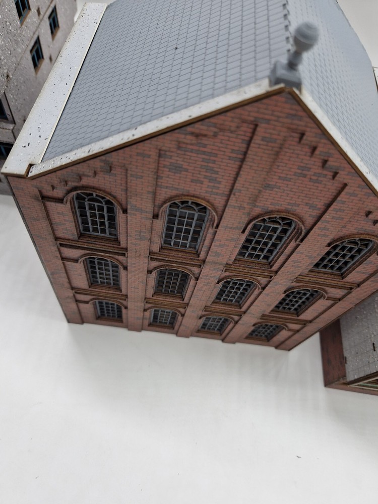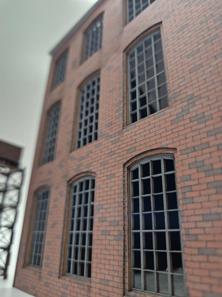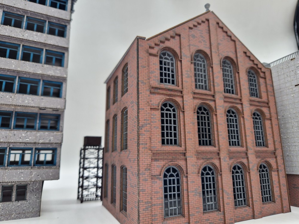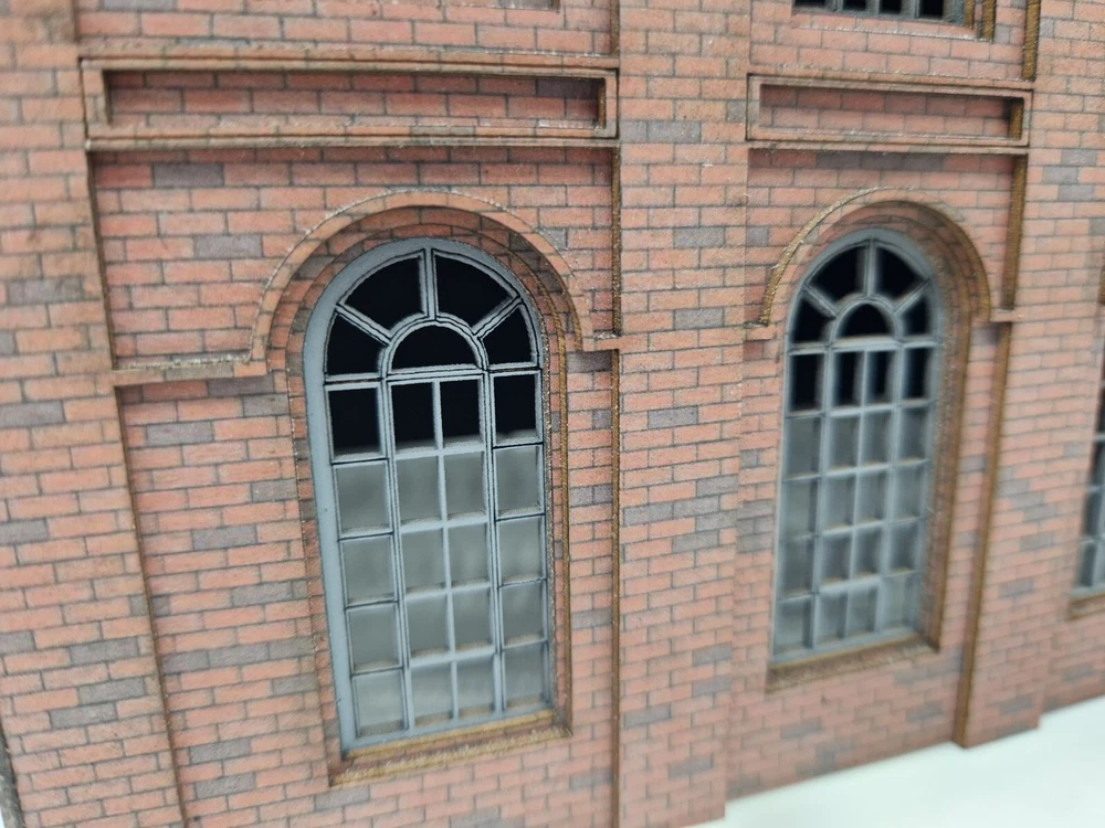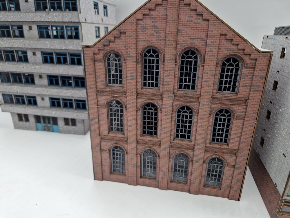 Modelux I and R Morley Main Building - full relief kit Fully coloured. The brick is litho printed and laminated onto 1.3mm multicore board. Every component is fully coloured The roof is black The windows are misted grey The side elevations feature Modedux 'Invisiseam' meaning near invisible joins between the elevations. The whole assembly is robust and very realistic. width - 150mmmm Height to roof - 240mm depth overall - 180mm Flat pack. PVA required for assembly