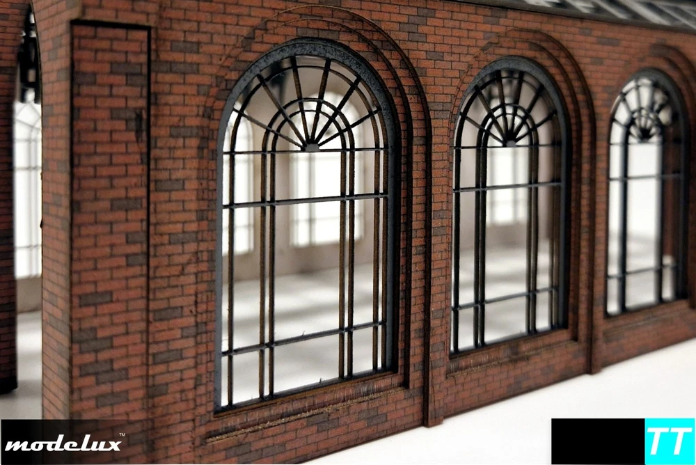 TT Gauge 1:120 Modelux 'Cheltenham' 2 lane Engine Shed Kit Dimensions on 2nd photo Fully coloured. The brick is litho printed and laminated onto 1.3mm multicore board. Every component is fully coloured The roof is grey and features structural trusses. The windows are not glazed - there is a glazing pack available in a separate listing The downspouts and downspout pans are NOT included, but are available separately The gables feature Modedux 'Invisiseam' meaning near invisible joins between the elevations. The walls are made 4 layers - acetate windows, then the window frame sheet, the window reveal brickwork, and finally the piers .... The whole assembly is robust and very realistic. This kit is designed so that another module can join in series, if desired, to extend the length ( as long as you require ). See Data sheet for dimensions ( photo on listing) See other listings for more Modelux at TT 1:120 YT Video for assembly - search Cheltenham Engine Tutorial Flat pack. PVA required for assembly