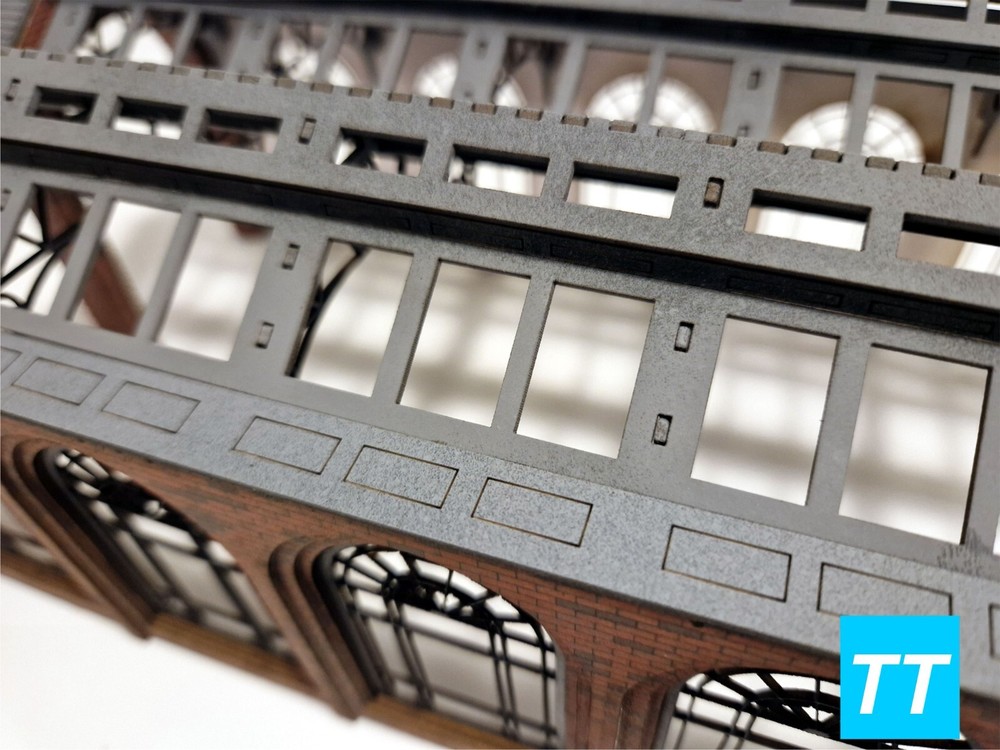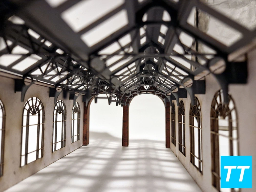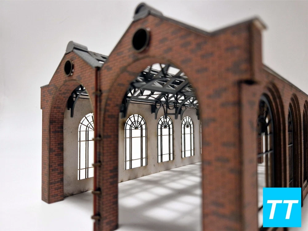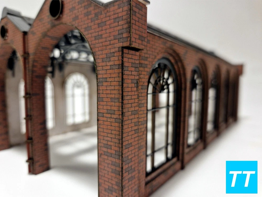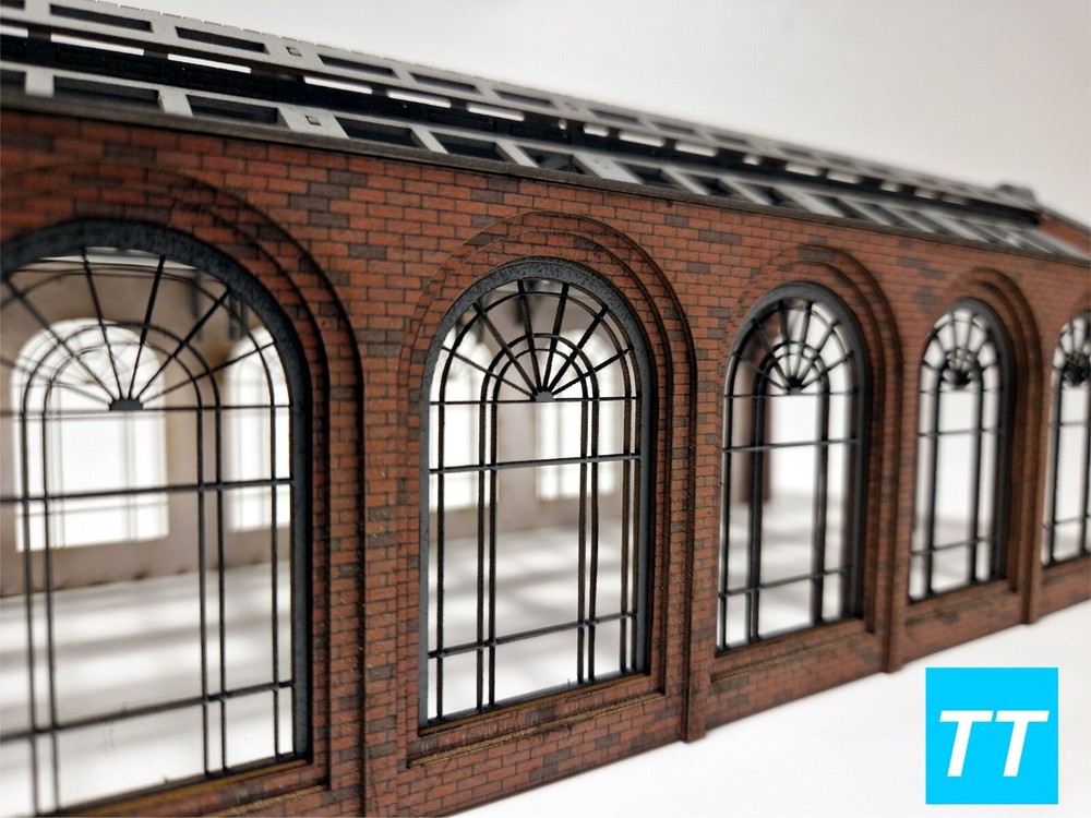 TT Gauge 1:120 Modelux 'Cheltenham' 2 lane Engine Shed Kit Dimensions on 2nd photo Fully coloured. The brick is litho printed and laminated onto 1.3mm multicore board. Every component is fully coloured The roof is grey and features structural trusses. The windows are not glazed - there is a glazing pack available in a separate listing The downspouts and downspout pans are NOT included, but are available separately The gables feature Modedux 'Invisiseam' meaning near invisible joins between the elevations. The walls are made 4 layers - acetate windows, then the window frame sheet, the window reveal brickwork, and finally the piers .... The whole assembly is robust and very realistic. This kit is designed so that another module can join in series, if desired, to extend the length ( as long as you require ). See Data sheet for dimensions ( photo on listing) See other listings for more Modelux at TT 1:120 YT Video for assembly - search Cheltenham Engine Tutorial Flat pack. PVA required for assembly