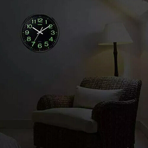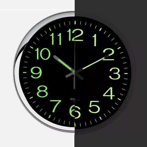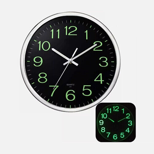 Product Description Note: Night Lights Function -- If clock receives enough sunlight at day, it will shine for first few hours at night. 12'' Modern Luminous Large Quartz Wall Clock Non-ticking Fluorescence Indoor US Night Lights Function -- If clock receives enough sunlight at day, it will shine for first few hours at night. Easy to Read – 12 inch basic dial quartz wall clock with luminous Arabic numeral analog display make it easy to see from any corner of your room. Updated quartz movements to ensure accurate time Quite Wall Clock -- Updated quartz movement, super quiet & non-ticking, Quiet sweep second hand, no ticking to ensure a good sleeping or working Classical Design -- wall clock perfect for dining rooms, living rooms, family rooms, bedrooms, study room, kitchen, office and meeting room Power Source -- Battery operated wall clock, Powered by 1 x AA battery (Not Included) Description: The 12” black background wall clock comes with night light function. Make it easy to view in night. The large display clock with precise quartz movements for accurate time; Sweep movement eliminates disturbing ticking sound. the large display wall clock will give you an accurate read on time down to the second so you don't need to second-guess yourself. Perfect decorative clock for school, kitchen, living room, bedroom, family room, meeting room, dining room, office, pool or patio - any place accurate timekeeping is needed. The silent quartz wall clock black base are made of premium plastic that can keep well function and dry in any weather condition, instead of using cardboard as clock background. It's not easy damaged in moisture and wet condition. Specifications Color : Sliver frame, black background Material: Plastic frame, Glass lens, Aluminum clock hands Number: luminous number Dimension: 12 x 12 x 1.57 in Weight: 1.0lbs Style: Modern / Classic Power Supply:1 x AA 1.5V Battery (Not included) Note Try to use ordinary Carbon Zinc battery, not Alkaline battery to avoid the abnormal display. The product might be run out of energy during a long day in the box, so I advise to let the wall clock absorb light energy (sunshine or fluorescent lamp) more than 4 hour before installation when receive the products. The light up function is basically glow in numbers, so they get dimmer as the night wears on, especially if this doesn't get enough sun or other light during the day. Packaging Includes: 1 x 12inch Quartz Wall Clock About Us Payment Shipping Returns Contact Us Based in USA, offering high quality product Pick up orders welcome here and we also offer great discount for wholesales. We only accept PayPal payment . We process and dispatch your purchase within 2 business day after payment clearance. Please contact us if you have special requirements (combination of packaging etc.). We offer free USPS or FEDEX Package as default. If you choose express post, we charge a flat rate and we Express Post, which can be delivered in 1-3 business days, depending on your location. Please contact us first when return, exchange and refund is required. Any direct return of purchased items will not be processed. Change-of-mind return can only be accepted within 7 days after purchase. All other returns can be accepted in 30 days. We will closely examine the condition of the returned items and will not issue any refund/exchange before we make sure the items are in their original neat conditions. Before leaving us neutral or negative feedback, please contact us first. We will do everything we can to give you a satisfying solution. Please don't open case via eBay or PayPal. Please don't open any return request before contact us. We do our best to resolve any issue. Leaving negative feedback and low ratings doesn't get things solved. So please talk with us and we will not let you down. About Us Based in USA, offering high quality product Pick up orders welcome here and we also offer great discount for wholesales. Payment We only accept PayPal payment . Shipping We process and dispatch your purchase within 2 business day after payment clearance. Please contact us if you have special requirements (combination of packaging etc.). We offer free USPS or FEDEX Package as default. If you choose express post, we charge a flat rate and we Express Post, which can be delivered in 1-3 business days, depending on your location. Returns Please contact us first when return, exchange and refund is required. Any direct return of purchased items will not be processed. Change-of-mind return can only be accepted within 7 days after purchase. All other returns can be accepted in 30 days. We will closely examine the condition of the returned items and will not issue any refund/exchange before we make sure the items are in their original neat conditions. Contact Us Before leaving us neutral or negative feedback, please contact us first. We will do everything we can to give you a satisfying solution. Please don't open case via eBay or PayPal. Please don't open any return request before contact us. We do our best to resolve any issue. Leaving negative feedback and low ratings doesn't get things solved. So please talk with us and we will not let you down.