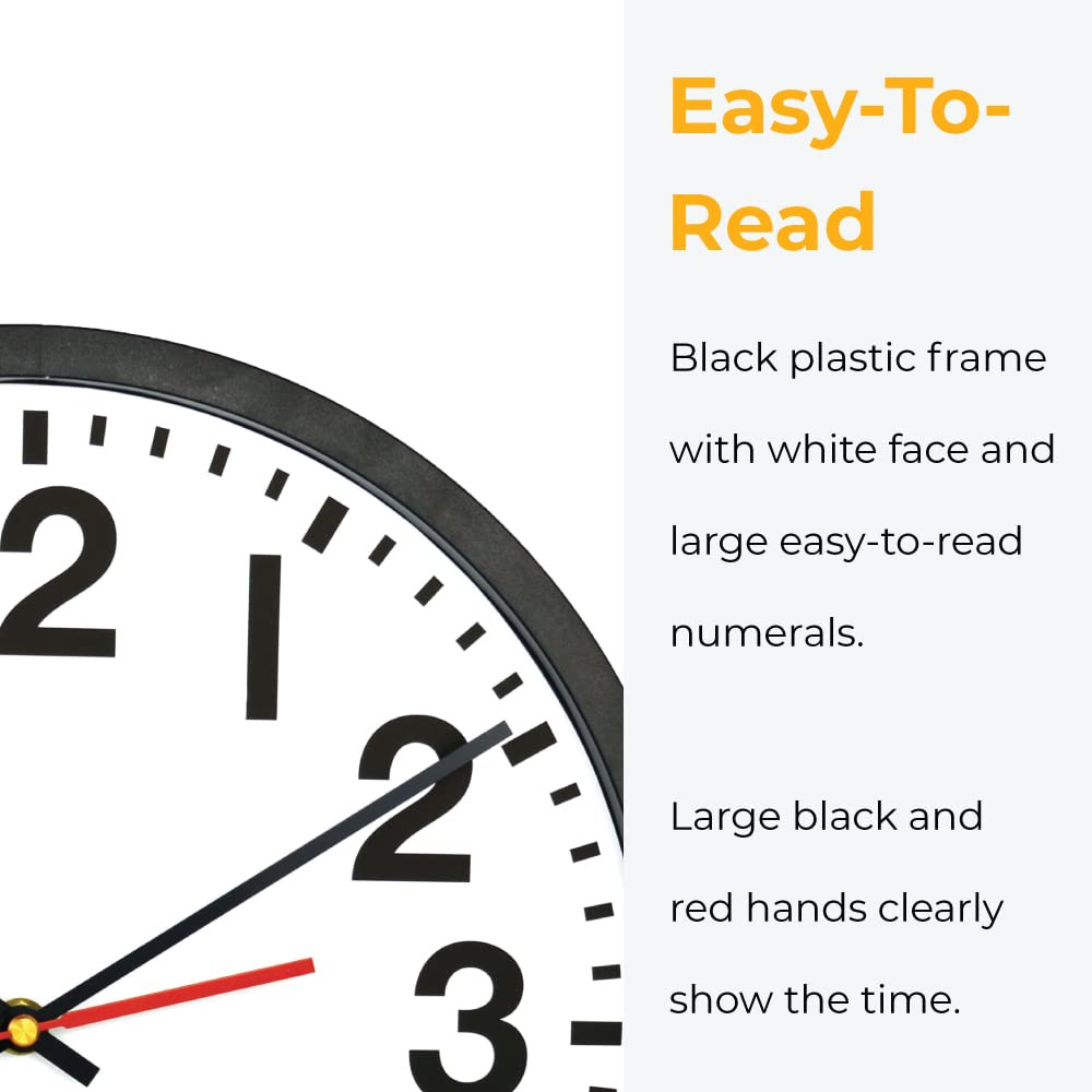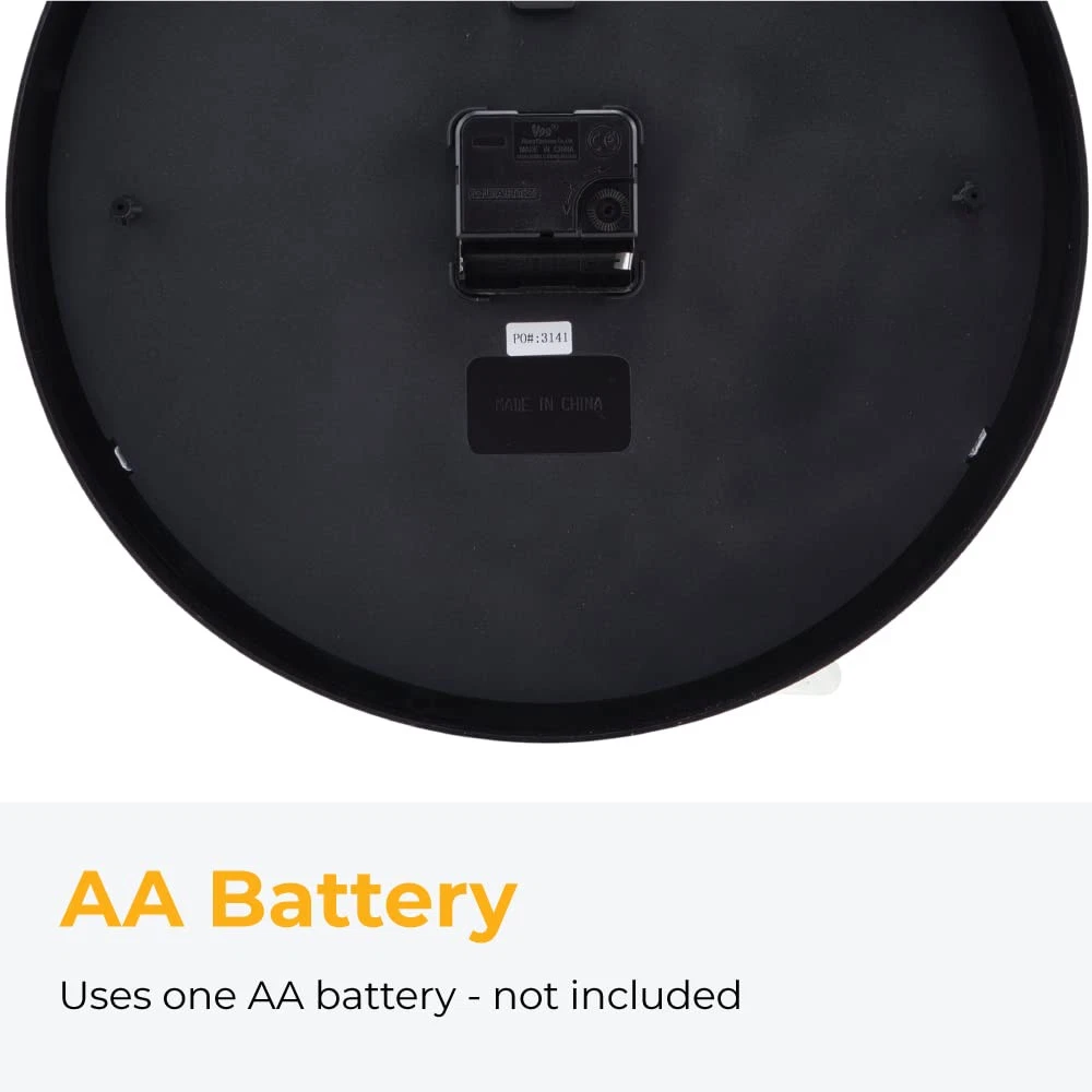 This 13" commercial style clock is ideal for large rooms and work areas. It features a sturdy black plastic frame and the large, black numerals against the white dial make the clock easy to read, even from a distance. Includes a shatter-resistant flat lens which prevents the build-up of dust on the face. This clock uses AA battery, which is not included. A MODERN CLOCK FOR ANY SPACE: This black wall clock is a stylish and functional addition to any room LARGE WALL CLOCK FOR EASY READABILITY: The bold hands and numbering make for an easy read at any distance, perfect as office or classroom decor BATTERY OPERATED WALL CLOCK: This clock is battery operated, making it easy to install and maintain. Requires 1 AA battery - not included BLACK, SILENT WALL CLOCK: It's smooth and silent hands make for a non-distracting wall feature, allowing you to focus on your work DURABLE CONSTRUCTION: Frame is over 1 inch thick and includes shatter-resistant raised lens