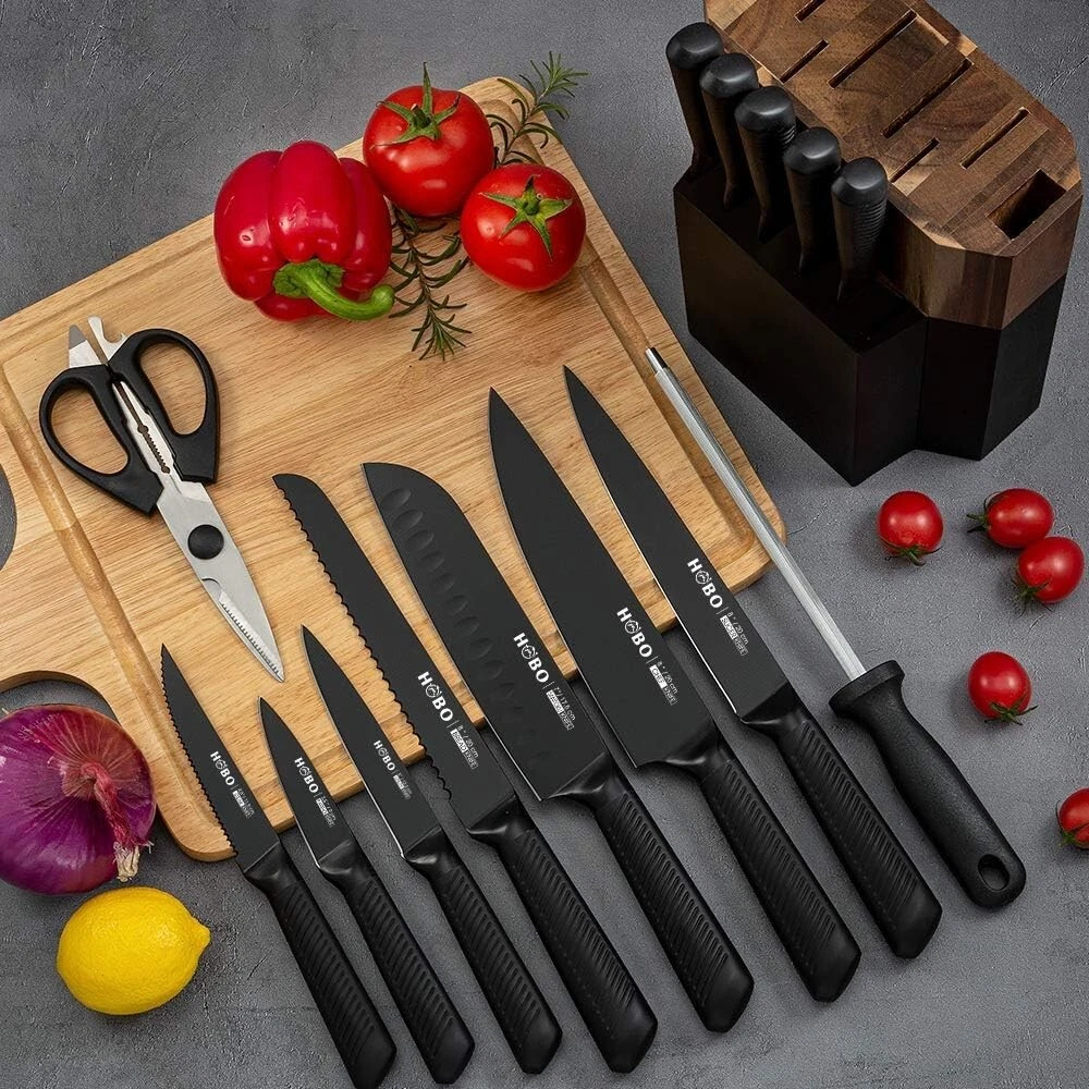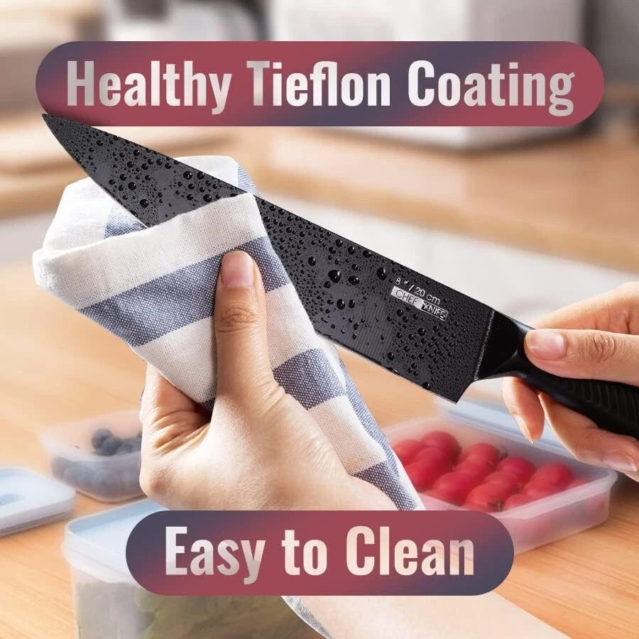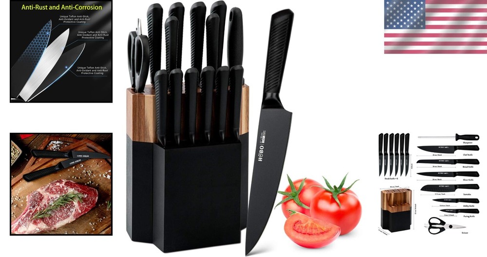 Brand: Unbranded Type: Knife Block Set Color: Black Blade Edge: Straight Item Weight: 8.18 Pounds gtin13: Does not apply Food Compatibility: Universal, Meat, Vegetables, Fruits, Bread Handle Material: Stainless Steel Package Dimensions: 14.29 X 9.45 X 5.67 Inches Set Includes: Knife Set, 8’’ chef knife, 8’’ slicing knife, 7’’ santoku knife, 8’’ bread knife, 5’’ utility knife, 3.5’’ paring knife, 5'' kitchen scissors, 1 * knife sharpener, 6 * 4.5’’ steak knives Personalize: No Number of Items in Set: 15 Blade Material: High Carbon Stainless Steel Construction Type: Coated Stamped Material: High Carbon Stainless Steel, Stainless Steel Style: Modern, Contemporary Is Dishwasher Safe: No UPC: Does not apply Features: With Knife Sharpener, High-grade Anti-rust Coating, Easy Clean, Non-Stick, Rust Resistant, Multi Purpose