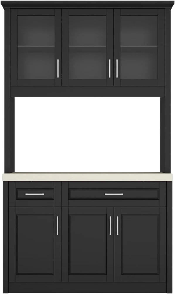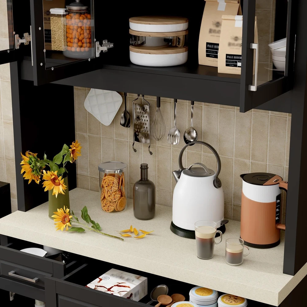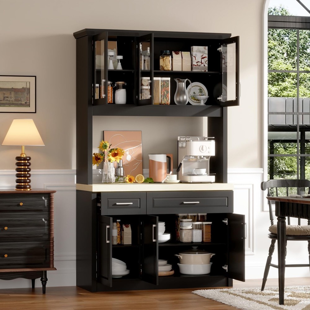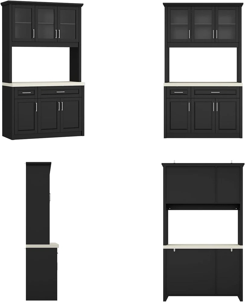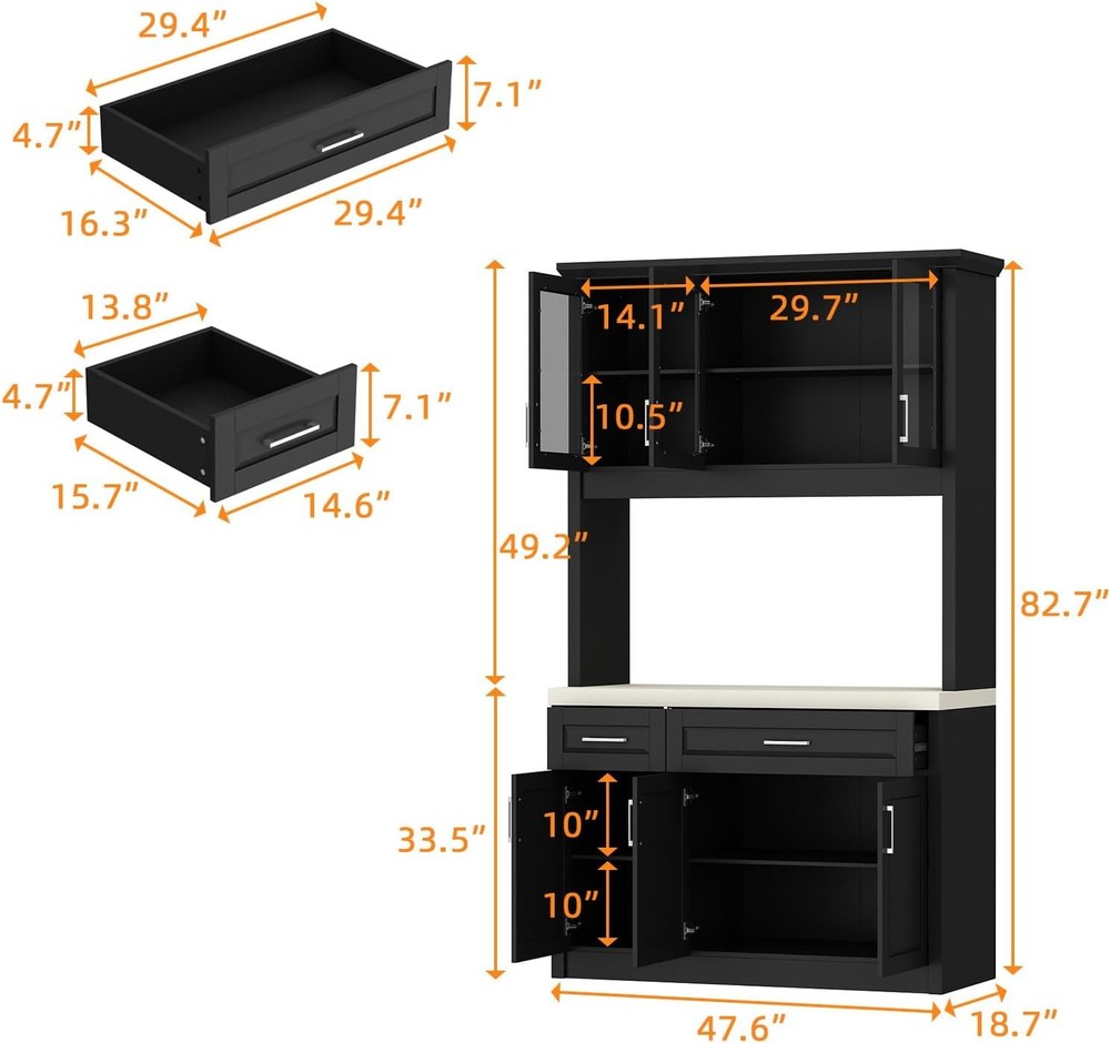 Product Description About this item • Modern Pantry: This kitchen cabinet features a modern exterior design. The main body of the cabinet is in a steady black color, while the countertop is off-white, creating a more visually layered effect. Paired with silver handles, it exudes simplicity and sophistication • Varied Functions: This kitchen cabinet storage cabinet is versatile. In the kitchen, it can store dishes, kitchenware, and the cabinet on the upper door can display wine. It can store magazines, books and decorations in the living room, both storage space and display area • Sturdy Structure: This food pantry is made of P2 grade MDF, ensuring overall sturdiness and stability. The cabinet doors are equipped with metal hinges and metal handles for extra durability, and the drawers are equipped with metal slides for smooth opening and closing • Ample Storage Spaces: This storage cabinet offers plenty of storage space. It consists of 2 drawers and 4 cabinets with 2 shelves. The spacious tabletop can hold a variety of items to meet your different storage needs • Easy to Assemble: Each component of this pantry is clearly labeled with its corresponding number. Therefore, you can follow the instructions in the manual step by step to assemble a practical and exquisite kitchen cabinet  Timechee Pantry Practical,Multi-functional,Sturdy Black dining cabinet with a clever corner design, combining practical storage and style, a beauty in the kitchen! Specifications: Material: MDF Color: Black + Beige Overall Dimensions: 18.7"D x 47.6"W x 82.7"H Cabinet with Glass Doors Storage Drawers Metal Handles Sturdy Connection Timechee Pantry Color Black + Beige Overall Dimensions 18.7"D x 47.6"W x 82.7"H Material MDF Package Includes 1 x Pantry ; 1 x Instruction On Aug 15, 2025 at 00:28:36 PDT, seller added the following information: