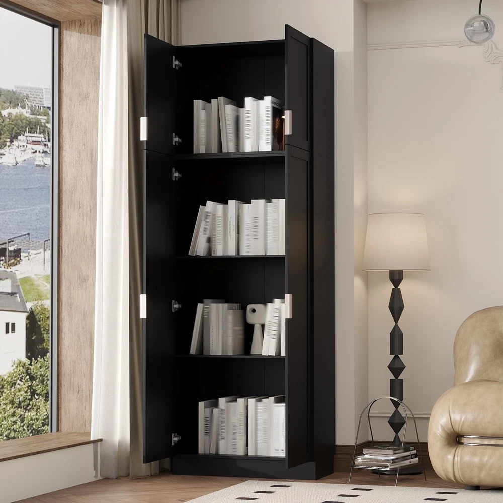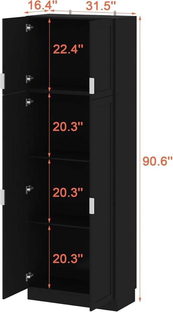 Product Description About this item • Minimalist Storage Cabinet: This cabinet is a pure black tall cabinet with a simple and elegant appearance. It has a 4-door design for the upper and lower zones, paired with silver long handles to add a touch of sophistication. The cabinet body is tall and slender, combining a concise shape with practical functions to create a calm and modern atmosphere • Sturdy Construction: This modern cabinet boasts high-quality materials. The main body uses P2 grade MDF, which is robust and durable. It’s equipped with aluminum handles, featuring a delicate and sturdy texture. Metal hinges are adopted at the cabinet door joints, with strong load-bearing capacity and smooth opening • Large Capacity: This bookcase with doors features an ingenious storage design. The upper part is a separate small cabinet, ideal for storing small items. The lower large cabinet has three internal shelves, with neat space to store books, sundries, etc • Versatile: This tall bookcase is highly versatile. It can serve as a bookshelf, with 4 layers for categorized book storage. It also works as a storage cabinet for sundries and collections. Suitable for the living room to decorate corners, for the study to organize books, and for the office to store documents, switching scenarios flexibly to meet diverse needs • Simple to Install: Each assembly part of the bookshelf is numbered accordingly, just follow the instructions step by step to get a large storage bookshelf Timechee Storage Cabinet Practical, Modern, Sturdy This large black storage cabinet makes storing books and sundries a breeze. It fits various spaces, being both practical and stylish! Specifications: Material: P2 Grade MDF Color: Black Overall Dimensions: 16.4"D x 31.5"W x 90.6"H Metal Handles Sturdy Connection Thickened Base Anti-tipping Kit Timechee Storage Cabinet Color Black Overall Dimensions 16.4"D x 31.5"W x 90.6"H Material P2 Grade MDF Package Includes 1 x Storage Cabinet, 1 x Instruction On Aug 15, 2025 at 00:27:29 PDT, seller added the following information: