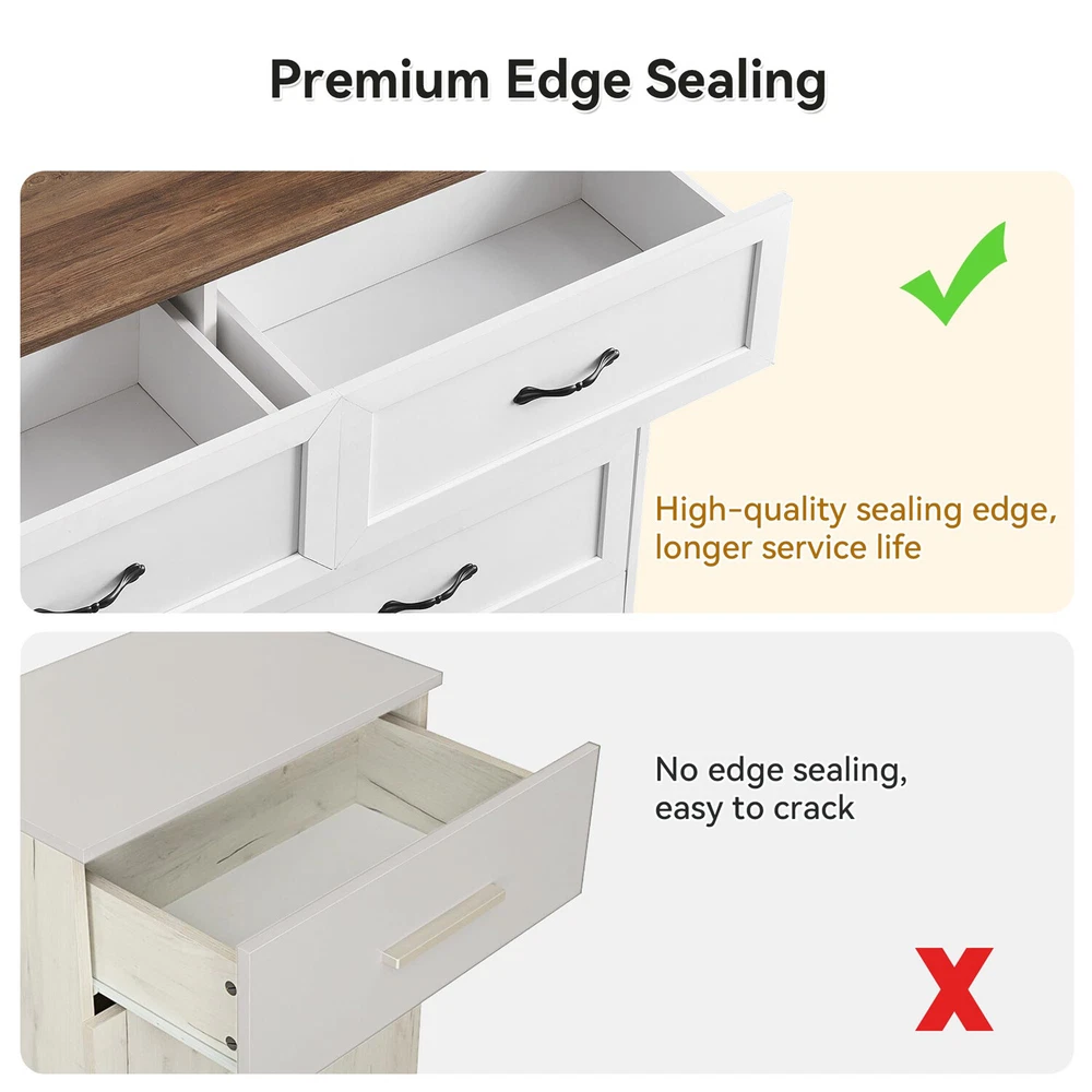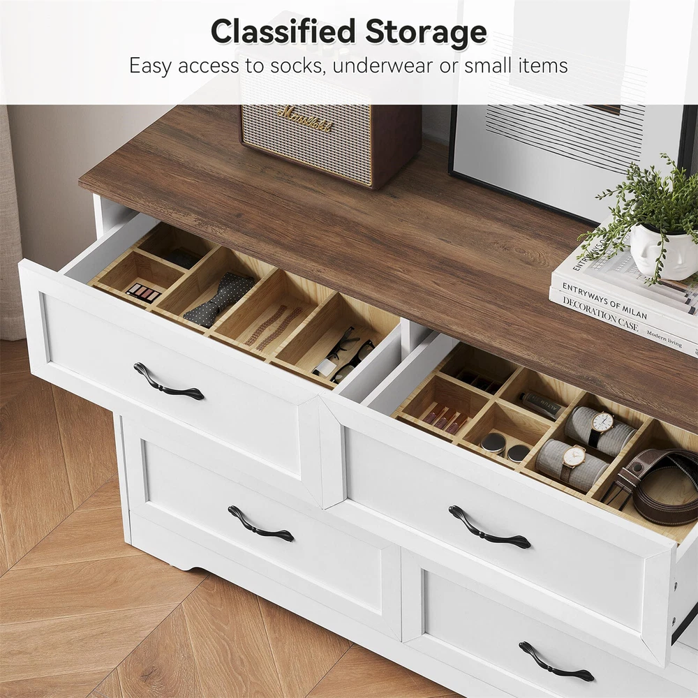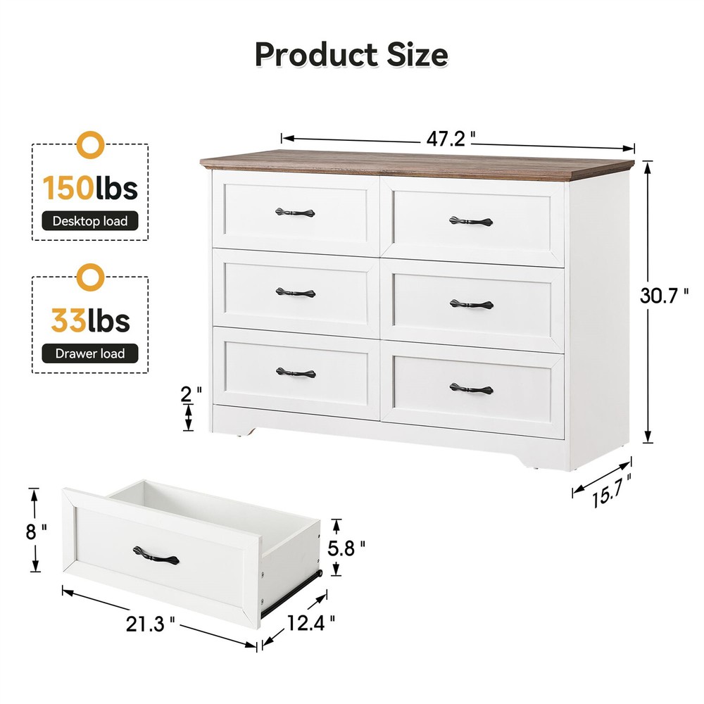 【Spacious Storage Space】 Measuring 47.2" D X 15.7" W 30.7" H.This white dresser features 6 spacious drawers, providing versatile storage for organizing various items such as shirts, underwear, socks, hats, ties, baby essentials, and children's toys. The ample drawer space ensures items are kept sorted and easily accessible, while the spacious top surface is ideal for lamps, decorations, or cherished photos. 【Multifunctional Dresser】This white dresser for bedroom offers various placement options for your room. Beyond serving as a storage cabinet in the bedroom, it can be used as an entryway dresser for daily items and overflow, or even as a TV stand in the living room for odds and ends. With its classic charm and natural white finish, this chest of drawers complements various rooms and settings, adding a timeless touch of elegance. 【Quality Craftsmanship】 This modern dresser is made from high-quality MDF wood with sturdy metal slides. It features a thick, scratch-resistant, waterproof top that’s easy to clean. The reinforced bottom offers excellent stability and strong support for daily use, while the smooth, quiet drawers glide effortlessly on high-quality metal rails, ensuring they stay steady and make no noise during daily use. 【Enhanced Safety Features】 This white 6 drawers dresser includes an anti-tipping accessory for added security. Perfect for households with kids or pets, it keeps the dresser stable and prevents accidental tipping. You can confidently store your items without worrying about safety, ensuring peace of mind and a secure, stylish home. 【Chic and Elegant】 This wooden dresser combines clean, minimalist lines with a chic contrast of white and brown tones, adding visual interest and warmth to any room. The natural white wood grain finish pairs perfectly with vintage-inspired handles, while the arched base offers a soft, elegant touch. Whether in your bedroom, hallway, or living room, this classic design provides ample storage with style that complements any décor. 【EASY ASSEMBLY】This storage dresser is designed with ease of installation in mind. It includes detailed instructions, numbered parts, and pre-drilled holes for accurate and quick assembly, so you can spend less time putting it together. If you have any questions before or after your purchase, feel free to contact us via email. We guarantee a response within 24 hours to assist with any concerns. Product Description Dressers,make your home tidy and neat Versatile Storage Solution: Our dressers offer ample storage capacity and a versatile design suitable for any room, including bedrooms, living rooms, entryways, and home offices, providing practical and stylish storage solutions to keep your space neat and organized. Efficient and Neat Organization: Enjoy a tidy bedroom with neatly folded clothes organized in stylish dresser drawers. With ample storage space, our dressers allow you to sort and classify different types of clothing, accessories, or items, making it easier to find items quickly and efficiently, eliminating the need to hunt through piles of clothes or struggle to find matching items. Multi-Purpose Furniture: Our dressers are not limited to bedrooms; they can be used in living rooms to store extra blankets, pillows, or other items, as well as in entryways to store shoes, handbags, or accessories, providing a handy solution for keeping your home tidy and clutter-free. About GAOMON With a steadfast commitment to delivering high-quality, fashionable, and functional furniture, GAOMON draws inspiration from contemporary living and age-old artisan techniques to create pieces with clean lines and refined details, enriching homes with comfort and elegance. GAOMON is famous for its high-quality materials and exquisite craftsmanship, dedicating to crafting inviting and practical living environments for customers. GAOMON 6 Drawer Dresser Make your home tidy and neat Use this dresser as a closet storage organizer to store seasonal clothes, toys, extra towels, socks, cosmetics, or daily groceries to maximize space in other parts of your home. Color: White and Brown Style: Modern Product Size: 15.75"D x 47.2"W x 30.7"H Drawer Size: 12.4"D x 21.3"W x 5.8"H Max. Static Load Capacity of the Tabletop: 150 lbs Max. Static Load Capacity of Each Drawer: 33 lbs Ample Storage Space This 5 drawer dresser features roomy drawers (12.4"D x 28"W x 5.8"H), perfect for organizing clothing, office supplies, tools, or books. It helps keep your space tidy and essentials easily accessible. Vintage Metal Handle The 5 drawer dresser features vintage-inspired handles that offer both timeless elegance and practical functionality, providing a stylish touch while ensuring easy and comfortable use Smooth-gliding Drawer The drawers are designed with smooth sliding rails, ensuring effortless access and seamless operation for a hassle-free experience. Payment Delivery details Terms of sales About us Contact us Payment We accept payment either via PayPal or any of the following credit cards; Visa, MasterCard, Discover, and American Express. Wishing you a happy life! Delivery details We will provide you with the tracking number on the same day or the next day, and transport your package through UPS, DHL, FedEx and other courier methods. If you have any questions, please feel free to contact me and I will do my best to help you solve the problem. Wishing you a happy life! Terms of sales We offer a one month free return and exchange service, and you don't have to bear any losses. We will provide multiple solutions for you to choose from. If you have any questions, please feel free to contact me and I will do my best to help you solve them. We offer a two-year warranty period. If you have any quality issues with the product you purchased within two years, please feel free to contact me. I will provide you with a free replacement service. If you have any questions, please feel free to contact me. I will do my best to help yo