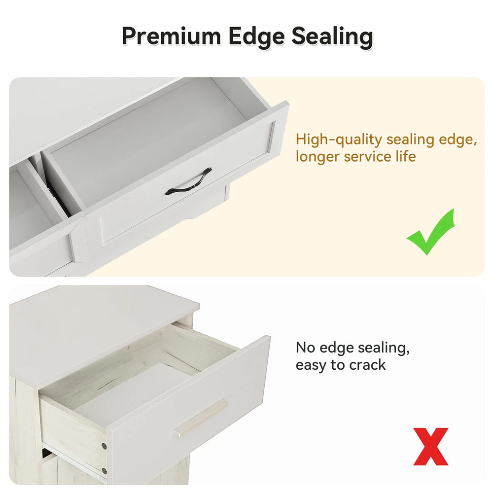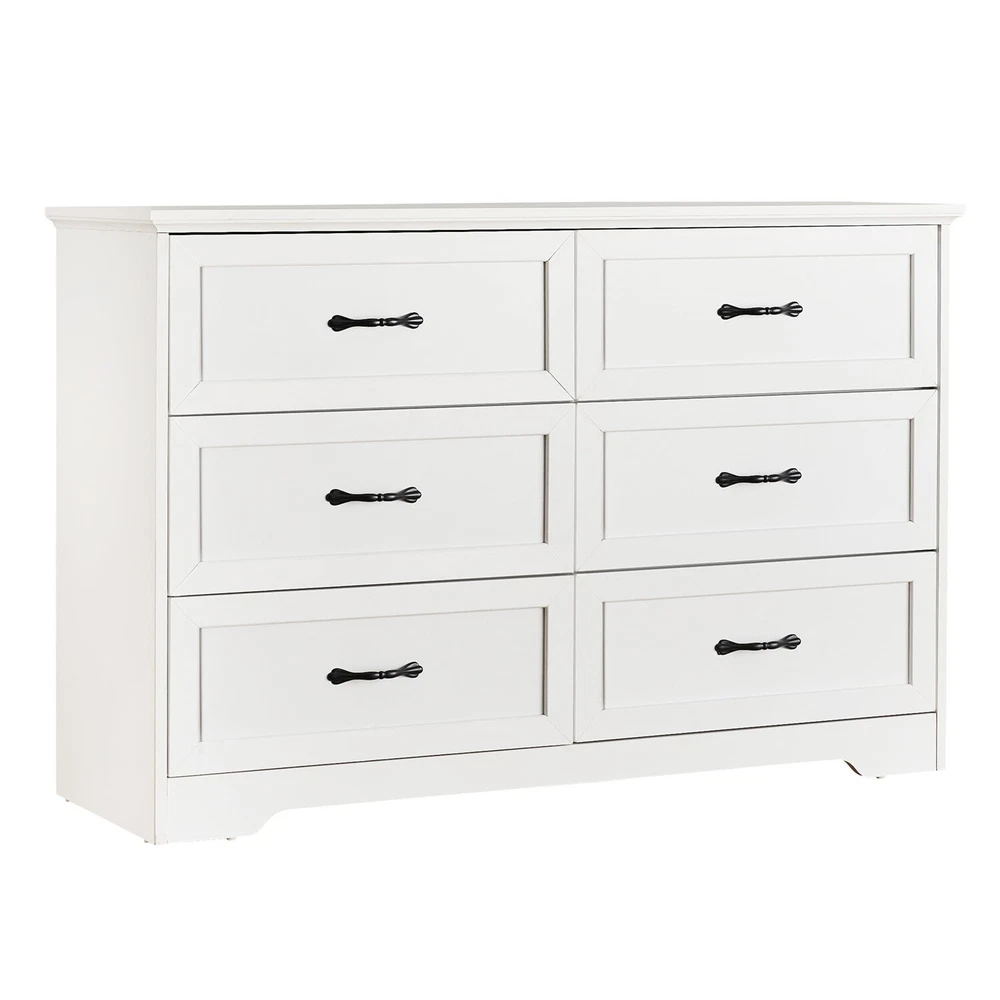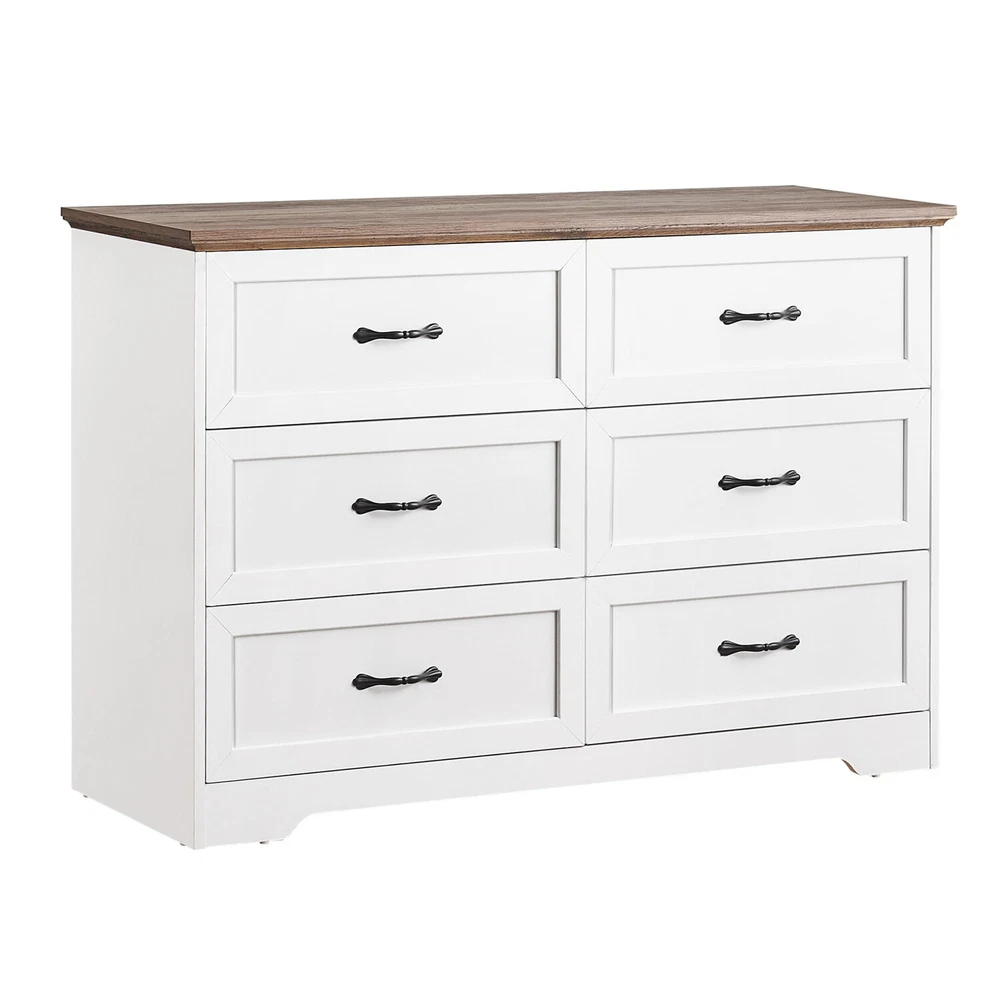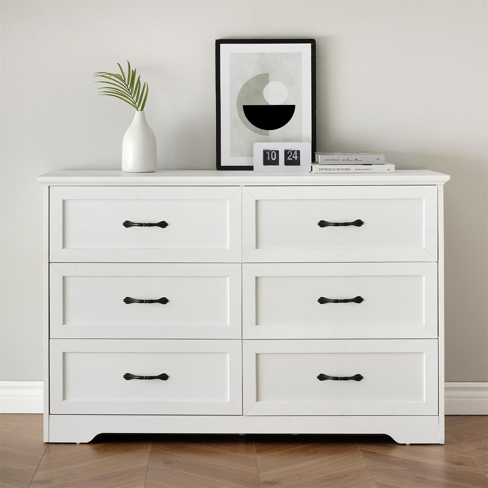 【Spacious Storage Space】 Measuring 47.2" D X 15.7" W 30.7" H.This white dresser features 6 spacious drawers, providing versatile storage for organizing various items such as shirts, underwear, socks, hats, ties, baby essentials, and children's toys. The ample drawer space ensures items are kept sorted and easily accessible, while the spacious top surface is ideal for lamps, decorations, or cherished photos. 【Multifunctional Dresser】This white dresser for bedroom offers various placement options for your room. Beyond serving as a storage cabinet in the bedroom, it can be used as an entryway dresser for daily items and overflow, or even as a TV stand in the living room for odds and ends. With its classic charm and natural white finish, this chest of drawers complements various rooms and settings, adding a timeless touch of elegance. 【Quality Craftsmanship】 This modern dresser is made from high-quality MDF wood with sturdy metal slides. It features a thick, scratch-resistant, waterproof top that’s easy to clean. The reinforced bottom offers excellent stability and strong support for daily use, while the smooth, quiet drawers glide effortlessly on high-quality metal rails, ensuring they stay steady and make no noise during daily use. 【Enhanced Safety Features】 This white 6 drawers dresser includes an anti-tipping accessory for added security. Perfect for households with kids or pets, it keeps the dresser stable and prevents accidental tipping. You can confidently store your items without worrying about safety, ensuring peace of mind and a secure, stylish home. 【Chic and Elegant】 This wooden dresser combines clean, minimalist lines with a chic contrast of white and brown tones, adding visual interest and warmth to any room. The natural white wood grain finish pairs perfectly with vintage-inspired handles, while the arched base offers a soft, elegant touch. Whether in your bedroom, hallway, or living room, this classic design provides ample storage with style that complements any décor. 【EASY ASSEMBLY】This storage dresser is designed with ease of installation in mind. It includes detailed instructions, numbered parts, and pre-drilled holes for accurate and quick assembly, so you can spend less time putting it together. If you have any questions before or after your purchase, feel free to contact us via email. We guarantee a response within 24 hours to assist with any concerns. Product Description Dressers,make your home tidy and neat Versatile Storage Solution: Our dressers offer ample storage capacity and a versatile design suitable for any room, including bedrooms, living rooms, entryways, and home offices, providing practical and stylish storage solutions to keep your space neat and organized. Efficient and Neat Organization: Enjoy a tidy bedroom with neatly folded clothes organized in stylish dresser drawers. With ample storage space, our dressers allow you to sort and classify different types of clothing, accessories, or items, making it easier to find items quickly and efficiently, eliminating the need to hunt through piles of clothes or struggle to find matching items. Multi-Purpose Furniture: Our dressers are not limited to bedrooms; they can be used in living rooms to store extra blankets, pillows, or other items, as well as in entryways to store shoes, handbags, or accessories, providing a handy solution for keeping your home tidy and clutter-free. About GAOMON With a steadfast commitment to delivering high-quality, fashionable, and functional furniture, GAOMON draws inspiration from contemporary living and age-old artisan techniques to create pieces with clean lines and refined details, enriching homes with comfort and elegance. GAOMON is famous for its high-quality materials and exquisite craftsmanship, dedicating to crafting inviting and practical living environments for customers. GAOMON 6 Drawer Dresser Make your home tidy and neat Use this dresser as a closet storage organizer to store seasonal clothes, toys, extra towels, socks, cosmetics, or daily groceries to maximize space in other parts of your home. Color: White and Brown Style: Modern Product Size: 15.75"D x 47.2"W x 30.7"H Drawer Size: 12.4"D x 21.3"W x 5.8"H Max. Static Load Capacity of the Tabletop: 150 lbs Max. Static Load Capacity of Each Drawer: 33 lbs Ample Storage Space This 5 drawer dresser features roomy drawers (12.4"D x 28"W x 5.8"H), perfect for organizing clothing, office supplies, tools, or books. It helps keep your space tidy and essentials easily accessible. Vintage Metal Handle The 5 drawer dresser features vintage-inspired handles that offer both timeless elegance and practical functionality, providing a stylish touch while ensuring easy and comfortable use Smooth-gliding Drawer The drawers are designed with smooth sliding rails, ensuring effortless access and seamless operation for a hassle-free experience. Payment Delivery details Terms of sales About us Contact us Payment We accept payment either via PayPal or any of the following credit cards; Visa, MasterCard, Discover, and American Express. Wishing you a happy life! Delivery details We will provide you with the tracking number on the same day or the next day, and transport your package through UPS, DHL, FedEx and other courier methods. If you have any questions, please feel free to contact me and I will do my best to help you solve the problem. Wishing you a happy life! Terms of sales We offer a one month free return and exchange service, and you don't have to bear any losses. We will provide multiple solutions for you to choose from. If you have any questions, please feel free to contact me and I will do my best to help you solve them. We offer a two-year warranty period. If you have any quality issues with the product you purchased within two years, please feel free to contact me. I will provide you with a free replacement service. If you have any questions, please feel free to contact me. I will do my best to help yo