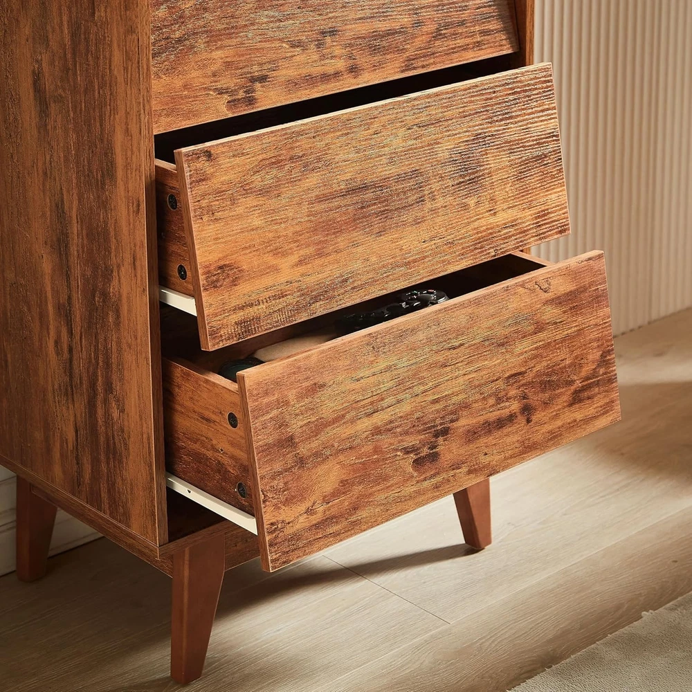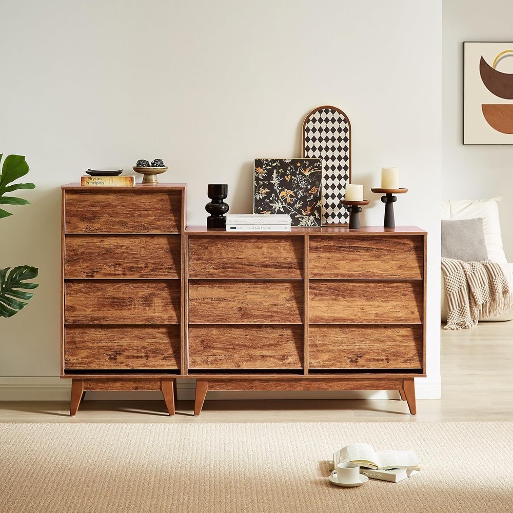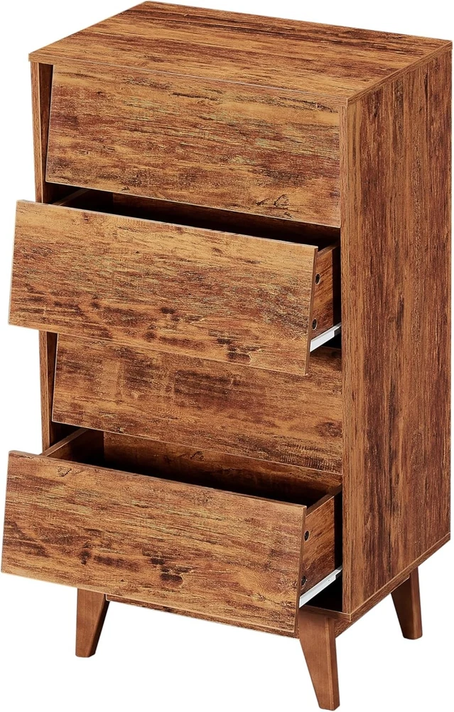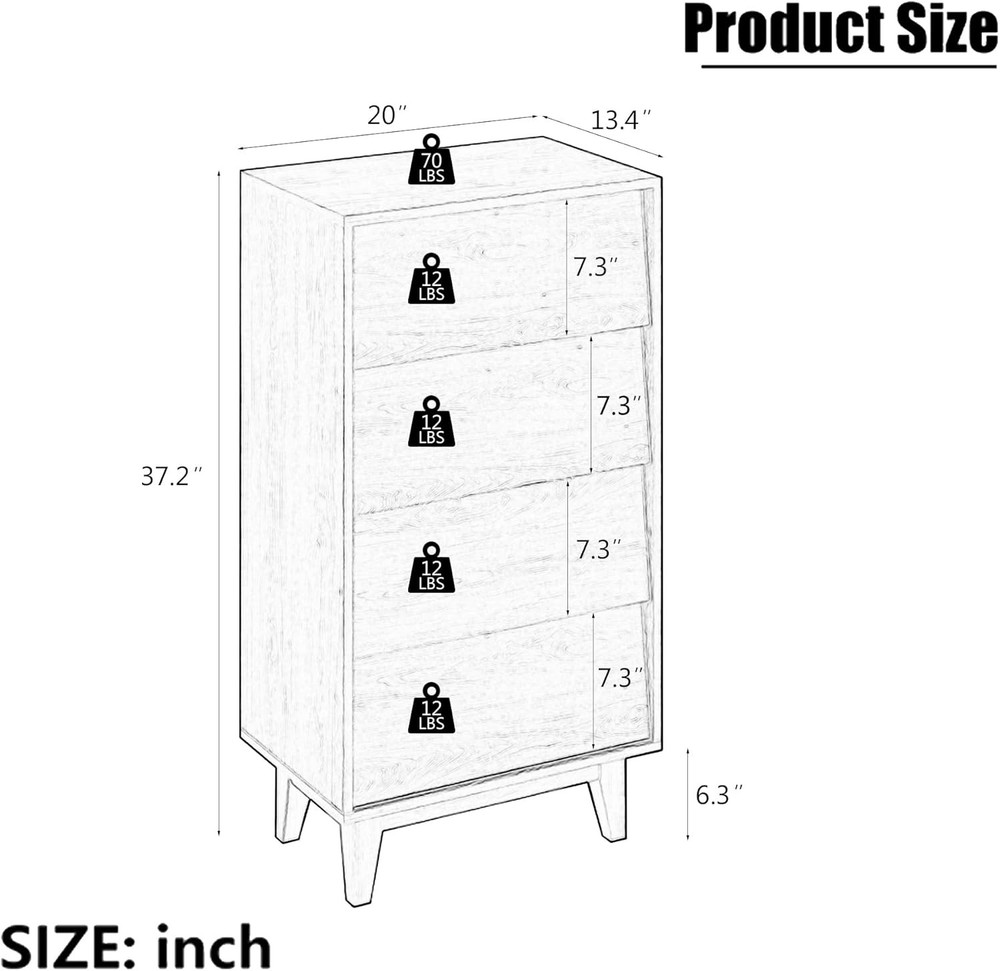 Product Description Specification 4 Drawer Double Dresser Features Vintage-style and Bevel Design Main Color:Black Main Material:MDF Product Dimensions Assembled Length (in.):19.90 Assembled Width (in.):13.40 Assembled Height (in.):37.00 Weight (lbs.):44.50 Package Size Length (in.):34.50 Width (in.):16.50 Height (in.):7.50 Weight (lbs.):47.00 Product Features [Multi-funtional 4 Drawer Dresser]-- Size: 19.9” W ×13.4” D ×37” H; Featuring 4 deep drawers dresser, easy to store your t-shirt, socks, or trousers and so on. Freeing up more space for the bedroom! This refined dresser provides plenty of storage space for your child’s nursery, bedroom, or playroom. [Unique Design]-- The wide 4-drawer dresser features vintage-style and bevel design, hidden drawer pulls, and the legs are solid wood for more stability. [Sturdy Dresser]-- The dresser panel is made of high quality MDF, the legs of the dresser are made of solid wood. which make this wooden dresser scratch-resistant and wear-resistant. [Multipurpose Usage]-- Smooth metal runners on each drawer, easy to push and pull. This Double dresser perfect for as storage dressers organizer in bedroom or living room. Also it can be as chest of drawers in the Hallway. [Assembly Required]-- Coming with detailed instruction and all parts and tools are included in package. Any problems or suggestions will be deal with by our professional customer service team. Bevel Design-- The bevel design is unique and full of vintage style, not only easy to push and pull, but also increase a art to your room and free your life from messy and disorder. On Aug 6, 2025 at 23:06:16 PDT, seller added the following information: