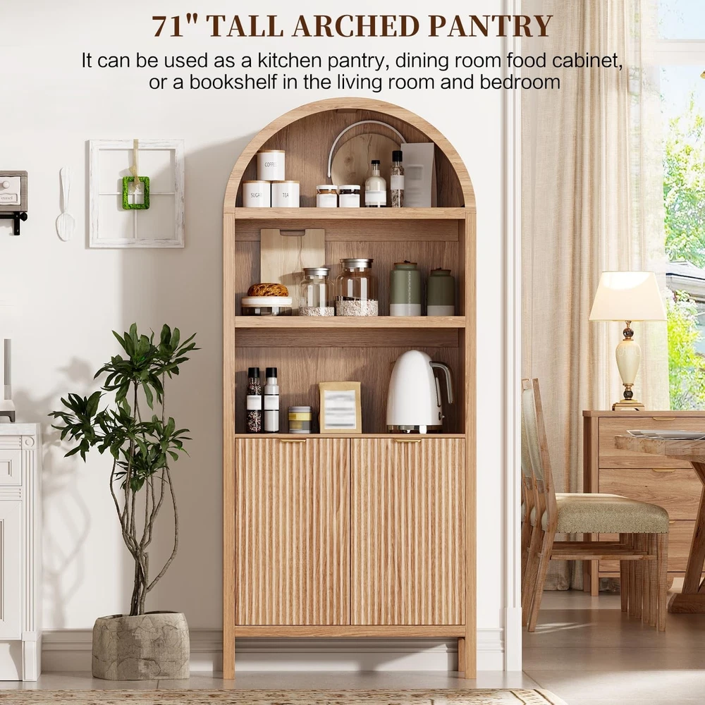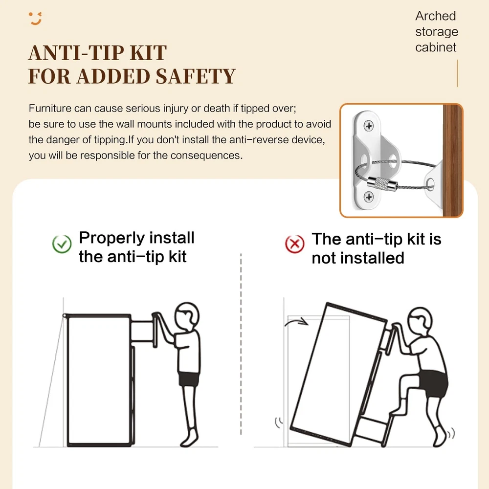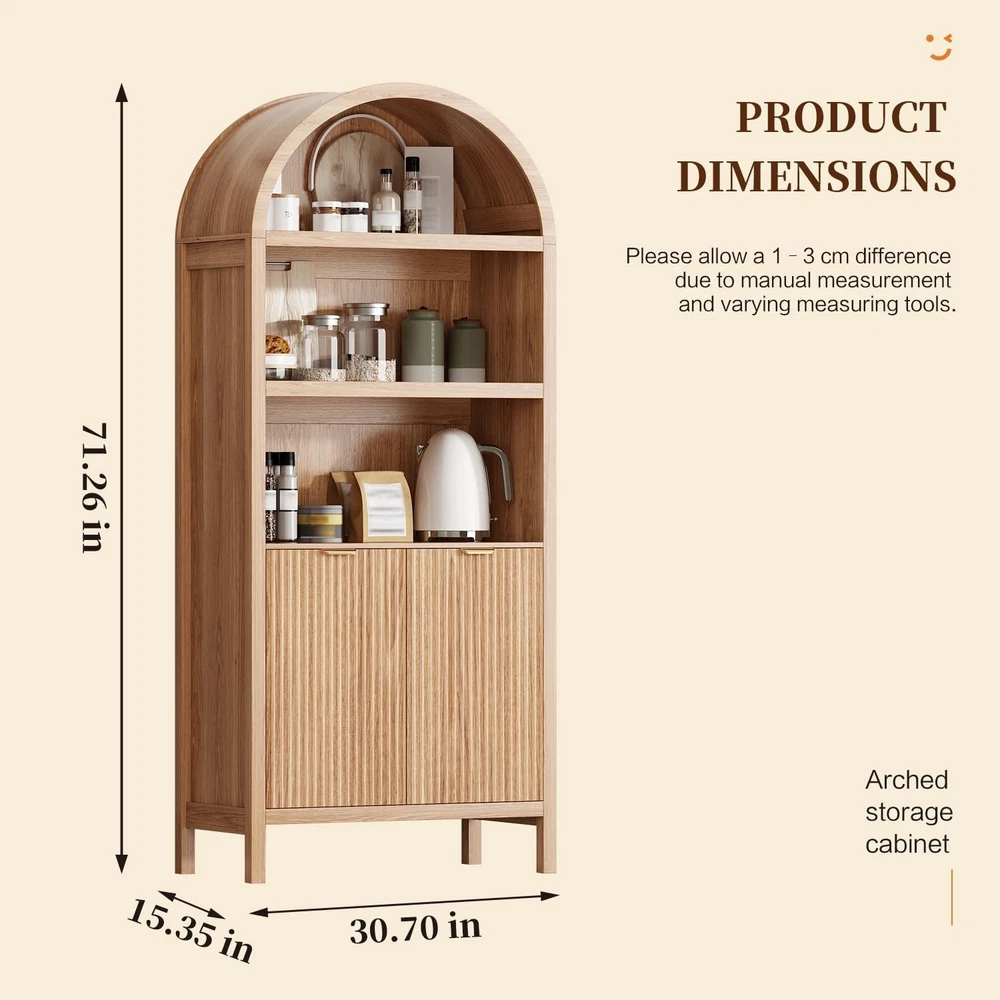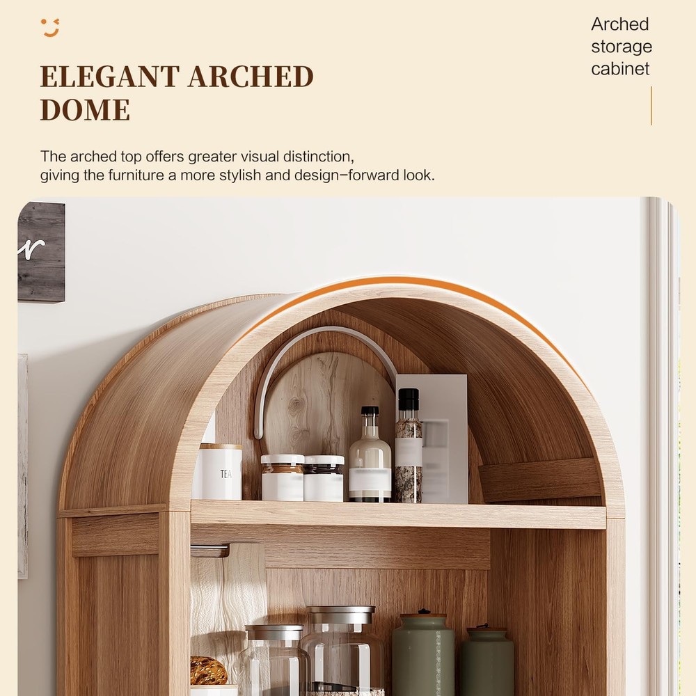 【Sturdy Construction & Scratch-Resistant】This versatile dining cabinet combines durability and style, featuring a reinforced MDF wooden frame and a sturdy build. Measuring 71.26"H × 30.7"W × 15.35"D, it fits seamlessly into kitchens, dining rooms, or living rooms. The elegant arched panels add a modern farmhouse charm while providing ample vertical storage space. Finished with a scratch-resistant surface, this cabinet is not only beautiful but also practical. It serves as both an efficient organizational hub and an attractive focal point in your home. 【Arched Design for Timeless Elegance】The beautifully arched design of this cabinet is not just a striking aesthetic feature, but also a testament to its timeless appeal. The graceful curves of the arch create a sense of openness and flow, making it a captivating focal point in any room. This design brings a touch of vintage farmhouse charm while maintaining a modern, sophisticated look, effortlessly complementing a range of interiors—from contemporary to French country or luxury styles. 【Easy to Assemble】Designed for hassle-free assembly, this freestanding display cabinet comes with all the necessary accessories, clearly numbered components, and detailed step-by-step instructions (a comprehensive instruction manual is included in the packaging). If you need assistance, our dedicated support team is ready to help. 【Sturdy Construction & Scratch-Resistant】This versatile dining cabinet combines durability and style, featuring a reinforced MDF wooden frame and a sturdy build. Measuring 71.26"H × 30.7"W × 15.35"D, it fits seamlessly into kitchens, dining rooms, or living rooms. The elegant arched panels add a modern farmhouse charm while providing ample vertical storage space. Finished with a scratch-resistant surface, this cabinet is not only beautiful but also practical. It serves as both an efficient organizational hub and an attractive focal point in your home. 【Adjustable Shelves 】Enhance your kitchen organization with this thoughtfully designed storage cabinet that strikes the perfect balance between accessibility and concealed storage. It comes equipped with 2 open shelves, ideal for displaying books or storing pantry essentials, 1 adjustable hidden shelf for cutting boards or baking sheets. The open compartments keep everyday items conveniently within reach, while the enclosed spaces protect delicate dishware from dust. 【Anti-Tip Safety Design】This cabinet is equipped with the anti-tip kit to enhance structural stability and reduce wobbling, ensuring it stays perfectly balanced even on uneven floors. Ideal for homes with children or pets, it provides added safety by preventing accidental tipping. Combining durability with stylish design, this storage solution not only delivers long-lasting performance but also complements your home decor, offering both function and peace of mind.