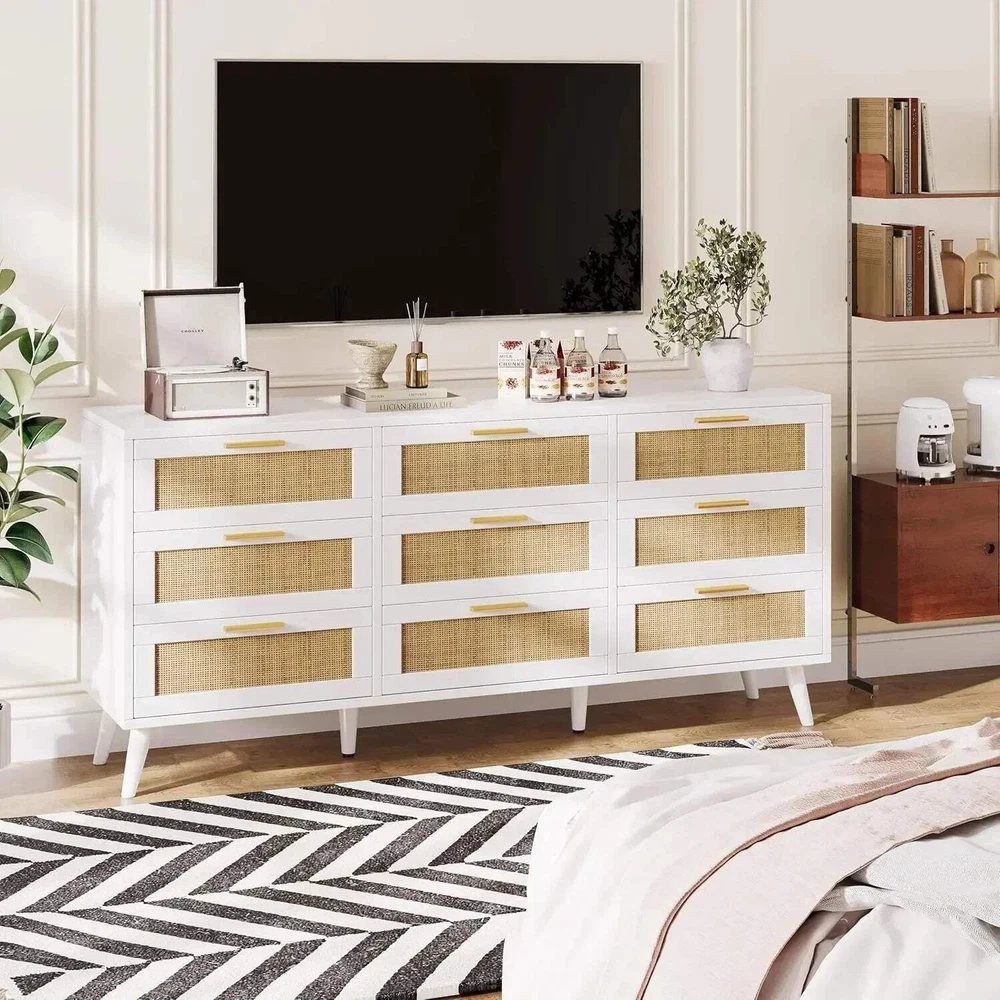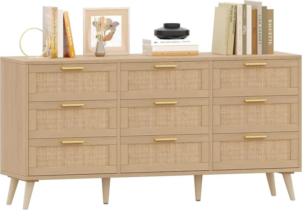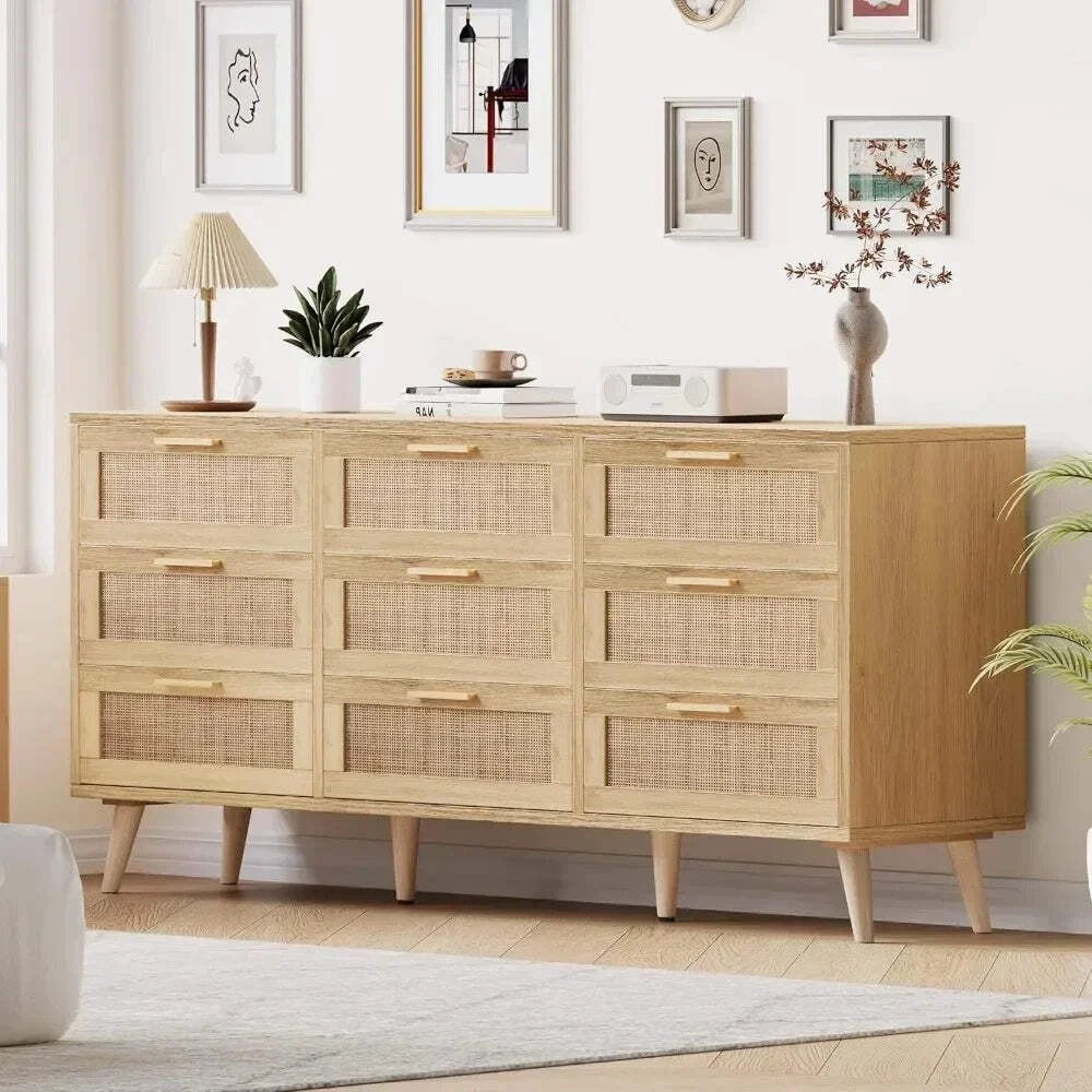 Modern 9-Drawer Double Dresser Rattan Chest for Bedroom Storage