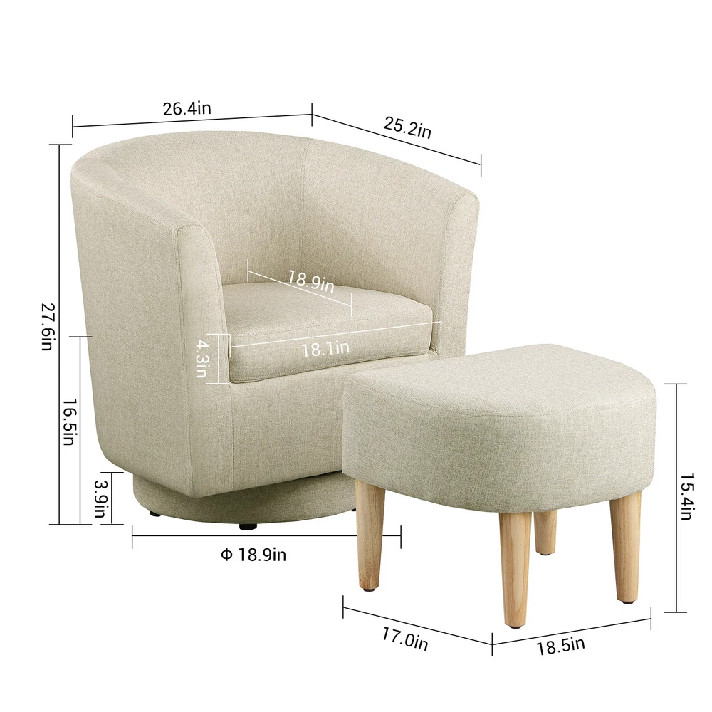 Modern Accent Swivel Armchair Fabric Single Sofa w/Ottoman Chair for Living Room Features: Comfortable Stylish Modern Swivel Accent Chairs with Ottoman: DAZONE modern comfy accent swivel chair with tub barrel style backrest makes you relieve your tiredness, makes a perfect addition to your living room, bedroom, den, recreation area, guestroom, waiting room small spaces apartment, office or studio. Sturdy Barrel Chair with Ottoman: This DAZONE accent chair for living room make of solid wood legs, soft sponge and sturdy wooden frame to ensure durability and stability of this reading chair The heavy duty 360-degree swivel base features Made of high-quality iron with steel beads accent base detail & allows great flexibility in the home. Upholstered accent swivel chair for bedroom: Ergonomically designed soft armrest, comfortable and breathable sherpa fabric of this DAZONE accent sitting chair to enjoy your comfy modern club chair style in your space and adds a touch of beauty to your home Easy to Install Living Room Chairs: It is esy to set up this small comfy corner chair within minutes. Simple assembly is required. Only need to screw the solid wood legs to DAZONE arm chair with bare hands and done Size & Load Capacity of this sherpa Chair and Ottoman Set: 26.4"(L)"*25.2"(W)*27.6"(H) ; ottoman:18.5"(L)*17"(W)*15.4"(H) ; Iron Plate Size:7.87"(L)"*7.87"(W)*0.79"(H), and weight capacity: 330 lbs. Please note it. Specification: Color: Beige Leg Material: Solid Wood Frame Material: Solid Wood Style: Curved Back Barrel Swivel Chair with Ottoman Chair with Ottoman Material: Iron + Wood + Sherpa fabric +Sponge Assembly Required: Yes(only Ottoman leg) Seat Depth:19.1" Seat Height:18" Weight: 46 lbs Curved Backrest Chair: 26.4"(L)"*25.2"(W)*27.6"(H) Ottoman: 18.5"(L)*17"(W)*15.4"(H) Iron Plate Size: 7.87"(L)"*7.87"(W)*0.79"(H) Weight capacity:330lbs Package Included 1* Swivel Accent Chair with Ottoman Set Contact us: Payment: Shipping: Warranty Return Contact us: We have always been trying to provide the best service and reliable products for every customer, however, accident may happen sometimes, please contact us to resolve any issue before leaving a negative feedback. Payment: 1. All payments must be prepaid before shipping. 2. We only accept payment via PayPal. Please kindly check if you can do the payment via PayPal before placing an order. Shipping: 1. Item will be shipped same business day if paid 4 pm EST 1 pm PDT (except weekends and holidays) and shipped from US. 2. Orders from the United States will all be shipped out via starnding shipping or economy shipping. The shipment usually takes 3-7 business days(Saturday and Sunday excluded), if you need the item urgently, please contact us for detail before purchase. Orders from overseas will be shipped via DHL Express, 3-5 business days. 3. Local pick up is not available. Warranty . The warranty shall not apply to the following circumstances: a) Damage caused by undue wear&tear, misuse, improper installation or operation, neglect, accidents. b) Damage caused by natural disasters, flood, fire, lightning or pollution. c) If item was opened, any parts removed or repaired by any unauthorized person. Return (1).We stand behind our items and offer 60 days warranty. All items are in brand new condition unless specified otherwise elsewhere in the description. (2).All returns - defective or otherwise - have to be preauthorized. Please contact us to get an authorization and returning address before sending the item back.If an item is returned because of an undeliverable shipping address, buyer agrees to pay the cost for re-shipment. (3).Please note that If the return/replacement is not a result of our mistake (not defective or wrong item), the buyer is responsible for return shipping, as well as a 20 percent restocking fee. (4).Replacement or refund will be made upon receipt of the returned item. If you do not want to wait for the replacement, you can just reorder one and then send the first one back for a refund.