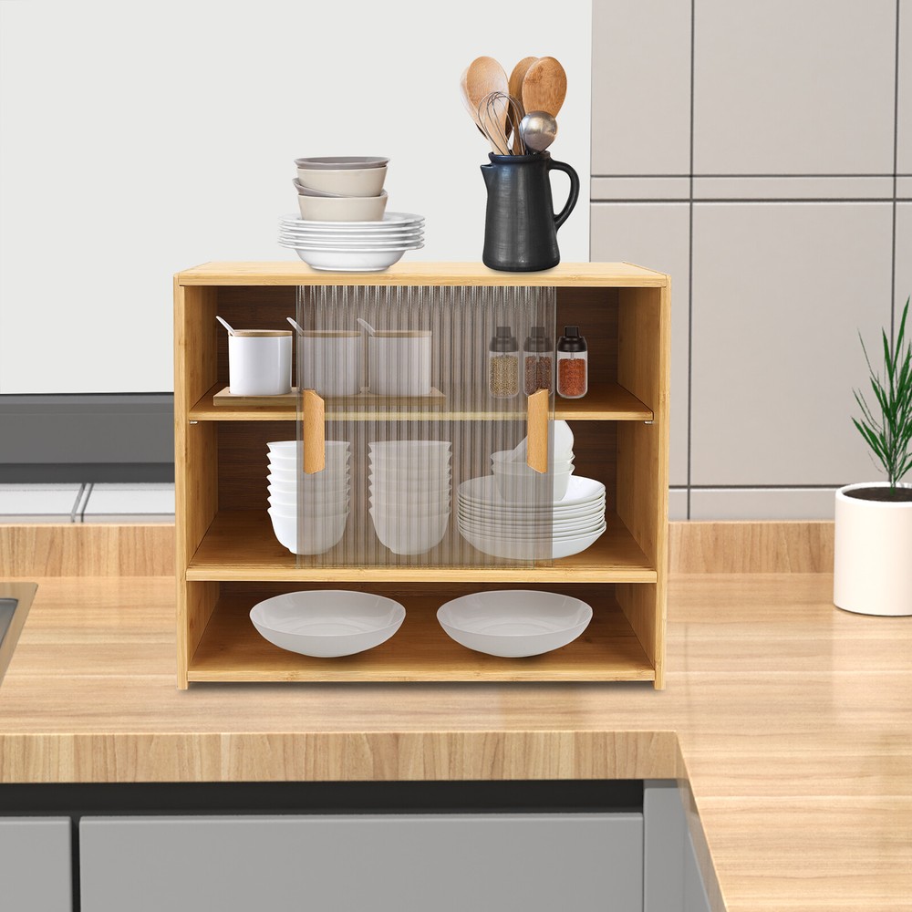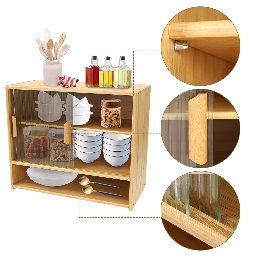Specification Material: Bamboo, Glass, Laminated Board Color: Log-colored Process: Painting Style: Modern Shape: Rectangular Assembly Required: Yes Number of Tiers: 3 Installation Type: Desktop Installation Maximum Load Per Tier: About 15kg/33.06lbs Product Size: 55*28*46 cm/ 21.6*11*18.1 in Cabinet Door Height: 30cm/11.8in First Tier Height: 10cm/3.9in Second Tier Height: 15cm/5.9in Third Tier Height: 14cm/5.5in Package Included 1 * Small Bamboo Kitchen Pantry Sideboard All Accessories for Installation 💖 Fast Shipping & High Quality 💖 Description Storage cabinets are an integral part of our lives. Whether it's in your home, office, or campground, storage cabinets play a vital role. Our small bamboo kitchen pantry sideboard is designed with three shelves and two-way sliding doors to keep your belongings organized and provide a simple living experience. It can be adapted to any home style and adds elegance to your room. Specification Material: Bamboo, Glass, Laminated Board Color: Log-colored Process: Painting Style: Modern Shape: Rectangular Assembly Required: Yes Number of Tiers: 3 Installation Type: Desktop Installation Maximum Load Per Tier: About 15kg/33.06lbs Product Size: 55*28*46 cm/ 21.6*11*18.1 in Cabinet Door Height: 30cm/11.8in First Tier Height: 10cm/3.9in Second Tier Height: 15cm/5.9in Third Tier Height: 14cm/5.5in Package Included 1 * Small Bamboo Kitchen Pantry Sideboard All Accessories for Installation Key Features High-quality Material: This product is made of high-quality bamboo, glass, and laminated board, with high hardness, high abrasion resistance , strong pressure resistance , and long service life. Beautiful and Generous: Bamboo cabinet combines beauty and practicality in one. The glass door adopts a vertical strip-type pattern, making it transparent and with a hazy aesthetic. It blends well with all styles of home décor, adding a touch of rustic elegance to your space. Multiple Layouts: The three-tier design and open platform (21.6*11 inches) provide ample storage space to meet your various storage needs. High Stability: The sturdy rectangular structure provides stability and durability to the product. With uniform force, each tier can easily hold 33.06 lbs of goods. Easy to Clean: The smooth surface and simple product structure make it easy to clean. You just need to wipe it with a wet rag. Easy to Install: The simple product structure, a detailed electronic English manual, and complete installation parts allow you to install it quickly and accurately. Thoughtful Design: The removable laminate can be adjusted up and down by 2.76 inches to accommodate different sizes of cookware, thus providing more convenience for your storage. Space-saving: The bi-directional sliding doors are designed with smooth tracks that open and close smoothly and do not take up space in the aisle. Dustproof : Seamless laminate backs and glass doors provide effective dust proofing to keep cookware clean and tidy. Details Wooden Handles: The wooden handles are comfortable to hold and make sliding the glass door easier. Smooth Edges: The rounded edges are smooth and flat, avoiding accidental scrapes and making it safer to use. Application The product can be used in kitchens, bathrooms, bedrooms, and living rooms, and also as bedside cabinets, sideboards, storage cabinets, etc. Notes 1. Bamboo wood products are from natural materials, inevitably there will be different textures, bamboo knots, bamboo halos, bamboo gaps, bamboo spots, and other phenomena, which will not affect the beauty and use. 2. Please do not use corrosive cleaning agents or hard objects to clean, it is recommended to use a soft cloth to wipe. 3. Bamboo wood products should not be placed in the sun for a long time to avoid cracking and deformation, and should not be placed in a dark and humid place for a long time to avoid mildew. 4. Please keep accessories away from babies, children, and pets during installation. 5. Please allow the slight color difference caused by the shooting light and the 1-3 cm error due to manual measurement, and make sure you do not mind before ordering. Payment Delivery details Terms of sales About us Contact us Payment We accept ebay payment 。 Fees such as import duties, taxes are not included in the item price or shipping costs. These charges are the buyer's responsibility. Delivery details Shipping: 2-9 working days to: USA Terms of sales We maintain high standards of excellence and strive for hundred percent customer satisfaction. Feedback is very important to us. We hope that you contact us immediately before you give neutral or negative feedback, so that we can address your concerns. It is impossible to address issues if we do not know about them! About us Your satis faction is our ultimate goal. We work hard to earn your trust and future business. Our certified technicians have tested each item before shipping. The unit comes with 1 year limited warranty on all manufacturing defects. a) If you receive a defective item, you may return it or ask for a discount. Please contact us within 14 days after you receive the package. b) What you returned must be intact and in its original packaging as re? u. Customer is responsible for shipping costs of the returned item. c) We will cover the cost of shipping back t with the shipping rate indicated in the registration page. We will send you a new unit or refund the full payment you paid. Thank you. Contact us Business Hour Business Hour: Monday To Friday: 8:30 AM to 5:00 PM (Beijing China time) Due to time zones, our reply to your questions may not be immediately. But within above working time, we will reply your email within 24 hours. If it's non-workdays, please kindly be patient and wait till Monday. Please contact us with ebay message. Please feel free to contact us if you have any questions. Monday To Friday: 8:30 AM to 5:00 PM (Beijing China time) Due to time zones, our reply to your questions may not be immediately. But within above wor