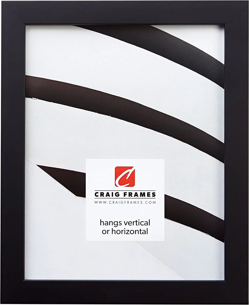 Contemporary style; black; smooth composite finish Frame includes: glass, rigid black backing and pre-attached stamped hanging hardware Frame holds a 8 inch by 10 inch photo/print (viewable area reduced by 1/4 inch on each side due to frame lip) Frame moulding is .875 inches wide; solid wood construction Frame is designed for WALL HANGING only (hanging hardware allows for portrait or landscape orientation) Product Description Craig Frames American-made & Trusted for Over 30 years Craig Frames offers hundreds of styles and sizes. Our products include picture frames, poster frames, photo frames, collage frames, document frames, framed maps, matting, bulletin boards, & more. A Trusted Brand & US Manufacturer Offering a Vast Selection of High Quality Home Décor Products Enjoy a vast selection of highly rated, affordable, professional quality picture frames and poster frames for wall hanging or table top use. Craig Frames also offers 2-Packs & 4-Packs for gallery wall sets, large art projects, or wholesale purchases. Styles include Modern, Rustic, Farmhouse, Boho (Bohemian), Ornate, Metallic, Weathered & Distressed, and more. Most frames are available in 30+ popular sizes, and many are available in 500+ custom frame sizes. With more than 45,000 Seller Ratings, thousands of customers continue to enjoy our American-made picture frames for their home décor projects. Living room, bathroom, kitchen, bedroom, nursery, or office; we're confident you'll find the perfect style and size for your decorative project or business needs. Visiting our Brand Store provides a simple, well organized, way to discover framing solutions for every project or occasion. (Click 'Visit the Craig Frames Store' above) Exceptional Value, Selection, Quality, and Service Styles Available Modern, Farmhouse, Contemporary, Rustic, Boho, Antique, Ornate, Weathered, Distressed, Metallic, Natural, & More Sizes Available Most frames are available in 30 or more popular picture frame sizes. 500+ custom frame sizes available in some styles.. Occasions Birthday, Mother's Day, Father's Day, Christmas, Graduation, Baby Shower, Home Renovation, Off to School, & More. Quality American-made in Michigan by professional framers with materials sourced primarily in the USA. Reputation More than 45,000 seller reviews supporting our quality craftmanship and service. Service US based support team providing real-time service & solutions What Customers are Saying "Excellent service, safe packaging." "Actually arrived ahead of estimated delivery date" "Perfect frames for my antique posters! Very nice." "Amazing, better than I had envisioned." "Well packaged and arrived on time in perfect condition" "Sturdy, very well made frames." "Thank you for sending this so fast! It is just what I wanted."
