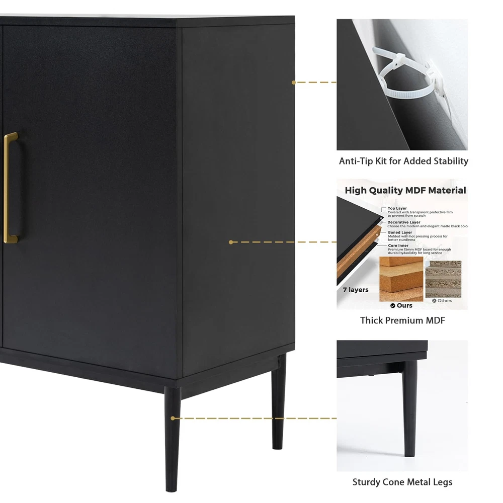 2 door storage cabinet will be home art design and multi-purpose combination, make your life delicate and convenient. This black wood storage cabinet fits nicely with any decor and can be used in the bedroom, dining room, or living room to create stylish additional storage. It is not only a practical piece of furniture, but also a modn decoration of the room. You can put books, duvet covers or toys inside the wooden cabinet, make your space organized and comfortable. 【Larger Storage Space】The credenza has 2 widened and enlarged shelves provide spacious storage space for your daily storage. You can also buy two storage cabinet to form together. Used to store organizing for your trivial sundries and meet your storage needs in every possible way. Product Dimensions:15.7"D x 31.1"W x 31.5"H. 【P2-grade Materials】This buffet cabinet with storage is made of thick premium MDF wooden, scratch-resistant and water-resistant, easy maintenance and clean. Also have undergone multiple tests of strict selection and load-bearing, so you can rest assured that you will have years of use. 【Modern Design】Accent cabinet with gold handle and black legs improve more modern style to your room. Anti dumping device on the back of the sideboard cabinet to ensure the safety of kids or pets. A waterproof desktop will perfectly for you to display your favorite decorations and collectibles. 【Multifunctional Cabinet】Sideboard and buffet with storage provides solid stability for ample load bearing and spacious storage space. The entryway cabinet can be used as a perfect black accent cabinet for your bedroom, hallway or as a TV stand for the living room. Also you can use it as coffee bar or office storage in your room. 【Assembly with Clear Instruction & Customer Support】We are equipped with accurate installation instructions for assembly. It is recommended that two people install this buffet cabinet together. If you have any questions, we will reply to you within 24 hours and we won't let our customers down.