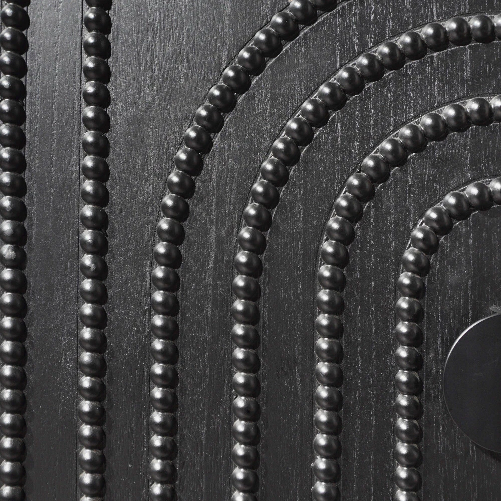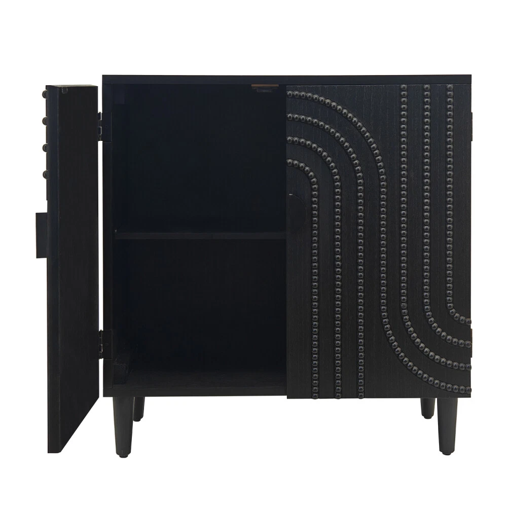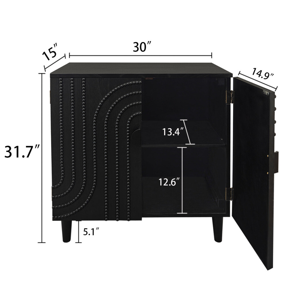 Spacious Storage - Two-tier shelving with13.4in upper shelf and 12.6in lower shelf provides ample room for organizing essentials. Compact & Stylish - Measuring 30in (W) x 15in (D) x 31.7in (H), this cabinet is perfect for small spaces while offering generous storage. Decorative Embossed Design - The round wood beads on the door adds a unique, modern aesthetic. Durable & Sturdy - Crafted from high-quality manufactured wood with strong solid wood legs (5.1in height) for stability. Versatile Placement - Ideal as an accent cabinet, sideboard, nightstand, or entryway storage unit. Easy Assembly - Comes with simple instructions for hassle-free setup. Modern Black Accent Cabinet With 2 Doors Enhance your home with this stylish and functional storage cabinet. Whether used in the living room, bedroom, or hallway, it offers both beauty and practicality.