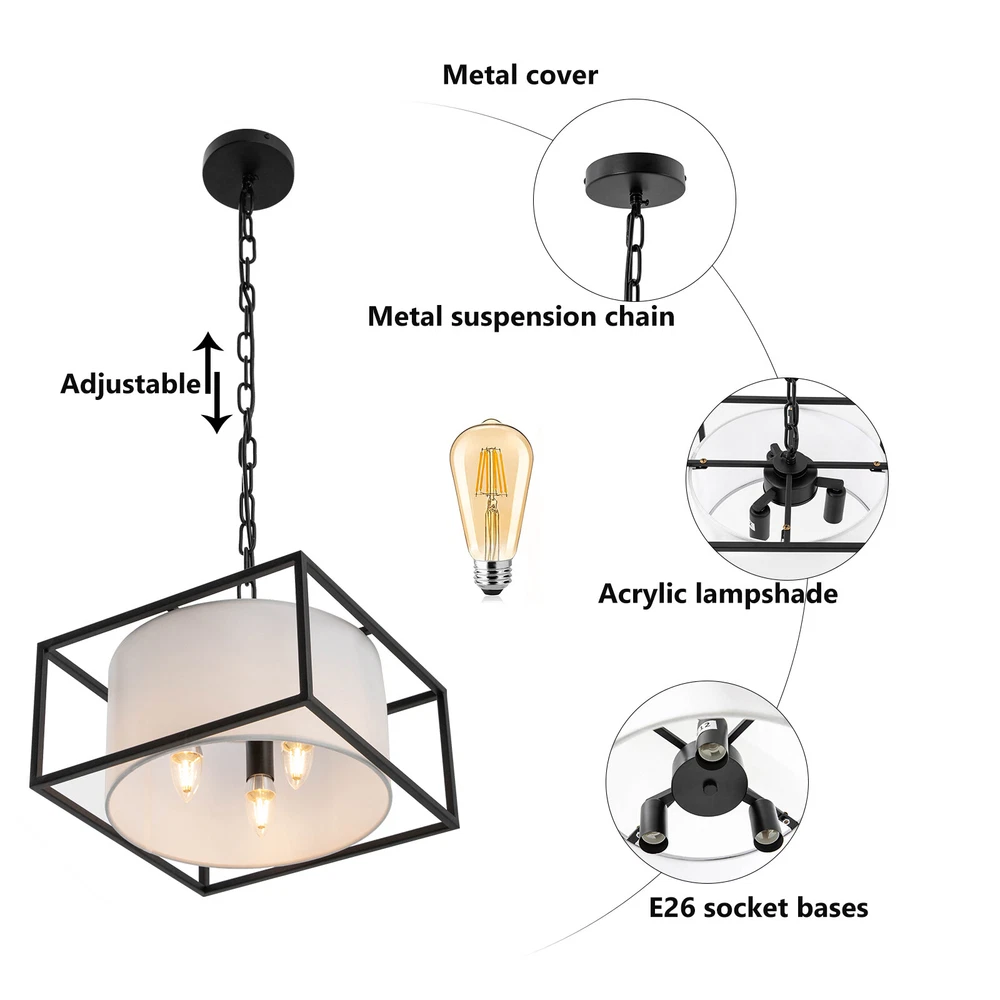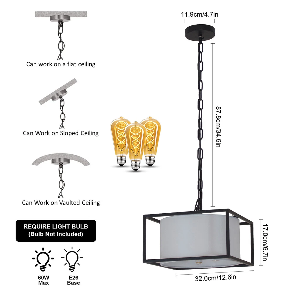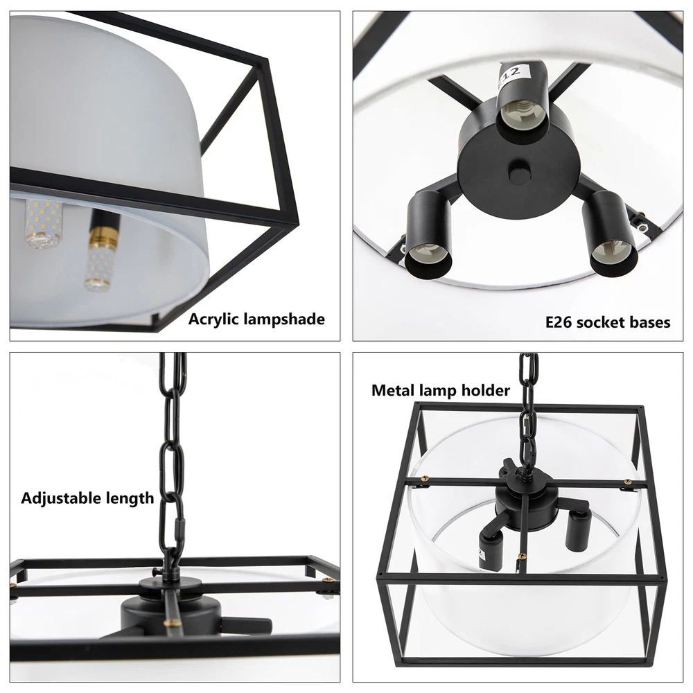 Modern Ceiling Light with Acrylic Shade Black, Industrial Close to Ceiling Light Description Pendant light is an integral part of home decor, providing not only essential lighting, but also adding a beautiful visual effect to the room. In the living room, an atmospheric pendant light can bring a sense of elegance and nobility to the entire space, while in the bedroom, a soft one creates a warm and comfortable atmosphere for your resting environment. On any occasion, it can add more goodness to life. Key Features Bright&Soft Lighting: The semi-open light can be equipped with 3 standard E26 bulbs to emanate a beautiful and luminous radiance and illuminate the entire area( 53.8-215 ft² ) , while the Acrylic lampshade also provides soft light without affecting the effect. Flexible Chandelier: Designed with slings, you can adjust the overall height of the lamp within 34.6in to fit your ceiling height and convert it to semi-embedded ceiling lights or suspended chandeliers. Strong Durability: This pendant lamp is made of high-quality Acrylic lampshade and iron, and has been treated with high-temperature baking paint. It is firm, rust-proof, and will not change color even if it is used for a long time. Home Decor: Featuring a black rectangular frame and white lampshade, it boldly combines classic refinement with modernity, and imparts a classic vintage vibe, along with a sleek and contemporary feel, to your surroundings. And can fit industrial, vintage, rustic, and modern style homes. High Stability: The 4.7 inch iron circular base increases stress area, and can make the product fixed firm without falling easily. Protective Packaging: In order to prevent the product from being damaged during transportation as much as possible, this product uses custom foam that can effectively resist normal compression and drops. Easy to Clean: The detachable design and smooth surface make it easy to clean. You only need to use a towel to completely wipe off the dust and dirt. Simple Installation : You just need to connect the steel wire ropes on the ceiling lamp with the chassis, and then connect the wire reserved on the ceiling and the lamp chassis to install this product. Details Semi-enclosed Bottom Opening: The semi-enclosed bottom opening allows for convenient installation or change of the bulbs. Standard Lamp Holder: With a standard E26 lamp holder, it is compatible with various E26 bulbs to facilitate the replacement of bulbs. Application It is suita ble for a kitchen island, dining room, entryway, stairway, cafe, club, bar, restaurant, and library of 53.8-215 ft² . It is compatible with a variety of Edison, CFL, or LED light bulbs, and is compatible with different types of ceiling designs, such as arched ceilings, sloping ceilings, and flat ceilings. Specification Color: Black Material: Iron, Acrylic Style: Modern, Industrial Surface Treatment: High-temperature Baking Paint Voltage: AC 110V-120V Power: Max. 40W Light Source: 3* E26 Bulbs (Not Included) Efficiency: E Mount Type: Ceiling Mount Applicable Area: 5-20m²/53.8-215 ft² Indoor/Outdoor Usage: ‎Indoor Light Direction: Downlight Type: American Standard Adjustable Height: 88cm/34.6inch Chain Length: 1.2m/3.94ft Base Diameter: 12cm/4.7inch Frame Size(L*W): 32*17cm/12.6*6.7inch Package Included 1* Pendant Light Notes Please cut off the electric power before installing or cleaning the pendant light. And we recommend that the chandelier be installed by a professional. When using dimmable bulbs and dimmable switches, this product can be dimmed (Note: bulbs and switches are not included). Please allow the slight color difference caused by the shooting light and 1-3cm error due to manual measurement, and make sure you do not mind before ordering. Payment Delivery details Terms of sales About us Contact us Payment We accept ebay payment 。 Fees such as import duties, taxes are not included in the item price or shipping costs. These charges are the buyer's responsibility. Delivery details Shipping: 2-9 working days to: USA Terms of sales We maintain high standards of excellence and strive for hundred percent customer satisfaction. Feedback is very important to us. We hope that you contact us immediately before you give neutral or negative feedback, so that we can address your concerns. It is impossible to address issues if we do not know about them! About us Your satis faction is our ultimate goal. We work hard to earn your trust and future business. Our certified technicians have tested each item before shipping. The unit comes with 1 year limited warranty on all manufacturing defects. a) If you receive a defective item, you may return it or ask for a discount. Please contact us within 14 days after you receive the package. b) What you returned must be intact and in its original packaging as re? u. Customer is responsible for shipping costs of the returned item. c) We will cover the cost of shipping back t with the shipping rate indicated in the registration page. We will send you a new unit or refund the full payment you paid. Thank you. Contact us Business Hour Business Hour: Monday To Friday: 8:30 AM to 5:00 PM (Beijing China time) Due to time zones, our reply to your questions may not be immediately. But within above working time, we will reply your email within 24 hours. If it's non-workdays, please kindly be patient and wait till Monday. Please contact us with ebay message. Please feel free to contact us if you have any questions. Monday To Friday: 8:30 AM to 5:00 PM (Beijing China time) Due to time zones, our reply to your questions may not be immediately. But within above working time, we will reply your email within 24 hours. If it's non-workdays, please kindly be patient and wait till Monday. Please contact us with ebay message. Please feel free to contact us if you have any questions. Brand Unbranded Type Chandelier Sensor Type Light Lighting Technology E26 Material Iron, Acrylic Style Art Deco Room Attic, Dining Room Number of Settings n/