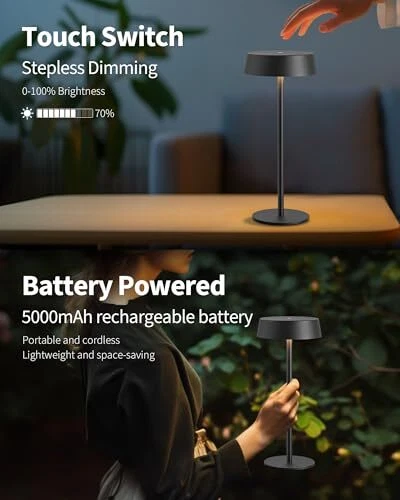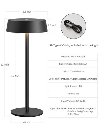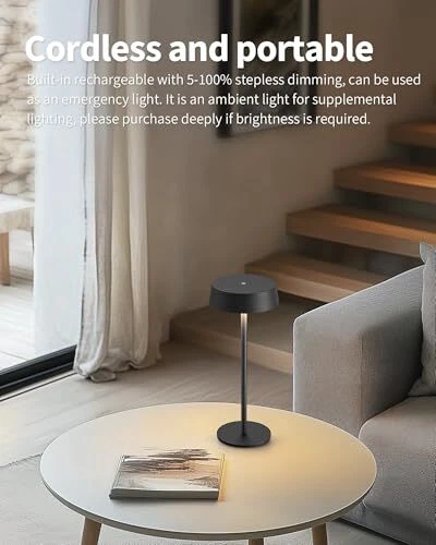 Return Policy Fast Delivery Trusted seller Modern Cordless Table Lamp Set of 2, Portable LED Desk Lamps, Rechargeable 5000mAh Battery Operated, Wireless Stepless Dimming Night Light for Bedroom, Dining Room, Bar, Outdoor (Black) Product Description 【Production process】The lamp body is made of iron metal, thick material, durable. Lamp body and lampshade surface using spray paint process color, color and luster uniform, frosted texture gives space matte antique feeling. The gold model uses electroplating process coloring, smooth and translucent, so that the gold color will not fall into the vulgar cheap, more modern charm. You can use it in the dining table, study, bedside, terrace. Patio, hallway and other places to use, home decor. 【Soft light】Built-in 5000mAh rechargeable battery, charging time is 4-6 hours, in the brightest state can be used about 8-24 hours, the darkest state can be used about 24-40 hours. Red light when charging, green light when fully charged. Carefully choose stable and non-flickering LED lamp beads, through the acrylic lampshade dispersal of light, light enough at the same time does not hurt the eyes, moonlight like a soft light, for you to sweep away the work of life in the laborious, enjoy a good night. 【Stepless dimming】Designed with touch switch, light touch can switch the light mode, white light, warm white light, warm light. Long press can adjust 5%-100% brightness. Easy to operate, flexible adjustment according to your needs and place of use. The soft light of low brightness can be used as a sleeping aid. High brightness can provide enough light for dining, reading, working and other scenes. It can also be used as an emergency light source during power outages or camping. 【Cordless design】 Simple cordless design, without the hassle of tangled cords, it doesn't take up visual space on the table. Moderate weight and size, can be picked up and placed elsew at any time. Half-circle arc lampshade design neutralizes the straight lines of the lamp body, enriches the overall aesthetics of the lamp, and is more dexterous and versatile. You can place it on your desktop, bookshelf, entryway, bedside and anyw else you need it. 【First choice for gifts】Stylish LED table lamp, exquisite and beautiful shape, easy and practical function, multiple colors to choose from, suitable for self-use or as a show gift for family and friends. If you encounter any problems during use, please contact us and we will try our best to solve them for you. Shipping Returns Payment Shipping Shipping is FREE to all addresses other than APO/PO boxes in the lower 48 states. All our stock ships from US-based warehouses. Shipped via USPS or UPS (depending on location and package weight) Unless stated otherwise, all orders will ship within 24-72 hours of your payment being processed. Check our feedback to see the great reviews of FAST shipping we offer. Returns Seller does not accept returns Payment We currently accept payment via eBay managed payments only. Once payment is cleared, we will dispatch your shipment within 1-3 business days. Please refer to the "Shipping" tab for more information regarding shipping speed to your destination.