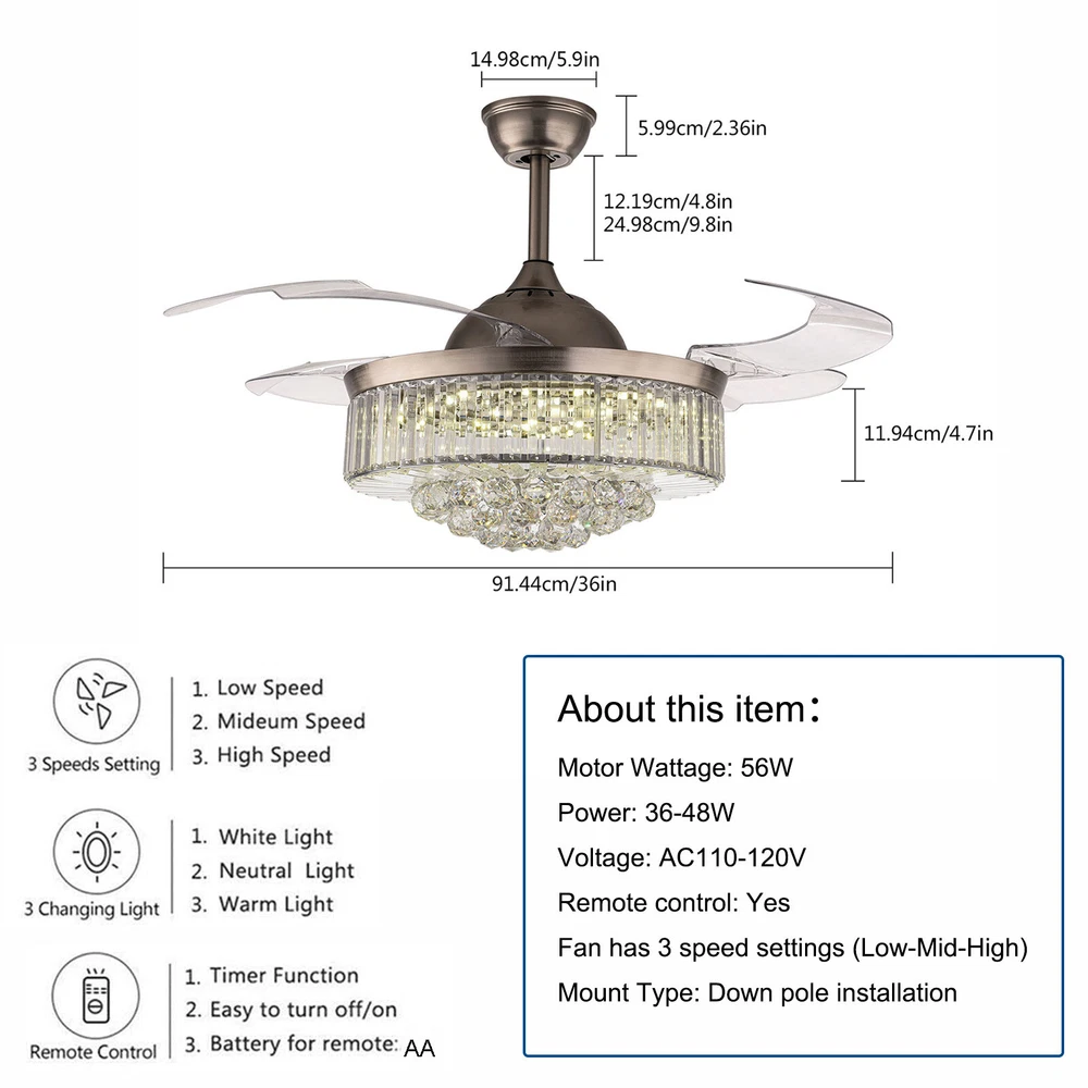36" ceiling fan with lights is a combination of ceiling fan and crystal chandelier: Fan Chandelier Features: ♥Pendant Lights Type: Crystal Pendant Lights ♥Material: Stainless Steel+k9 crystal+ABS fan ♥Size: Modern Fan Light Chandelier:36 inches when the fan is extended, Includes two lower bars, one for 4 inches and the other for 8 inches, you can choose one to install. ♥Color: Silver ♥Style: modern ♥Number of Blades: 4 ♥Lighting Features: dimmable, fan light ♥Application Type: Indoor ♥Light Bulb Type: LED ♥Number of lamps: 10 ♥Power: 41W (inclusive) -50W (including) ♥Applicable Places: living room/bedroom/kitchen/office and restaurant ♥Voltage: 110V Modern Crystal Chandelier Fandelier Ceiling Fan with Lights and Remote Silver 36" Ceiling Fan with Lights Is a Combination of Ceiling Fan and Crystal Chandelier: ★As for a Ceiling Fan, It Has 4 Retractable Blades That Can Stretch out and Put Inside Automatically When Turned on and off. ★That Means, When Turned off, the Blades Will Put Inside and Become 'Invisible', Totally a Chandelier with Crystal; ★When Turned on, the Blades Will Stretch out, and Transfer to a Traditional Ceiling Fan with Lights. ★This Chandelier Fan Is Controlled by Remote Control, Ceiling Fan Speed and Led Light Can Be Controlled Separately by a Single Remote Control. Fan Chandelier Features: ♥Pendant Lights Type: Crystal Pendant Lights ♥Material: Stainless Steel+K9 Crystal+Abs Fan ♥Size: Modern Fan Light Chandelier:36 Inches When the Fan Is Extended, Includes Two Lower Bars, One for 4 Inches and the Other for 8 Inches, You Can Choose One to Install. ♥Color: Silver ♥Style: Modern ♥Number of Blades: 4 ♥Lighting Features: Fan Light ♥Application Type: Indoor ♥Light Bulb Type: Led ♥Number of Lamps: 10 ♥Power: 41w (Inclusive) -50w (Including) ♥Applicable Places: Living Room/Bedroom/Kitchen/Office and Restaurant ♥Voltage: 110v Payment Delivery details Terms of sales About us Contact us Payment We accept ebay payment 。 Fees such as import duties, taxes are not included in the item price or shipping costs. These charges are the buyer's responsibility. Delivery details Shipping: 2-9 working days to: USA Terms of sales We maintain high standards of excellence and strive for hundred percent customer satisfaction. Feedback is very important to us. We hope that you contact us immediately before you give neutral or negative feedback, so that we can address your concerns. It is impossible to address issues if we do not know about them! About us Your satis faction is our ultimate goal. We work hard to earn your trust and future business. Our certified technicians have tested each item before shipping. The unit comes with 1 year limited warranty on all manufacturing defects. a) If you receive a defective item, you may return it or ask for a discount. Please contact us within 14 days after you receive the package. b) What you returned must be intact and in its original packaging as re? u. Customer is responsible for shipping costs of the returned item. c) We will cover the cost of shipping back t with the shipping rate indicated in the registration page. We will send you a new unit or refund the full payment you paid. Thank you. Contact us Business Hour Business Hour: Monday To Friday: 8:30 AM to 5:00 PM (Beijing China time) Due to time zones, our reply to your questions may not be immediately. But within above working time, we will reply your email within 24 hours. If it's non-workdays, please kindly be patient and wait till Monday. Please contact us with ebay message. Please feel free to contact us if you have any questions. Monday To Friday: 8:30 AM to 5:00 PM (Beijing China time) Due to time zones, our reply to your questions may not be immediately. But within above working time, we will reply your email within 24 hours. If it's non-workdays, please kindly be patient and wait till Monday. Please contact us with ebay message. Please feel free to contact us if you have any questions. FEATURE 2 FAST SHIPPING FEATURE -1 highquality, fastshipping Features High Quality, Creative, Fast Shipping shipping notice Can not ship to Puerto Rico,Alaska/Hawaii Item location: CA /NJ /Austell Note: Do not send to the Canary Islands Transportation does not include: canarias shipping notice: Can not ship to Puerto Rico,Alaska/Hawaii Light Source LED Model Ceiling fan Style Modern Material Stainless Steel+k9 crystal+ABS fan ISBN Does not apply UPC Does not apply EAN Does not apply Type Ceiling Fan Color Silver MPN Does Not Apply Room Bathroom, Bedroom, Dining Room, Hallway, Home Office/Study, Kitchen, Living Room, Children's Room Brand Unbranded Voltage 110V Number of Blades 4 Control Style Remote Control Mounting Ceiling Number of Speeds 3 Lighting Technology LED Installation Area Indoor & Outdoor Fan Width 36" Blade Color Clear Design Crystal Sensor Type Light Country/Region of Manufacture China Personalized Yes Manufacturer unknown Cord Color N/A Number of Settings 1 Power Source Corded Energy Star A LED String/Strip Type WS2811 EC Range A - G