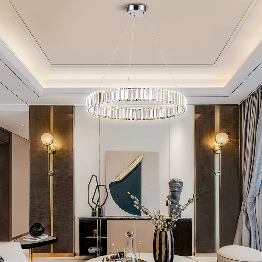 About this item * HIGH QUALITY MATERIAL: LED pendant lights with the polish stainless steel and glass crystals, the sparking crystal glass prisms will create a glamour and brilliant room for you. * SPECIFICATION: Ring size: diameter31.5 inches, The strings are 39.3" Long adjustable, you can adjust the height of the ring easily by using the cable locking pins; Perfectly fit the height of your ceiling * DIMMABLE : Dimmable with traditional dimmer switches, 5%-100% dimming range. Dimmer switch is excluded. * ENERGY SAVING: 25W modern chandeliers, Voltage=85-265V, Light Source: LED chips, Light Color: 3000K-4500K-6000K(Warm light-Warm White- White), perfect for living room ,bedroom,dining room ,restaurant,porch etc. Modern Crystal Chandelier LED Ring Pendant Light Hanging Lamp Fixture Dimmable About this item 【HIGH QUALITY MATERIAL】: This creative pendant chandelier features a well-made metal structure combined with hand-picked multi-faceted cutting K9 crystals, durable, anti-corrosion no-fading。sparkling crystals refracting light in multiple angles, which make this chandelier fairy glittering and shinning to your house. 【LUXURY GOLD HANGING LIGHT DIMENSIONS】: Diameter31.5" x Height 3". The overall hanging height is adjustable from 19" to 39.3". This glittering hanging crystal light fixture will add elegance and ambiance lighting to your living room, dining room, kitchen island, bedroom, foyer, etc. 【3-COLORS CHANGEABLE LED CHANDELIER for DINING ROOM】: Built-in high-bright 48W 3-Color LED strips, AC 110V. The color temperature could be changed from 3000K to 4500K and then 6000K. You can change the light color by repeatedly pressing the ON/OFF switch to achieve different ambiances. Working voltage: 110-120V,50/60Hz Lumens:2200 lumens Light color:3000K-4500K-6000K Material: Stainless steel + Crystal Glass Light Body Color: Chrome finish Light Source: SMD2835 led chip, above CRI 80 index Wide applications: Modern and elegant design rustic chandelier, ideal for pendant lights in living room, kitchen island lighting, bedroom mini chandelier, study room hanging light fixtures, foyer small chandelier, etc. Package Content: 1 x Crystal Chandelier 1 x Instruction manual 1 x Hardware bag Installation Instruction: ①For your safety, Please turn off the power before installation ② Please check parts against the packing list to see if the accessories are available. ③We provide install instructions for you. please referred to install manual or have a professional electrician. If need any help, please contact us. Payment Delivery details Terms of sales About us Contact us Payment We accept ebay payment 。 Fees such as import duties, taxes are not included in the item price or shipping costs. These charges are the buyer's responsibility. Delivery details Shipping: 2-9 working days to: USA Terms of sales We maintain high standards of excellence and strive for hundred percent customer satisfaction. Feedback is very important to us. We hope that you contact us immediately before you give neutral or negative feedback, so that we can address your concerns. It is impossible to address issues if we do not know about them! About us Your satis faction is our ultimate goal. We work hard to earn your trust and future business. Our certified technicians have tested each item before shipping. The unit comes with 1 year limited warranty on all manufacturing defects. a) If you receive a defective item, you may return it or ask for a discount. Please contact us within 14 days after you receive the package. b) What you returned must be intact and in its original packaging as re? u. Customer is responsible for shipping costs of the returned item. c) We will cover the cost of shipping back t with the shipping rate indicated in the registration page. We will send you a new unit or refund the full payment you paid. Thank you. Contact us Business Hour Business Hour: Monday To Friday: 8:30 AM to 5:00 PM (Beijing China time) Due to time zones, our reply to your questions may not be immediately. But within above working time, we will reply your email within 24 hours. If it's non-workdays, please kindly be patient and wait till Monday. Please contact us with ebay message. Please feel free to contact us if you have any questions. Monday To Friday: 8:30 AM to 5:00 PM (Beijing China time) Due to time zones, our reply to your questions may not be immediately. But within above working time, we will reply your email within 24 hours. If it's non-workdays, please kindly be patient and wait till Monday. Please contact us with ebay message. Please feel free to contact us if you have any questions.