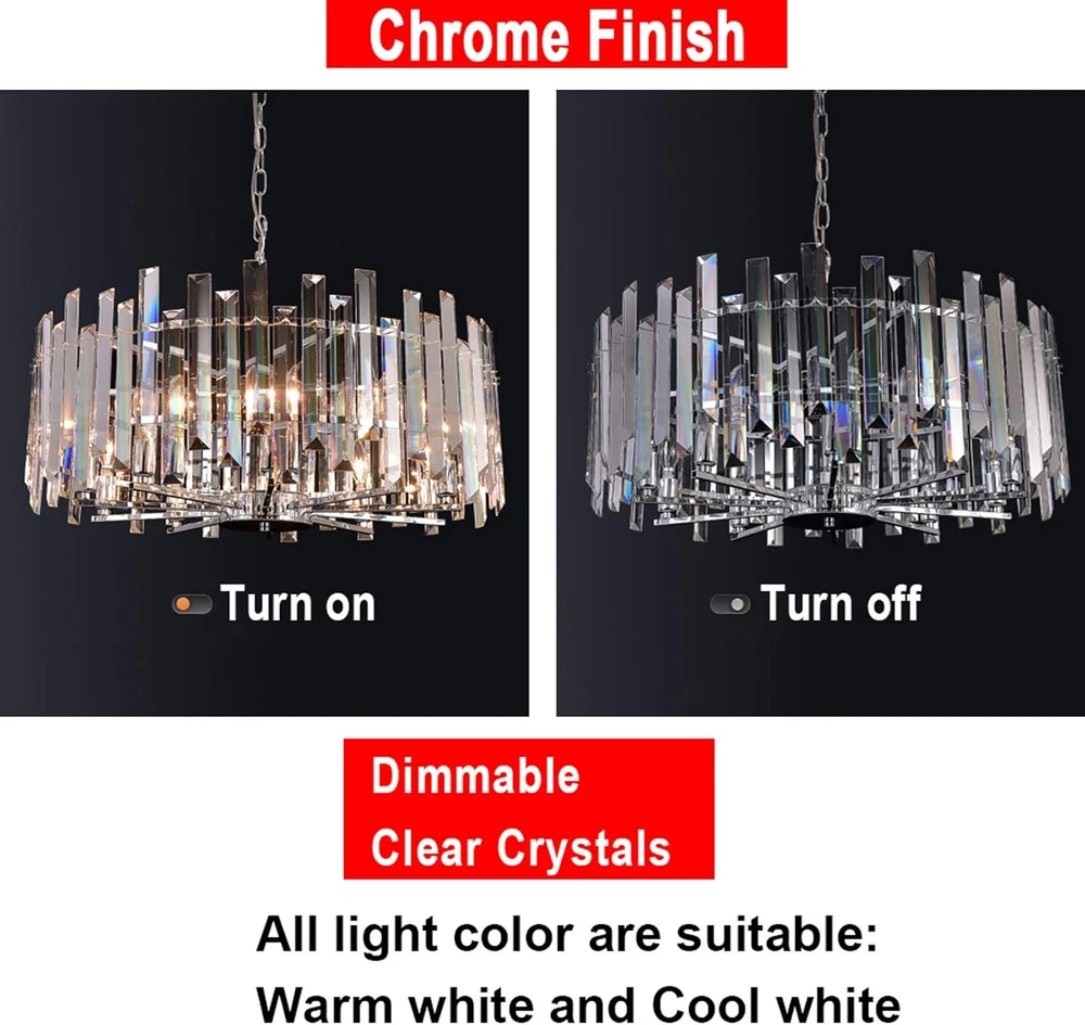 Store New Arrivals Add to Favorite View Feedback Contact Modern Crystal Chandelier Lighting Chrome Pendant Ceiling Lights Fixture Contemporary Island Chandeliers for Living Room Dining Room Dimmable D27.56 Description Item model number MD6068-D700MN Light Source Type E12 screw-in bulb, 40 watts Style Modern Number of Items 10 Power Source AC Fixture Type Non Removable Number of Light Sources 10 Control Method App Embellishment Crystal Theme modern contemporary lighting Lighting Method Uplight Maximum Compatible Wattage 400 Watts Specification Met UL Controller Type Push Button Unit Count 1.0 Count Room Type Kids Room, Lobby, Bedroom, Living Room, Home Office, Hallway, Dining Room Assembly Required Yes Product Dimensions 27.56"L x 27.56"W x 70.8"H Material Metal, Crystal Collection crystal chandelier Installation Type Self-Assembly Finish Type Polished Specific Uses For Product Indoor use only Manufacturer Lighting Indoor/Outdoor Usage Indoor Bulb Base E12 Batteries Required? No Warranty Type Limited Item Weight 31.5 pounds Light fixture form Chandelier Special Features Dimmable Special Feature Dimmable Part Number MD6068-D700PN Shade Color Clear Mounting Type Ceiling Mount Color Chrome Wattage 400 watts Shape Round Voltage 110 Volts Plug Format A- US style Shade Material Crystal Finish types Polished Included Components Light kit inlcuded Size 27.56" UL Listed. Bulbs Not included. Please notice that this chandelier requires self-assembly according to installation instruction and needs patience to get it installed Chandelier Size: Diameter 27.56" * Body Height 11.8". Comes with 59" adjustable chain. Material: Top grade clear crystals and metal Dimmable. Bulb Type: 10* E12 Bulbs Required (Bulbs Not included). Each bulb's wattage: 40W, Maximum Compatible Total Wattage: 400W, Input Voltage: 110V Suggested Space Fit: Island, Dining Room, Living Room, Bedroom, Girls room, Kids Room ,Hallway, Proch, Hotel, Staircase, Foyer, Hallway, Office Satisfaction : 5-Year on parts. 24/7 customer support with technical advice Product Description MEEROSEE CRYSTAL CHANDELIER LIGHT FIXTURES Material: Top grade clear crystals and metal Chandelier Size: Diameter 27.56" * Height 11.8". Comes with 59" adjustable chain. Material: Top grade clear crystals and metal Maximum Compatible Total Wattage: 400W Each bulb's wattage:40W Bulb Type: 10* E12 Bulbs Required (Bulbs Not included) All light colors are suitable Color Temperature: Cool White & Warm White Input Voltage: 110V Instruction manual is included ABOUT US We offer the best prices around on high quality products. Our E-store includes media such as books, movies, music and games while offering electronics, toys, sporting apparel, clothing, tools, general home, garden items and more. SHIPPING We are always working hard to ensure your package arrives as soon as possible. Please understand that some factors like weather, high postal traffic, and the performance of shipping companies are outside of our control. We offer free shipping to the lower 48 states and ship within 2 business days of payment, usually sooner. We do not accept P.O. Boxes. Please provide a physical address. For shipping outside of the continental USA, we only use eBay's Global Shipping Program.The item is shipped to KY and then sent to the rest of the world. International customers are responsible for all duties and taxes. Continue to check out in order to calculate costs for shipping the item to your country. Messages regarding eBay's Global Shipping Program MUST be directed at eBay EXCLUSIVELY. RETURNS We offer a 30-Day Return Policy on items which you are not completely satisfied with. You have the option for a full-refund or an exchange of the item. No returns are available on items shipped outside of the USA. PAYMENT We accept PayPal. CONTACT US This page content is yet to come Please ad us to your favorite seller and visit again later Thank You CUSTOMER SATISFACTION We try our very best to make sure every customer is completely satisfied. If there's a problem, message us! We're happy to help. WE ACCEPT Copyright © 2021 AutoDS. | All Rights Reserved