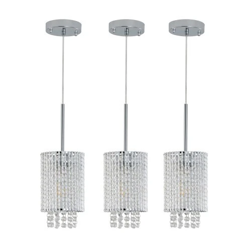 Description Color: Chrome Material: Iron + Crystal Bulb type & quantity: 3*E26 bulbs (The product without bulbs!) Bulb Wattage: Each Bulb Max 60W Applicable voltage: 120V Adjustable: The height can be adjusted Power Supply Mode:Hard-Wired Applicable scenarios: Living room, Dining room, Kitchen, etc Features Elegant Crystal design: The use of high-quality crystal prism design, increase the luxury and brightness of the interior space, make your home environment more elegant and stylish. Three-piece set: Contains three chandeliers suitable for installation in multiple locations such as dining room, kitchen island and living room, providing a consistent aesthetic and ample lighting. Adjustable height: The height of the chandelier can be freely adjusted according to demand to adapt to different ceiling heights and decorative needs to ensure the best lighting effect. Easy installation: With detailed installation instructions and necessary accessories, you can quickly complete the installation without professional knowledge, so that you can easily enjoy the beautiful lighting.