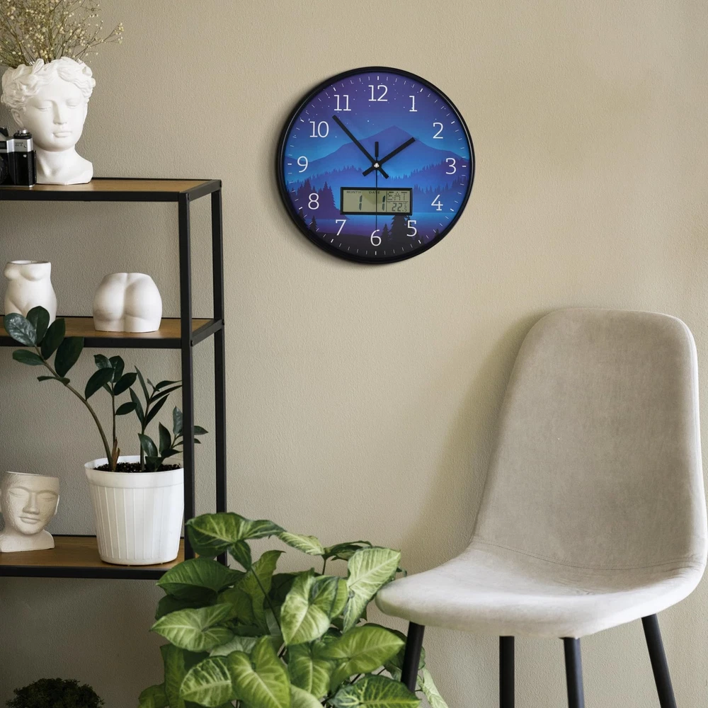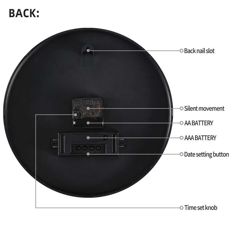 【Wall Clock Battery Powered】-Easy to use. It requires 1 AA battery and 1 "AAA" battery for the LCD display and one for the quartz movement. (Note: Batteries not provided. Do not use alkaline batteries.) Clock comes with hooks and a wide slot on the back for easy hanging 【Widely Used】: This wall clock is 12 inches in diameter, you can hang it anywhere. This wall clock is perfect for outdoor/indoor, living room, kitchen, bedroom, office, library, school decoration. 【Accurate Time & Non-Ticking】The silent wall clock use superior precise quartz movement, and keep the time accurate . It can keep you have a good sleep, study and work environment. It is a great choice in home, kitchen and office decor. 【LCD Display】: The modern wall clock decorative features with a large LCD screen, and displays date, month, day of week and temperature. only need a wall clock can use more functions. 【PERFECT GIFT IDEA 】- wall clocks are the perfect gift for family, partners, and friends. It is also an ideal gift for birthdays, anniversaries, Christmas, Mother's Day, Valentine's Day, Halloween, and Christmas. Modern clock can make your home look more beautiful and personalized.