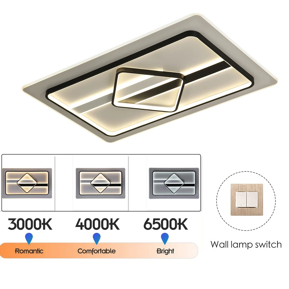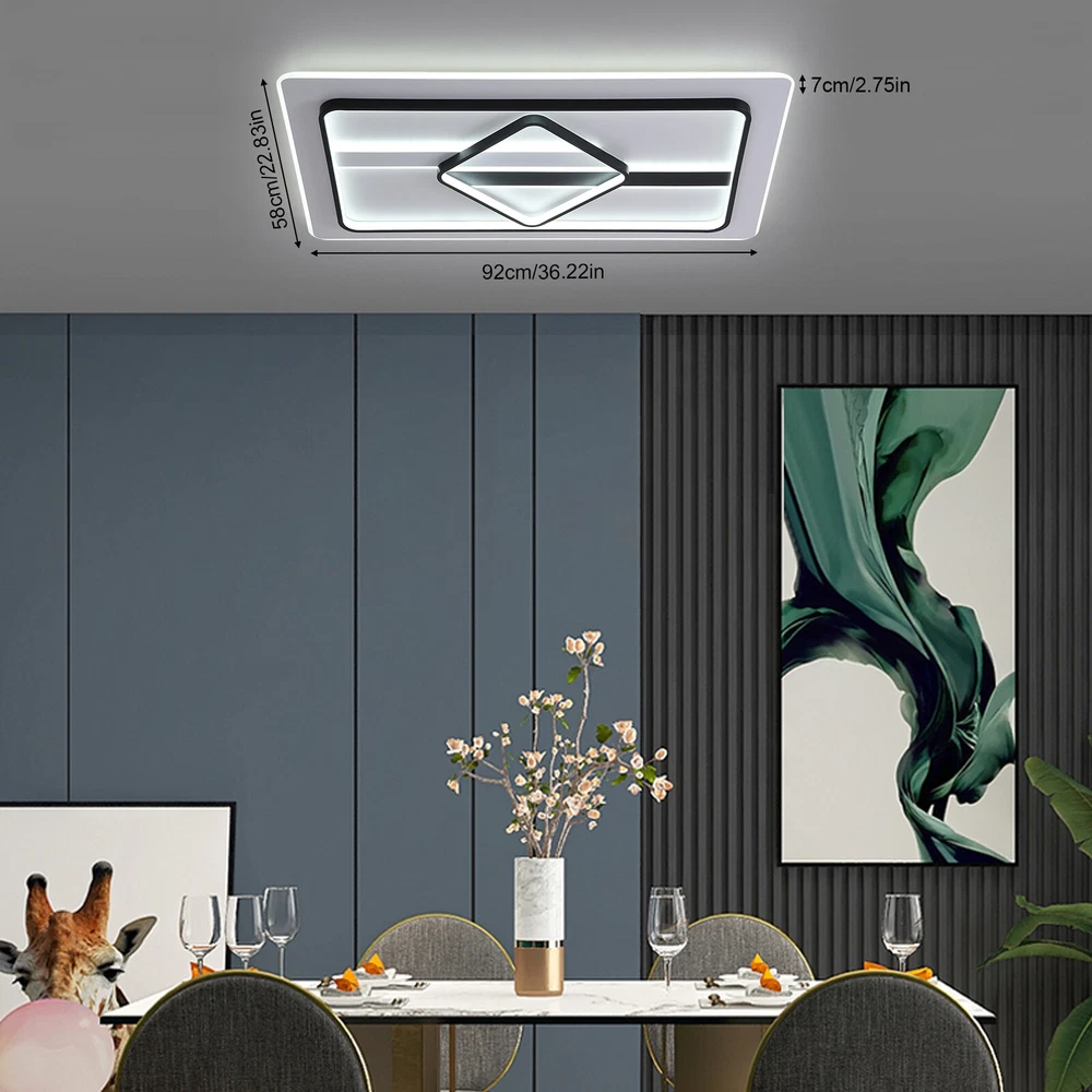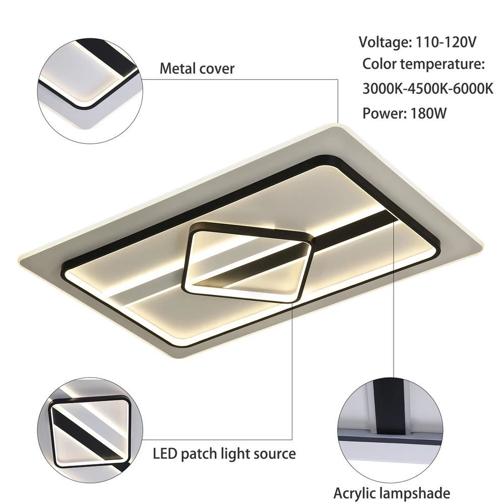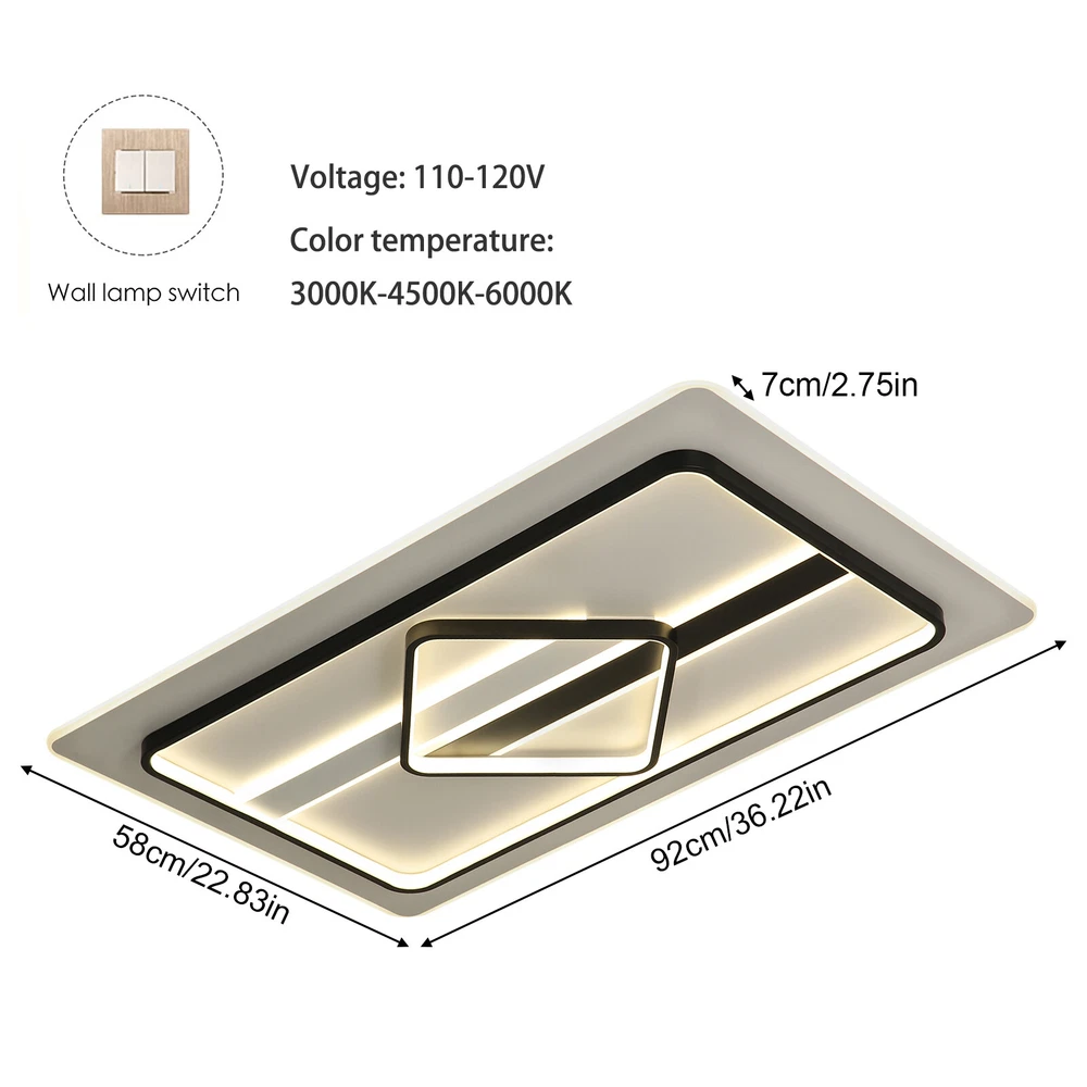 Modern Dimmable LED Chandelier Ceiling Light Pendant Lamp Fixture Home Decor US Modern Ceiling Light Dimmable LED Chandelier Flush Mount Ceiling Lights Ceiling Lamp Fixture for Living Room Dining Room Bedroom Description This unique lamp adds a modern and simple style to any room. It blends well with the theme of the room, which increases the beautiful visual appeal that only this kind of light can create. It is not only a lamp but also a beautiful decorative piece. Key Features High-quality Material: This product is made of high-quality iron and aluminum and has a fine-baked finish with high hardness, anti-corrosion , and anti-rust properties. Powerful Lighting: 180W LED light source provides powerful lighting (215.28-376.74ft 2 ). The invisible strobe makes the light more delicate and comfortable without harshness. High color rendering anti-blue LED light will bring brighter and richer colors to your room. Three Color Changing Light: Three colors of light (white 6000k, neutral 3500k, warm 2800k) with high color rendering bring you a variety of lighting atmosphere. You can use the wall switch to adjust the color temperature at will. Energy Saving: High-quality energy-saving LED lights are up to 85% more energy efficient than halogen lights. It consumes less electricity but has a high brightness output, saving your electricity bill. Stylish Appearance: The elegant ceiling light impresses with its classic color scheme and stylish appearance, making it an eye-catcher in both the living room and bedroom. Its charming modern style can match most styles of furniture and add a beautiful accent to your home. Easy to Install: Once your wiring is ready, its simple construction design and the English manual included in the product package allow for a quick and easy installation. Ideal Gift: This product is stylish and high-quality and can be used as a gift for parents, friends, and loved ones, or as a housewarming, birthday, and holiday gift. Good Customer Service: Communication is the best way to solve problems. If you encounter any problem after purchase, please contact us in time before opening or unpacking the box. We will do our best to solve the problem for you. Details Thin Design: With a thickness of only 2.75 inches, the product is mounted close to the ceiling, making it less likely to accumulate dust and easier to clean. Hidden Wires: The product is free of exposed wires, resulting in a more attractive appearance and safer use. Application It is ideal for hallway, entry, porch, mudroom, stairwell, kitchen, closet, kid's room, dining room, bedroom, and living room, also ideal for commercial areas, such as bar, cafe, hotel, and restaurant. It fits a space of 215.28-376.74ft 2 . Specification Model: 8004 Shape: Rectangle Style: Modern Material: Iron, Aluminum Color: Black, White Process: Baking Paint Assembly Required: Yes Plug Standard: US Standard Indoor/Outdoor Usage: Indoor Light Fixture Form: Close to Ceiling Control Mode: Wall Switch (Not Included) Voltage: 110V Three Color Changing Light: White 6000k, Neutral 3500k, Warm 2800k Light Source: LED (180W, Included) Illuminated Area: 20-35㎡/215.28-376.74ft 2 Product Size: 92*58*7cm/ 36.22*22.83*2.75 in Package Included 1 * Modern Ceiling Light 1 * English Manual All Accessories for Installation Notes This product is not waterproof , please install it in a dry environment. Please disconnect the power and wipe with a soft, dry cloth before cleaning the shade or fixture. Please make sure that the roof and floor construction is completed and there is free of leakage before the installation of the luminaire; the plastering of the roof and walls and the cleaning of the ground have been completed. If the installation location of the product is fragile materials (marble, tile, glass, ceramic, etc.), you need to explain to the installer in advance, so as to determine whether professional drilling tools are required. Products with electrical plugs are designed for use in the US. Please check compatibility before purchasing. Please read the operating manual completely before use. And pay particular attention to the safety instructions included. Please allow the slight color difference caused by the shooting light and the 1-3 cm error due to manual measurement, and make sure you do not mind before ordering. Brand OCASAMI Characteristic Convenient Use,Easy Operation,Easy installation 1.Features` Easy installation,Compact Design Warranty. 3 Years *Feature* Creative Design,Durable Material,Beautiful Highlights Compact Design,Unique Appearance,high reliability ❤Highlights❤ ❤Beautiful Appearance❤,❤Creative Design❤,❤Durable Material❤ Features ❤Great value with warranty❤ 🔥Feature🔥 🔥High Performance🔥Good Stability🔥High Safety🔥 * Feature * *Durable Material*Good Performance*Beautiful Appearance* Feature 1 Durable , Made of high quality material Shipping Note Cannot ship to Puerto Rico & Hawaii Transportation does not include canarias Type Chandelier Model 8004 Shape Rectangle Style Modern Material Iron, Aluminum Color Black, White Process Baking Paint Assembly Required Yes Plug Standard US Standard Indoor/Outdoor Usage Indoor Light Fixture Form Close to Ceiling Control Mode Wall Switch (Not Included) Voltage 110V Three Color Changing Light White 6000k, Neutral 3500k, Warm 2800k Light Source LED (180W, Included) Illuminated Area 20-35㎡/215.28-376.74ft2 Product Size 92*58*7cm/ 36.22*22.83*2.75 in