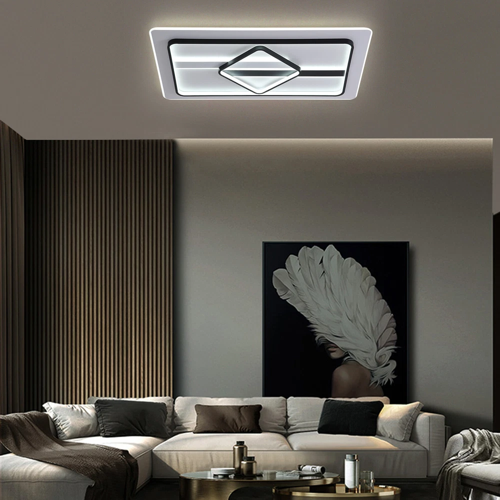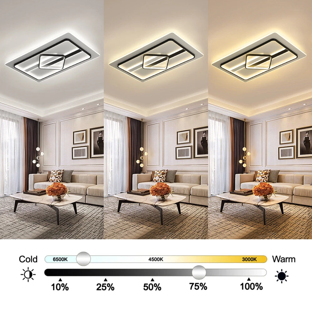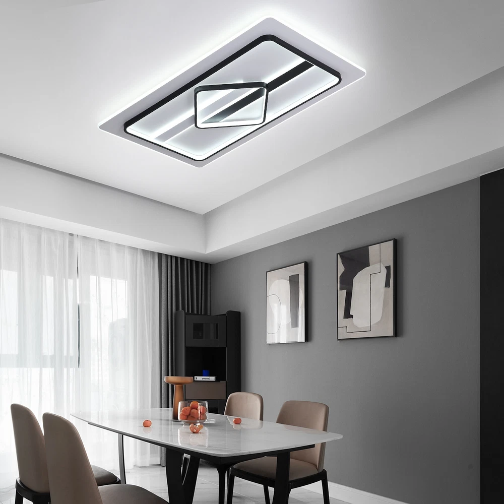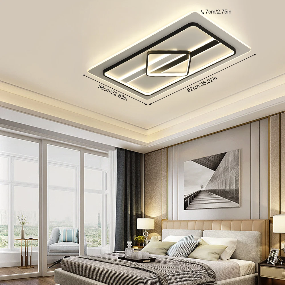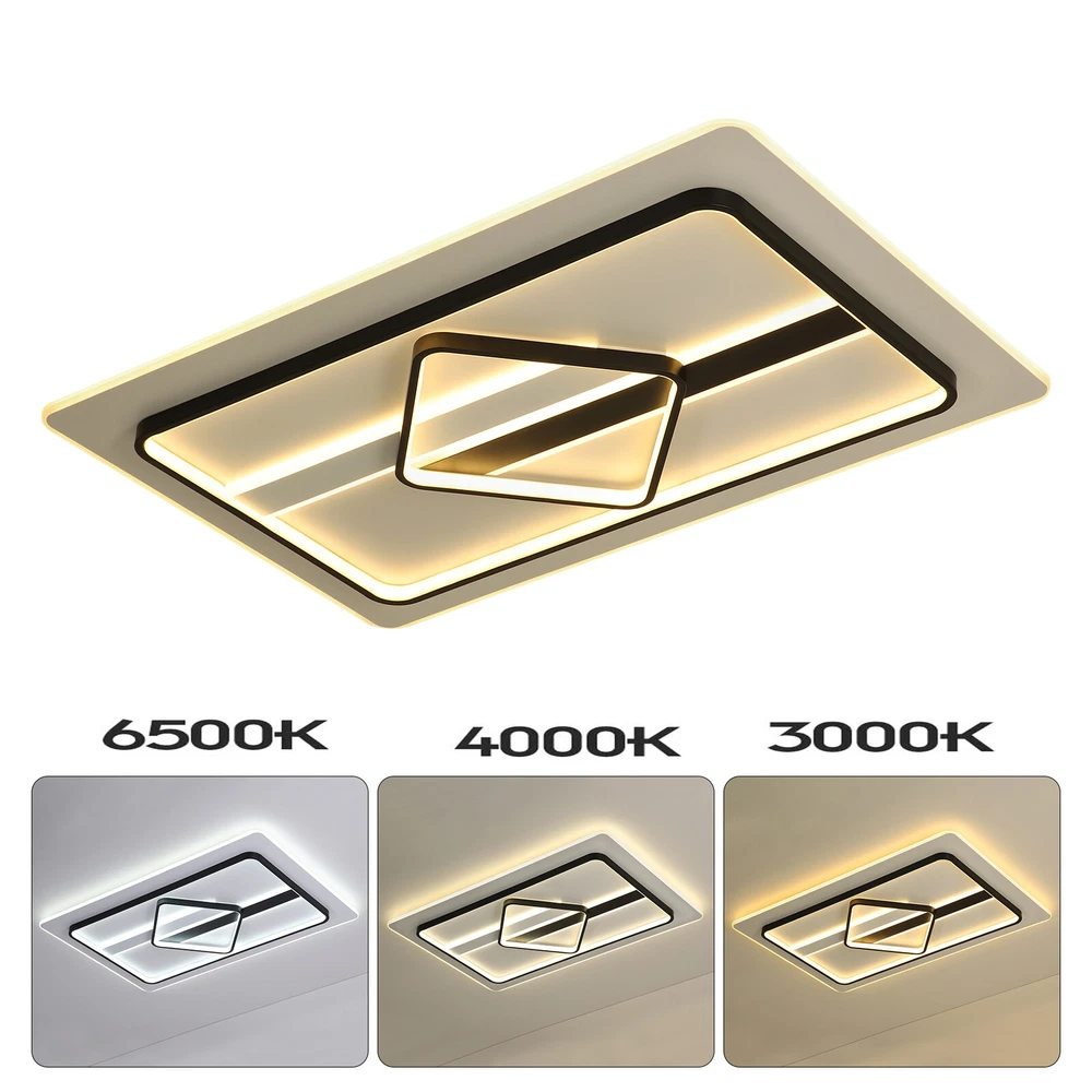 Modern Dimmable LED Chandelier Ceiling Light Pendant Lamp Fixture Home Decor US Modern Ceiling Light Dimmable LED Chandelier Flush Mount Ceiling Lights Ceiling Lamp Fixture for Living Room Dining Room Bedroom Description This unique lamp adds a modern and simple style to any room. It blends well with the theme of the room, which increases the beautiful visual appeal that only this kind of light can create. It is not only a lamp but also a beautiful decorative piece. Key Features High-quality Material: This product is made of high-quality iron and aluminum and has a fine-baked finish with high hardness, anti-corrosion , and anti-rust properties. Powerful Lighting: 180W LED light source provides powerful lighting (215.28-376.74ft 2 ). The invisible strobe makes the light more delicate and comfortable without harshness. High color rendering anti-blue LED light will bring brighter and richer colors to your room. Three Color Changing Light: Three colors of light (white 6000k, neutral 3500k, warm 2800k) with high color rendering bring you a variety of lighting atmosphere. You can use the wall switch to adjust the color temperature at will. Energy Saving: High-quality energy-saving LED lights are up to 85% more energy efficient than halogen lights. It consumes less electricity but has a high brightness output, saving your electricity bill. Stylish Appearance: The elegant ceiling light impresses with its classic color scheme and stylish appearance, making it an eye-catcher in both the living room and bedroom. Its charming modern style can match most styles of furniture and add a beautiful accent to your home. Easy to Install: Once your wiring is ready, its simple construction design and the English manual included in the product package allow for a quick and easy installation. Ideal Gift: This product is stylish and high-quality and can be used as a gift for parents, friends, and loved ones, or as a housewarming, birthday, and holiday gift. Good Customer Service: Communication is the best way to solve problems. If you encounter any problem after purchase, please contact us in time before opening or unpacking the box. We will do our best to solve the problem for you. Details Thin Design: With a thickness of only 2.75 inches, the product is mounted close to the ceiling, making it less likely to accumulate dust and easier to clean. Hidden Wires: The product is free of exposed wires, resulting in a more attractive appearance and safer use. Application It is ideal for hallway, entry, porch, mudroom, stairwell, kitchen, closet, kid's room, dining room, bedroom, and living room, also ideal for commercial areas, such as bar, cafe, hotel, and restaurant. It fits a space of 215.28-376.74ft 2 . Specification Model: 8004 Shape: Rectangle Style: Modern Material: Iron, Aluminum Color: Black, White Process: Baking Paint Assembly Required: Yes Plug Standard: US Standard Indoor/Outdoor Usage: Indoor Light Fixture Form: Close to Ceiling Control Mode: Wall Switch (Not Included) Voltage: 110V Three Color Changing Light: White 6000k, Neutral 3500k, Warm 2800k Light Source: LED (180W, Included) Illuminated Area: 20-35㎡/215.28-376.74ft 2 Product Size: 92*58*7cm/ 36.22*22.83*2.75 in Package Included 1 * Modern Ceiling Light 1 * English Manual All Accessories for Installation Notes This product is not waterproof , please install it in a dry environment. Please disconnect the power and wipe with a soft, dry cloth before cleaning the shade or fixture. Please make sure that the roof and floor construction is completed and there is free of leakage before the installation of the luminaire; the plastering of the roof and walls and the cleaning of the ground have been completed. If the installation location of the product is fragile materials (marble, tile, glass, ceramic, etc.), you need to explain to the installer in advance, so as to determine whether professional drilling tools are required. Products with electrical plugs are designed for use in the US. Please check compatibility before purchasing. Please read the operating manual completely before use. And pay particular attention to the safety instructions included. Please allow the slight color difference caused by the shooting light and the 1-3 cm error due to manual measurement, and make sure you do not mind before ordering. Brand OCASAMI Characteristic Convenient Use,Easy Operation,Easy installation 1.Features` Easy installation,Compact Design Warranty. 3 Years *Feature* Creative Design,Durable Material,Beautiful Highlights Compact Design,Unique Appearance,high reliability ❤Highlights❤ ❤Beautiful Appearance❤,❤Creative Design❤,❤Durable Material❤ Features ❤Great value with warranty❤ 🔥Feature🔥 🔥High Performance🔥Good Stability🔥High Safety🔥 * Feature * *Durable Material*Good Performance*Beautiful Appearance* Feature 1 Durable , Made of high quality material Shipping Note Cannot ship to Puerto Rico & Hawaii Transportation does not include canarias Type Chandelier Model 8004 Shape Rectangle Style Modern Material Iron, Aluminum Color Black, White Process Baking Paint Assembly Required Yes Plug Standard US Standard Indoor/Outdoor Usage Indoor Light Fixture Form Close to Ceiling Control Mode Wall Switch (Not Included) Voltage 110V Three Color Changing Light White 6000k, Neutral 3500k, Warm 2800k Light Source LED (180W, Included) Illuminated Area 20-35㎡/215.28-376.74ft2 Product Size 92*58*7cm/ 36.22*22.83*2.75 in