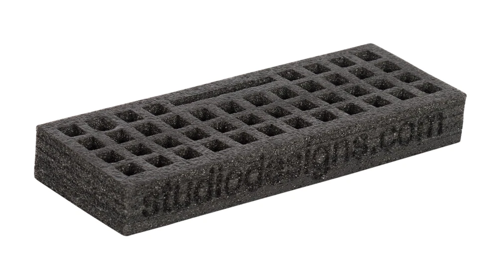 The flexible foam maker organizer by Studio Designs has 44 compartments to accommodate drawing supplies up to 15-mm in diameter. These trays are the latest innovation in art supply storage. They are lightweight, durable and will keep your pencils, brushes and markers neat and handy. We also offer flexible foam organizers in a 24 compartment (item # 12175) or 96 compartment (item 12174) configuration for pens, pencils and markers. Each organizer features a cell slot to keep your clean and close during your projects. Designed to fit into easily into the premier metal art tray (item # 12167, 12168, 12169), they can also stand alone to be used as an office or craft supply drawer organizer Overall dimensions: 11.75W x 4D x 2H 44 slots for pens, pencils, markers, and brushes: 15mm slot for mobile or other supplies: 3.5W Can also be used as a desktop organizer Sold as a 2-pack in a Hanging box