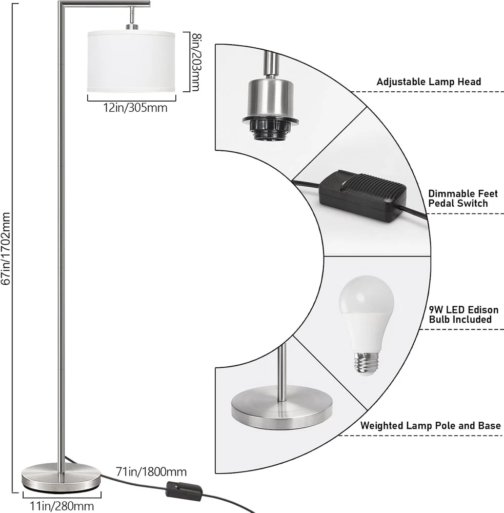 Installation Type: Freestanding Item model number: 13046 Voltage: 120 Volts (AC) Mounting Type: Pole Mount Connectivity Technology: USB Base Material: Metal Number of Light Sources: 1 Batteries Included?: No Maximum Compatible Wattage: 100 Watts Specific Uses For Product: Indoor use only Number of Pieces: 1 Is Cordless?: No Special Feature: Pedal Dimmer Switch, 0-100% dimmable, LED bulb included Country of Origin: China Color Temperature: 3000 Kelvin Bulb Base: E26 Medium Style: Modern, Minimalist, Classic, Antique, Art Decor Part Number: 13046 Wattage: 9 watts Power Source: Corded Electric Finish Type: Brushed Shape: Curved Efficiency: High Efficiency Type: Does not apply Control Method: Touch Bulb Shape Size: B10 Brand: Does not apply Material: Metal Brightness: 1200 Lumen UPC: 313106637699 Batteries Required?: No Item Weight: 11 Pounds Is Waterproof: False Number of Items: 1 Light Source Type: LED Shade Height: 35 Inches Water Resistance Level: Waterproof Product Dimensions: 11"D x 12"W x 67"H Color: Silver Shade Color: White Indoor/Outdoor Usage: Indoor Room Type: Office, Living Room, Bedroom, Study Room, Dining Room Lighting Method: Adjustable Connectivity Protocol: Homeplug Special Features: Pedal Dimmer Switch, 0-100% dimmable, LED bulb included Lamp Type: Floor Lamp gtin13: 313106637699