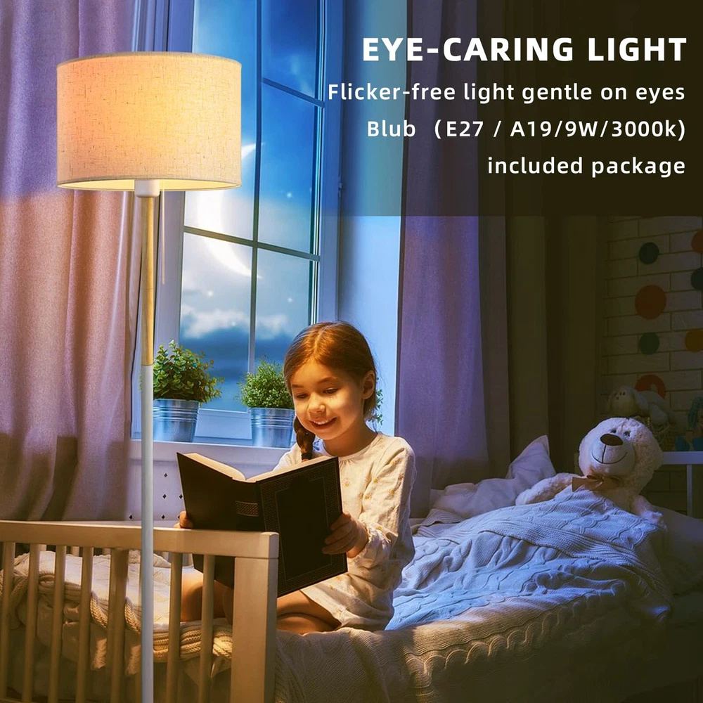【Modern Floor Lamp with Pull Chain Switch】 This floor lamp comes with an easy-reach pull chain switch, allowing you to turn the lamp on and off easily to set a more intimate glow for watching a movie. Standing lamp with 59.84 inches in height is definitely a perfect choice for better illuminating your whole space, standing just over your sofa, or armchair to get enough light for reading or working. luster for your room, creating a warm atmosphere. 【Minimalism Style Standing Lamp 】 For the minimalist design lover, this steel floor lamps features an elegantly slender column and round base in a deep black or white finish. You can decorate your home or office with our floor lamps. It uses a fabric lampshade, which can diffuse decorative light to create a soft and comfortable atmosphere in your room. You can read, chat, nap, and meditate under the corner light stand. 【Linen Fabric of Unique Texture】 Our mid century modern floor lamp integrates selected linen fabric lampshade, which can produce a warm, natural & smooth light – more appealing than other shades that will crack & yellow over time. The warm light of this standing lamp creates a comfortable, calming ambiance - let you relax during stressful work. 【High-grade Real Wood & Stable Metal Base】 For just a touch of character, the floor lamp's made of high-quality solid wood and metal legs collection offers a timeless look. The retro wood grain finish gives your home a sense of elegance and comfort. The heavy metal base offers more stability to the whole lamp structure. 【Modern Floor Lamp with Eye Protect Blub】The supplied 9W LED bulb can last up to 5,0000 hours, 5x longer than traditional light bulbs, the lamp is also eye-protecting that can offer you a comfortable reading experience. The E26 socket of this traditional standing floor lamp applied a high heat-dissipation capacity to assure a longer lifespan. Note- the included bulb is not dimmable but it can be replaced with a smart bulb.