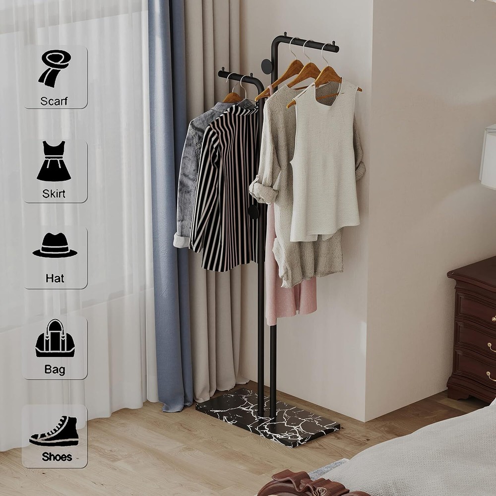 Color Black 2 Pole Material Iron Recommended Uses For Product Coats Hats Shoes Tie & Belt Umbrella Product Dimensions 11.9"D x 23.7"W x 67"H About this item SPACE-SAVING: This coat rack is compact and self-contained with a unique double-bar design that takes up very little space while maximizing storage capacity. It is oil-resistant, scratch-resistant, and easy to clean MODERN & MINIMALIST STYLE: Double-pole freestanding metal coat rack with a satin steel finish, smooth touches, organize your living space with stylish solutions, the anti-drop bead design, are both beautiful and in preventing the hanger from falling off HIGH QUALITY MANUFACTURING: The durable wardrobe is made from high quality iron. The black electroplating and polishing process creates an elegant appearance and a delicate touch. The anti-rust coating allows it to be used in the bathroom DESIGN CONCEPT: Stable like a big tree with many branches. We are a manufacturer dedicated to furniture, all products are from our own hands, every screw contains our love and details EASY TO ASSEMBLE: So easy, assemble in minutes, can be installed on its own in just 10 minutes Tips: The included screws are already installed in the bar of the coat rack