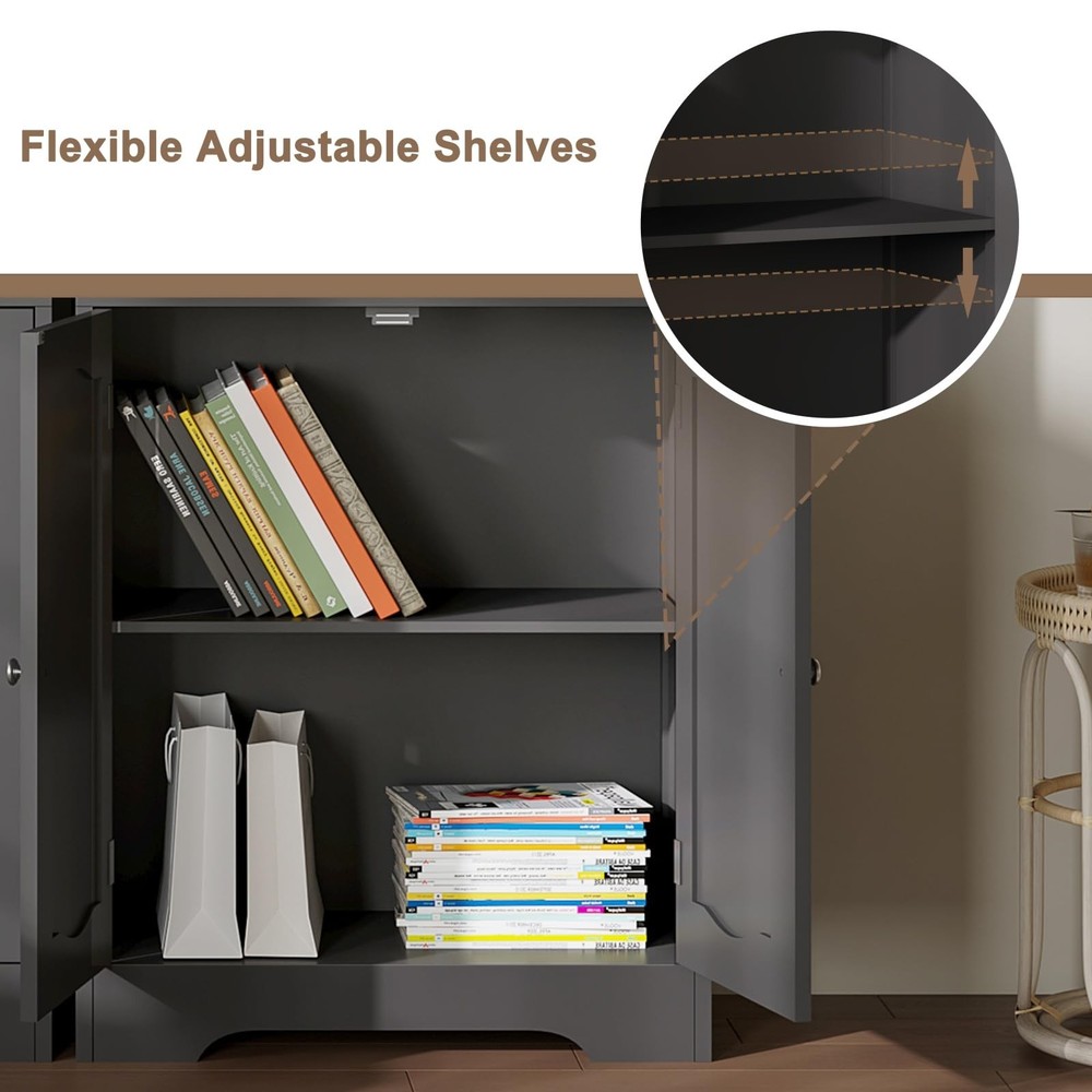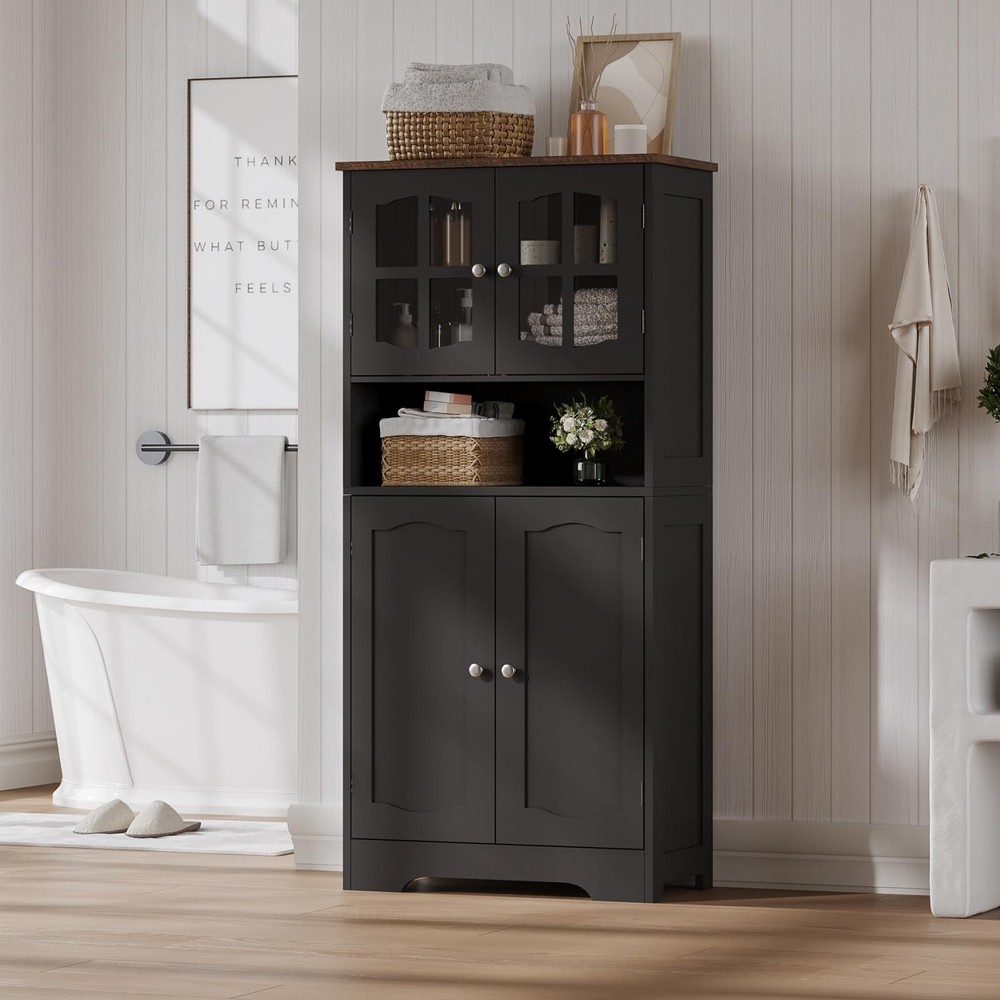 Bathroom Storage Cabinet, Freestanding Storage Cabinet with Doors and Shelves, Modern Cupboard for Bathroom, Living Room, Kitchen, Office, Black 【Elegant Modern Design】Cross-patterned acrylic cabinet doors with metal handles bring a touch of modernity and sophistication to your space. Minimalist lines and finishes combine beauty and functionality, making this black storage cabinet the highlight of your bathroom, kitchen, or living room 【Spacious Storage】This bathroom floor cabinet features 4 interior compartments with adjustable shelves and an open countertop for flexible storage of towels, toiletries, kitchen supplies, and more. The open countertop provides easy access to everyday items and organizes your space 【Multi-Situation Functionality】The tall storage cabinet is perfect for the bathroom. It can also be used as a freestanding cabinet in the living room, a storage cabinet in the kitchen, or a bookcase in the home office. Its versatile design makes it a practical choice for any room 【Sturdy & Durable】This pantry linen cabinet is made of high-quality MDF, which is waterproof and scratch-resistant to ensure durability. It has some load-bearing capacity and it comes with anti-tip hardware and a solid base for safe use 【Easy Assembly】bathroom cabinet comes with detailed instructions, labeled parts for quick and easy installation. Our dedicated customer service team is ready to assist you