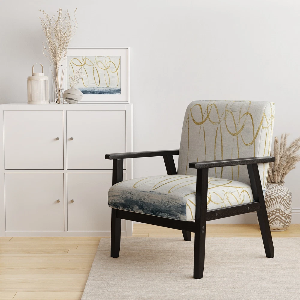 Use Designart's modern upholstered chair to bring a glamorous accent to your contemporary aesthetic. The sleek armless design makes this side chair ideal for smaller spaces, and the strong hardwood frame provides sturdy support. Rich shades of gold and grey stay vivid thanks to the use of high-density Italian inks in the printing process. Soft polyester fabric, a semi-firm foam-padded seat, and a high back combine in this 'Gold Abstract Geometric Shape' chair to create a comfortable place to unwind and relax at day's end.Features:1 Accent chair includedFoam Filled SeatingSide Chairs : 32.5in high x 22.5in deep x 27.5in wideSlipper Chair : 32in high x 21in deep x 25in wideArm Chair : 32in high x 23in deep x 23in wide Free Shipping Over $49.99* Details Designart "Gold Abstract Geometric Shape" Upholstered Modern Accent Chair - Arm Product Description: Use Designart's modern upholstered chair to bring a glamorous accent to your contemporary aesthetic. The sleek armless design makes this side chair ideal for smaller spaces, and the strong hardwood frame provides sturdy support. Rich shades of gold and grey stay vivid thanks to the use of high-density Italian inks in the printing process. Soft polyester fabric, a semi-firm foam-padded seat, and a high back combine in this 'Gold Abstract Geometric Shape' chair to create a comfortable place to unwind and relax at day's end. Features: 1 Accent chair included Foam Filled Seating Side Chairs 32.5in high x 22.5in deep x 27.5in wide Slipper Chair 32in high x 21in deep x 25in wide Arm Chair 32in high x 23in deep x 23in wide