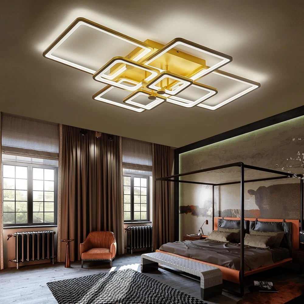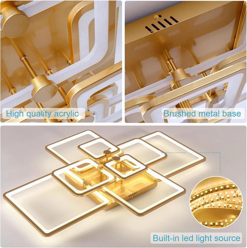 【Exquisite Gold Modern Ceiling Light】Selecting gold-colored elements in home design can help elevate the brightness and comfort of a space. HiHiHomy 8 Squaure gold flush mount ceiling light fixture modern borned. It's a very stunning lighting fixture ceiling that combines elegance with functionality. This exquisite gold ceiling light fixture features a sleek and slim design, making it a perfect fit for modern-style home. Ceiling light is crafted with high-quality gold metal, adding a touch of luxury to any space; 【 Energy-Saving Modern Led Ceiling Lights for Living Room】The light source of this gold ceiling light fixture utilizes energy-saving LED technology, ensuring long-lasting and efficient illumination.HIHIHOMY dimmable modern ceiling light fixture with remote refers to a type of ceiling light that offers continuous dimming capabilities. Stepless dimming allows for adjusting the brightness to any desired level between the minimum and maximum settings, save your electric bill at the most; 【High Color Rendering,Dimmable Modern Ceiling Light with Remote in Gold】The gold flush mount led ceiling light is not only a modern lighting fixture ceiling, but also a stylish artwork to decorate your living room and other interiors.Adjustable color (daylight mode, night light mode), brightness (5%-100%), lumen and the color temperature of the light (warm, white, neutral), the irradiation area is 18 to 30 square meters, and the average life expectancy is 50,000 hours. Voltage: 110V, lumens: over 8000LM; 【Various Spaces Dimmable Led Ceiling Light Fixtue】Upgrade your home with the perfect appeal of the HIHIHOMY 8 Square Modern LED Ceiling Light for living room. Its combination of modern aesthetics, energy efficiency, and wide-ranging applications make it an ideal lighting solution for any space choice like bedroom, living room, kitchen, dining room, study etc. High-quality strength-enhanced aluminum alloy frame, spray painting process. Length 31.5"/width 23.6"/height 4.7",light area is about 10-20m²; 【Customer Service Modern Ceiling Lamps】The gold led ceiling light made of high quality metal plus acrylic lampshade; We have our own factory and a professional engineer team; if you have any question on this ceiling light fixture flush mount with remote control,please contact us anytime,we are together.