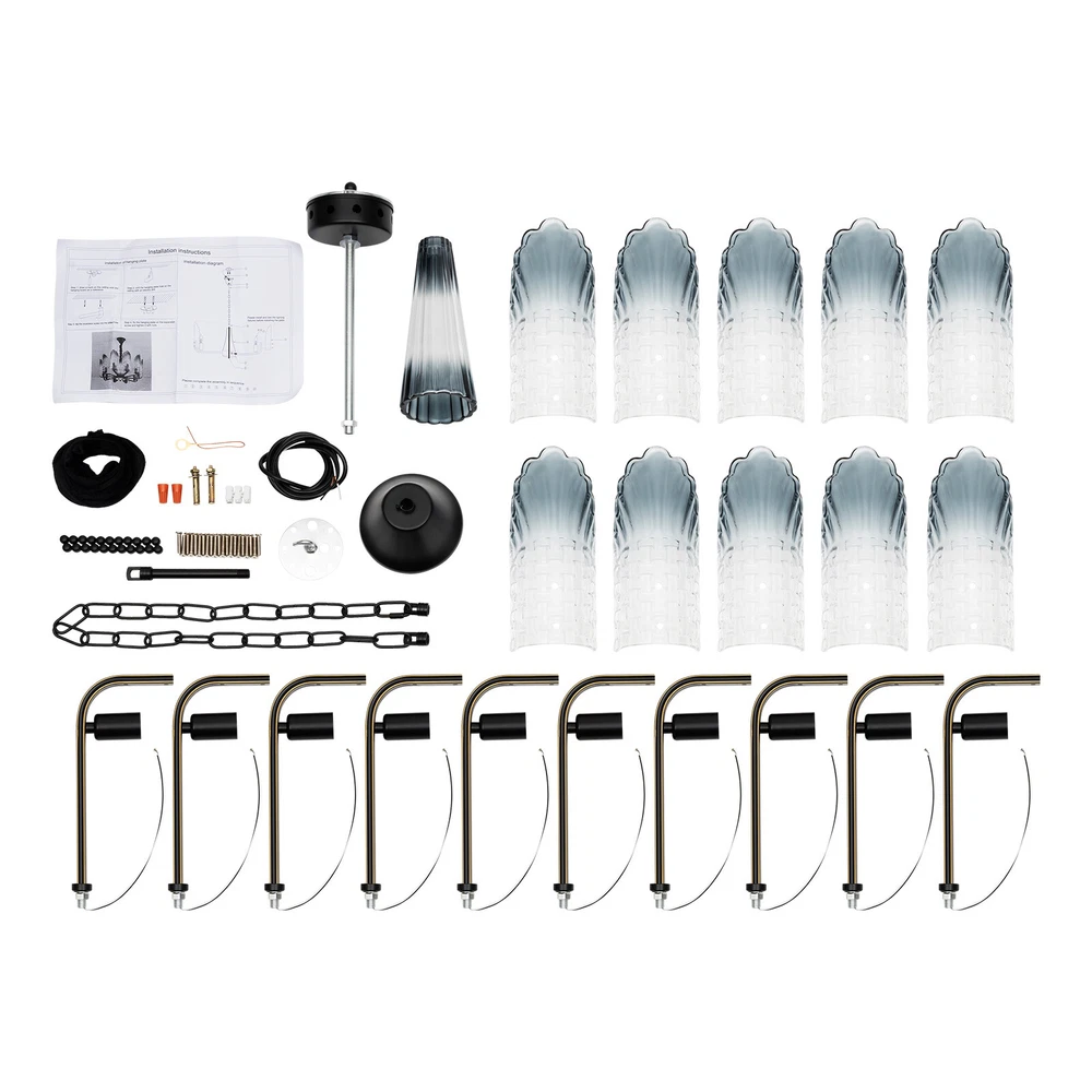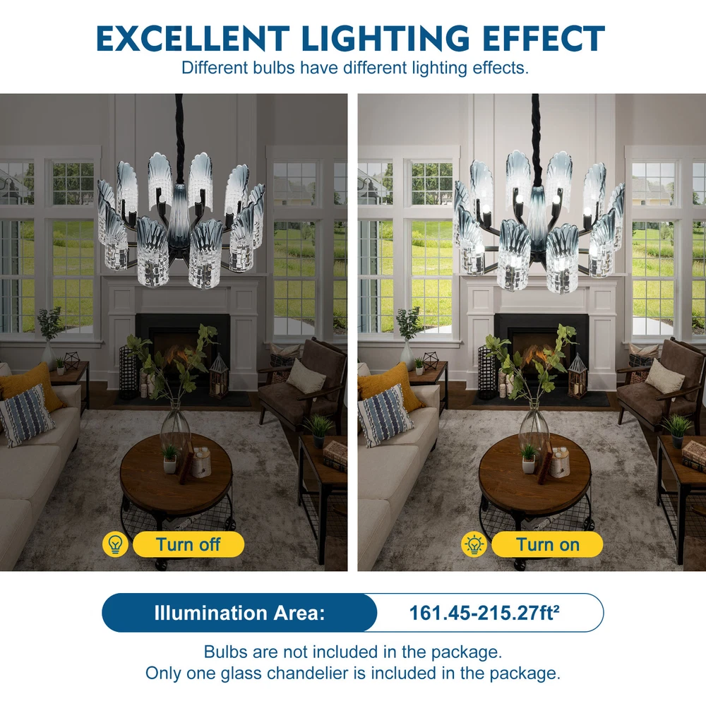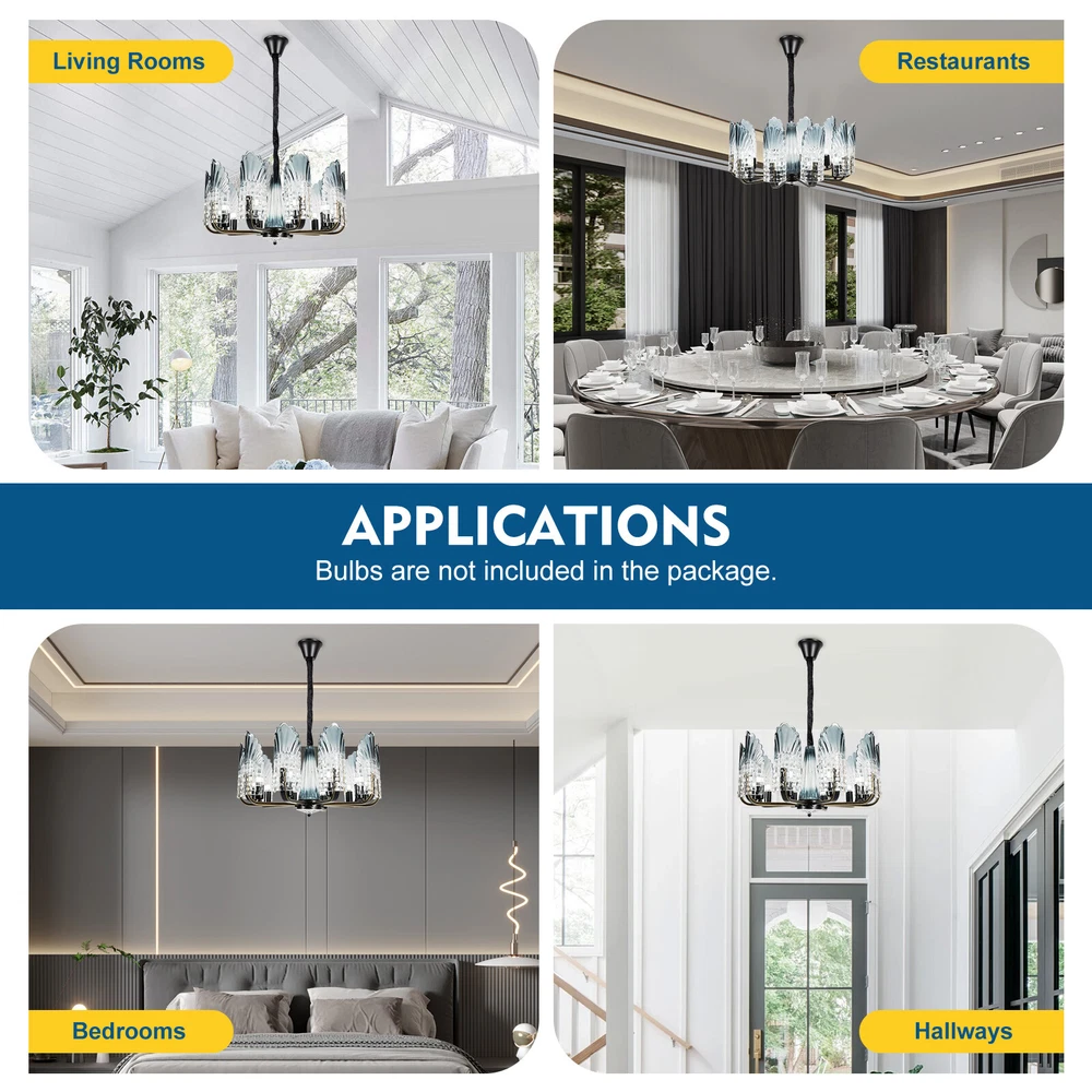 Modern Luxury Crystal Glass LED Pendant Lamp Chandelier Ceiling Light Fixture US Description People who like uniqueness and elegance will love this glass chandelier. Its unique and clear glass lampshades make it look more modern, which also can make the light brighter. The ornamental three-dimensional sense will greatly create a gorgeous ambiance for your room, giving you a great surprise. Key Features Standard Lamp Holder: The standard E12 lamp holders can support the use of LED and incandescent bulbs (not included), making it very convenient for you to purchase and replace. Durable and Sturdy: It consists of iron frames with welding and baking paint process, thick glass material lampshades with baking paint process, and an iron chain with cloth cover, making it wear-resistant, rust-resistant, corrosion-resistant, and sturdy. Adjustable Height: The length of 31.49 inches iron chain allows you to easily adjust the height of the chandelier to fit different heights of the ceiling to meet your different needs. Excellent Lighting Effect: The light bulbs (not included) enclose in a circle with a corresponding lampshade, which forms a scattered lighting effect with an area of approximately 161.45-215.27ft² when turned on. You can also purchase adjustable light bulbs to create different atmospheres with different brightness levels. Easy to Clean: The glass lampshades and baking paint iron base allow you to easily remove dust from it with a dry cloth or feather duster. Unique Decoration: The beautiful pattern on each lampshade is combined with the black iron chain above, and the light bulbs (not included) are surrounded in the middle, to bring a unique new Chinese style beauty to your home. Easy Installation: The simple structure, hook design, complete accessories, and detailed instructions allow you or professionals to easily and quickly install this product. Protective Packaging: This product comes in a custom foam board that resists compression and falls to prevent product damage in transit. Details Hanging Plate: It's made of iron with a hook, which can connect the chandelier through the iron chain and fix it on the ceiling with screws easily. Ceiling Plate: It measures 4.72*3.93 inches, increasing the contact area with the ceiling, so that the chandelier body is firmly fixed on the ceiling and not easy to fall. Iron Chain Cover: It's made of soft and high-quality cloth, which can protect the chain from dust and rust. Screw Holes: Each lampshade has two screw holes to fix it on the chandelier frames, offering great stability. Application It is very suitable for corridors, farmhouses, kitchens, nurseries, staircases, dining rooms, bedrooms, living rooms, entrances, foyers, rest areas, reading corners, attics, plant areas, etc. with a height between 8.2-11.5ft, and works well with incandescent or LED bulbs in E12, providing an illumination area about 161.45-215.27ft². How to Install 1. Draw some marks on the ceiling based on the hanging plate holes. 2. Drill the holes based on the marks. 3. Tap the expansion screws into the drilled holes. 4. Fix the hanging plate on the expansion screw and tighten it with nuts. 5. Remove the clear base cover by rotating the circular nut. 6. Insert all light frames into the holes on the base and fix them with nuts. 7. Thread one end of the main wire to the hole of pillar in the middle of the base. 8. Tighten wires of the same color together and put protective covers on. 9. Store all wires in the base and install the base cover well. 10. Install the glass lampshades and place the center hood on the silver pillar in the middle of the base. 11. Install the iron chain. 12. Put on the chain cloth and thread the main wire through the ceiling plate, then fix the other end of the chain to the ceiling plate. 13. Install E12 bulbs (not included). 14. Connect the electrical wires and it can work. 15. Bulbs are not included in the package. Specifications Material: Iron, Glass, Cloth Surface Treatment: Baking Paint, Welding Color: Clear, Blue, Black Shape: Round Style: New Chinese Style Light Fixture Form: Chandelier Control Mode: Switch Type Indoor/Outdoor Usage: Indoor Number of Bulbs: 10PCS (Not Included) Light Source Type: LED, Incandescent Bulb Lamp Holder: E12 Efficiency: E Assembly Required: Yes Power Source: Corded Electric Installation Type: Ceiling Mount Special Feature: Adjustable Height Voltage: 110V Single Bulb Power: 5-16W Illumination Area: 15-20㎡/161.45-215.27ft² Suggested Installation Height: 2.5-3.5m/8.2-11.5ft Chain Length: 80cm/31.49in Ceiling Plate Size(D*H): 12*10cm/4.72*3.93inch Gross Weight: 9kg/19.84lbs Net Weight: 7.55kg/16.64lbs Product Size (D*H): 56.5*33cm/22.24*12.99inch Package Size: 45*45*45cm/17.71*17.71*17.71inch Package Included 1*Glass Chandelier 1*English Manual All Accessories for Assembly Notes Please note that the light bulbs are not included in the package. It can be installed on a horizontal or inclined ceiling. Before installing or cleaning the chandelier, please cut off the power supply first. We suggest that this product be installed by professional personnel. Please allow the slight color difference caused by the shooting light and 1-3cm error due to manual measurement, and make sure you do not mind before you order. Payment Delivery details Terms of sales About us Contact us Payment We accept ebay payment 。 Fees such as import duties, taxes are not included in the item price or shipping costs. These charges are the buyer's responsibility. Delivery details Shipping: 2-9 working days to: USA Terms of sales We maintain high standards of excellence and strive for hundred percent customer satisfaction. Feedback is very important to us. We hope that you contact us immediately before you give neutral or negative feedback, so that we can address your concerns. It is impossible to address issues if we do not know about them! About us Your satis faction is our ultimate goal. We work hard to earn your trust and future business. Our