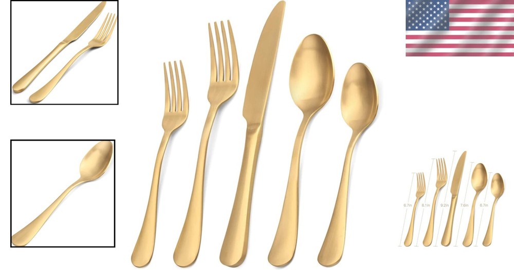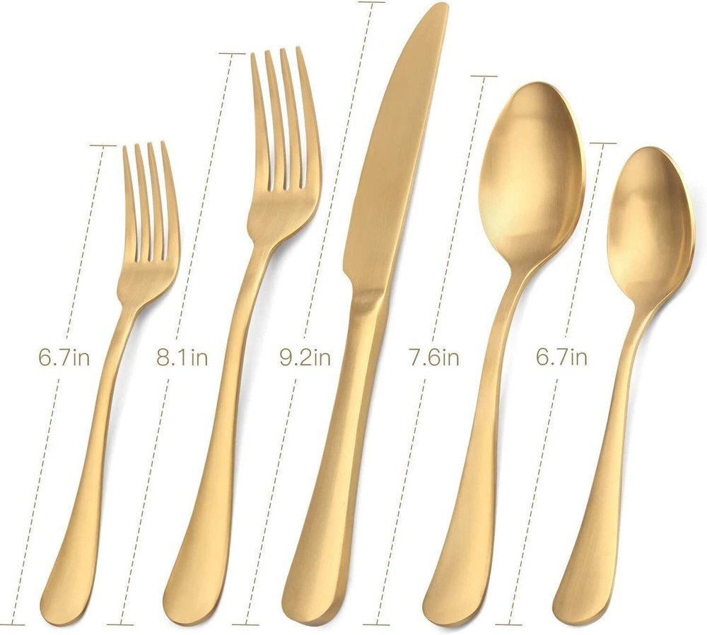 Set Includes: Set, Fork, Spoon, Knife Department: Adults Is Stain Resistant: Yes Product Care Instructions: Dishwasher Safe Care Instructions: Dishwasher Safe Brand: Unbranded UPC: Does not apply Features: Dishwasher Safe, Corrosion Resistant Finish: Satin Number of Items in Set: 40 Material: Stainless Steel Style: Modern Finish Type: Satin gtin13: Does not apply Is Dishwasher Safe: Yes Color: Gold Handle Material: Stainless Steel Service For: 8 Type: Set Item Weight: 4.21 lb Recommended Uses For Product: Indoor Package Dimensions: 10.16 X 3.15 X 2.6 Inches Personalize: No Number Of Pieces: 40 Special Feature: Corrosion Resistant