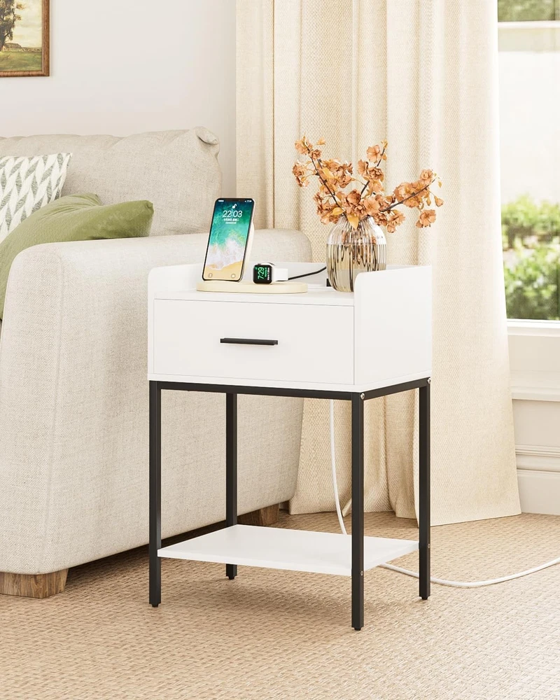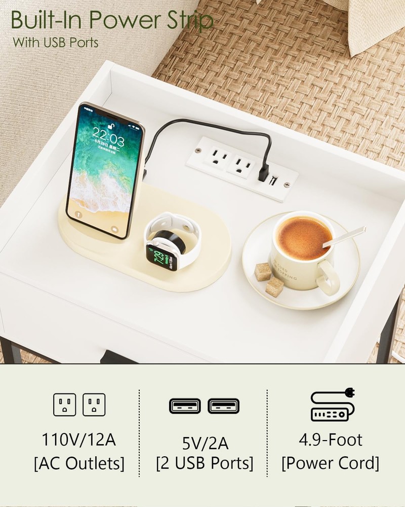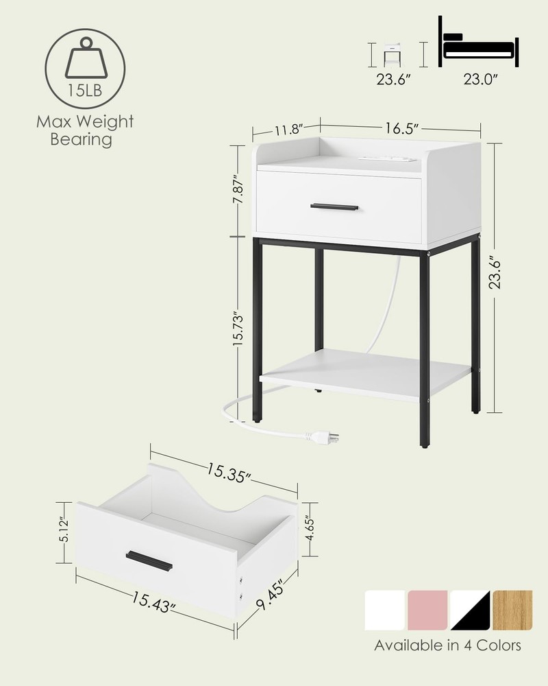 Nightstand with Charging Station,Bedside Table Drawer White-black Legs Product Details Brand: AEPOALUA Product Dimensions: 11.8"D x 16.53"W x 23.62"H Maximum Weight Recommendation: 11 Pounds Color: White-black Legs Base Type: Pedestal Item WeightFrame Material: 11 PoundsEngineered Wood Top Material TypeShape: Engineered WoodRectangular Modern White Bedside Table: The white and black color combination and eye-catching appearance make it a uniquely designed nightstand, suitable for various styles of home decoration, accompanying you every fresh morning. Large Storage Space: Measuring 11.81"d x 16.54"w x 23.62"h, this coffee table's compact size and large storage space make the small nights tand perfect for small spaces. The height of this nightstand is 23.62"h, making it suitable for placing in your bedside, sofa side, and suitable for bedrooms, living rooms and desks. Bedside Charging Helper: This nightstand has built in 2 AC outlets and 2 USB ports. Whether it is by the bed or the sofa, you can enjoy the fun of timely and rapid charging without worrying about insufficient power and cluttered wires, fully meeting your charging needs. Multi-Scenario Use: This side table has a drawer and two open shelves. Anti-drop bezel design provides perfect storage space for your desk lamp, remote control and mobile phone. Imagine relaxing next to this stylish piece of furniture while enjoying a cup of coffee. Modern design, the best nightstand for friends and family. High Quality Material, Sturdy and Stable:The end table is made of high quality MDF board with gold iron frame. Strong and durable. The bottom has adjustable feet, which not only can be placed stably on the floor, but also prevent scratches on the floor and reduce noise when moving. Easy to Assemble: The wooden nightstand comes with detailed instructions and all necessary parts in the package. You can easily install this Nightstand, and quickly clean and use. Please feel free to contact us if you have any questions on Nightstand.