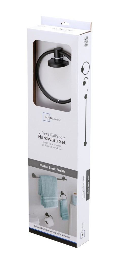 Modern Round 3-Piece Bath Accessory Kit in Matte Black features clean designs with concealed screws for a timeless look. This kit includes a matching 24" towel bar, round towel ring, and a single post, euro-style toiler paper holder. Crafted from metal, each piece is durable and built to last, helping your bathroom remain effortlessly stylish. Mounting hardware and instruction manuals included. Includes matching 24" towel bar, towel ring, and toiler paper holder Contemporary, sleek design with concealed screws Made of zinc & aluminum alloy Mounting hardware included Easy DIY installation Coordinates with Modern Round Bath Accessories