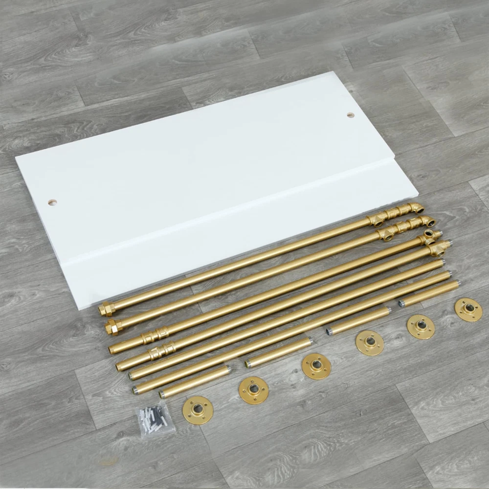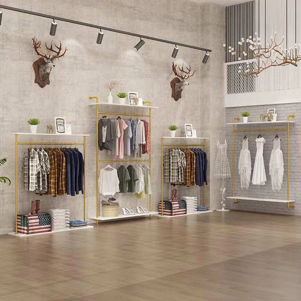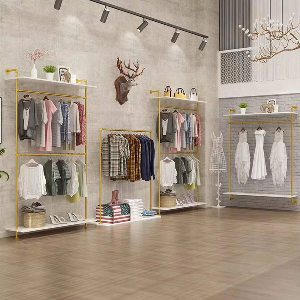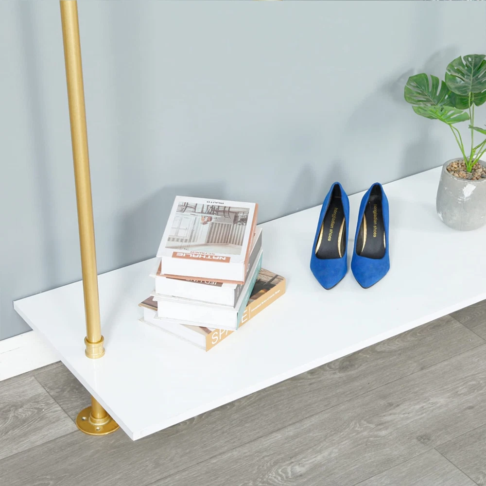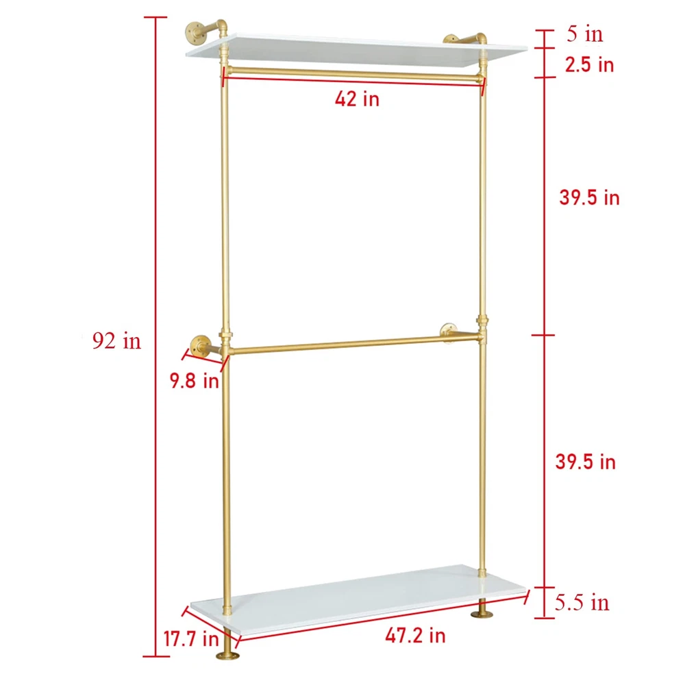 Modern Simple Industrial Pipe Double Hanging Rods Clothing Rack,Retail Display Wall Mounted Storage Clothes Hanging Shelf,2 Tier Wood Garment Rack (One Shelves,Gold , 47.2" L) High Quality Materials - Made of sturdy and durable metal frame.It is definitely strong and stable for long years to use. Made of 2cm thickness wood, has good weight capacity,Waterproof and wear-resistant.It adopts environmentally friendly spray paint, is scratch-resistant, has a smooth hand and is not easy to fade.Bold bracket, the bearing capacity is more strengthened, not easy to deform. Saving Space - This utility garment rack provides large storage space while making everything neatly;Organizer shelf can hold your shoes, hats, bags.The freestanding display rack for your home, laundry room, retail store, living room, bedroom, cloakroom. Applicable Places - clothes rack for home, retail or commercial use,The perfect combination of fashion elements and exquisite beauty, reflecting the extraordinary artistic feelings,easy to match with different styles of room,Ideal for providing extra clothing storage displaying boutique merchandise, or providing space for costumes or outfits in theaters or studios Approximate Dimensions (inches):90.5 H × 47.2 L × 17.7W inch. This functional clothing rack has a simple but firm structure. Easy to put all parts together according to assembly instruction.