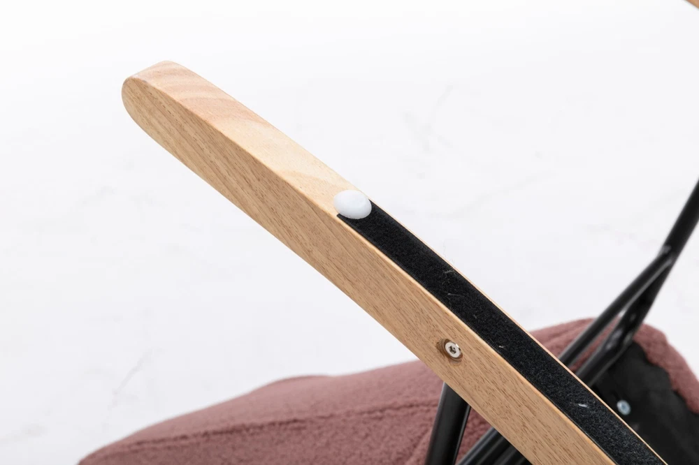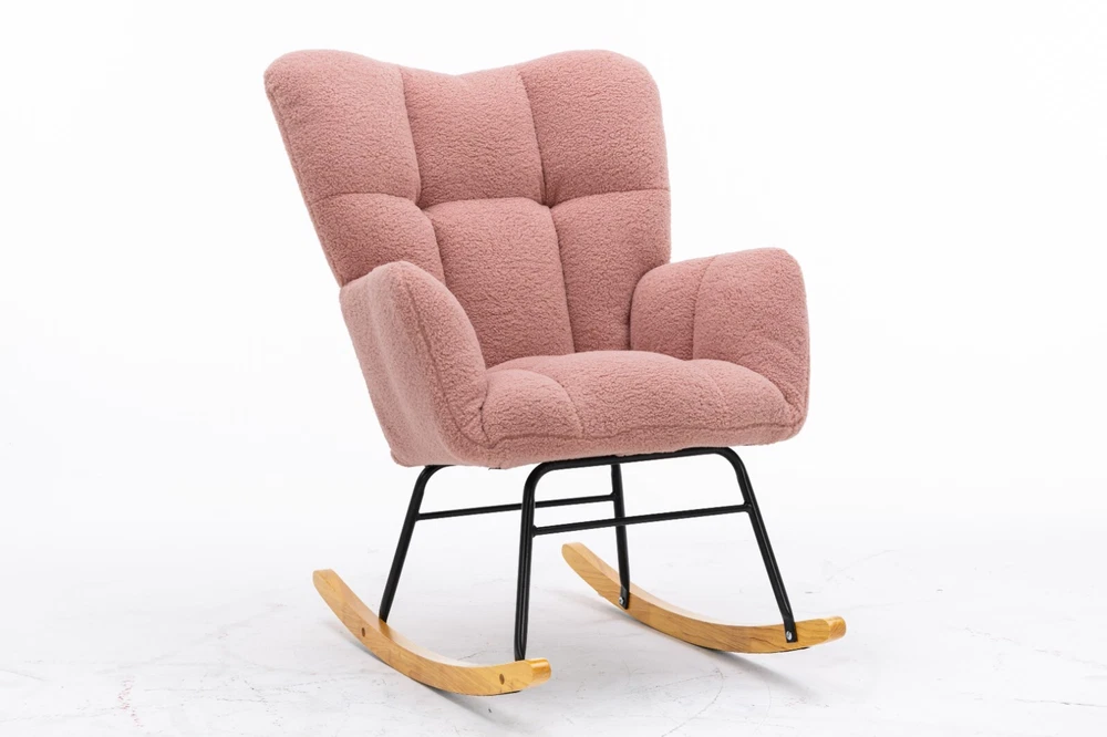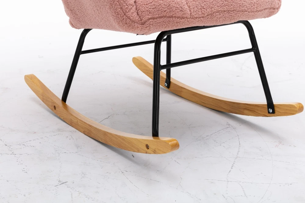 About This Item: Product BOM: Soft Teddy Material+Foam Filling+Wooden Frame+Black Paint Metal Base+Wooden Rocking Legs+Upholstered+Floor Protection And Isolation Layer; Product Feature:Rocking; Use Case:Indoor,Accent Chair,Nursery Chair,Rocking Chair,Glider Chair,For Living Room,Bedroom and Other indoor space; Product Capacity: 250 LBS Product Assembly: The assembly is so simple that two person can assemble it in 25 minutes; Specification: Color: Pink Material: Teddy Filler: Foam Product Dimensions: 31.5"D×27.6"W×37.4"H Weight:26.46 LBS