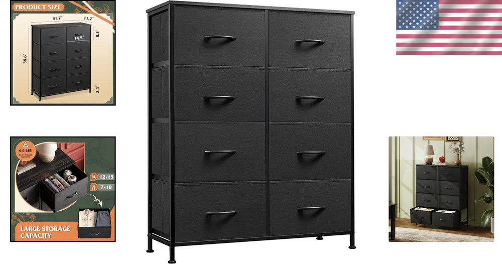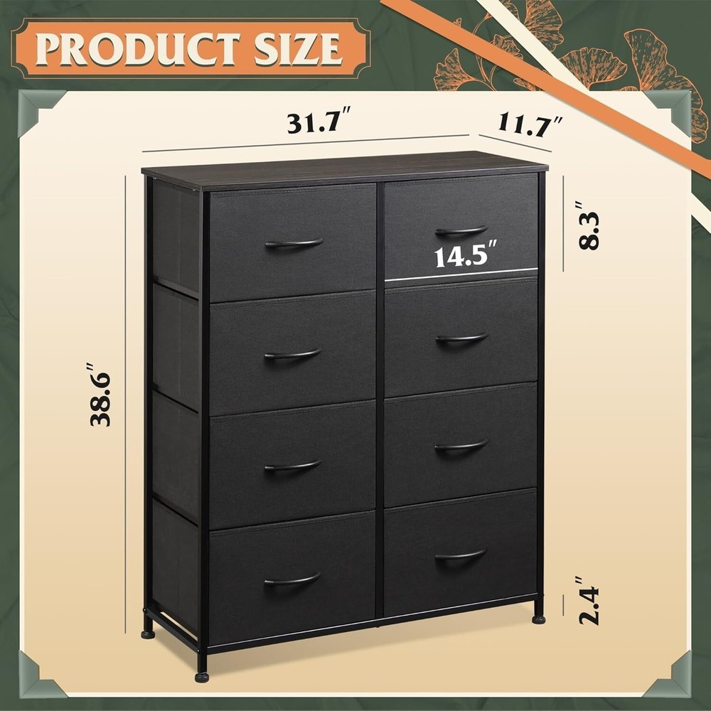 Product Care Instructions: Wipe With Dry Cloth Handle Material: Plastic Handle Type: Lever Handle Special Feature: Adjustable Feet, Durable Size: A-medium Size Mounting Type: Freestanding Mounting: Free Standing Distance from Floor to Bottom: More Than 14 in Finish: Black Required Tools: No Tools Required Item Depth: 11.7 in Features: Adjustable Feet, Durable Maximum Weight Capacity: 100 lb gtin13: Does not apply Number Of Pieces: 1 Item Weight: 10.46 kg Room: Bedroom, Living Room, Entryway, Dorm, Hallway Care Instructions: Clean with Dry Cloth Item Width: Fabric Dresser Type: Chest of Drawers Handle Finish: Black Era: 21st Century (2000-now) Product Dimensions: 11.7"d X 31.7"w X 38.6"h Brand: Unbranded Item Length: Fabric Dresser Shape: Rectangular Number of Drawers: 8 UPC: Does not apply Item Height: Fabric Dresser Department: Adults Additional Parts Required: No Material: Metal, Steel, Wood, Fabric Color: Charcoal Black Min. Required Door Width: 11.8 Inches Style: Contemporary/Modern Room Type: Bedroom,hallway,living Room Furniture Finish: Black Personalized: No