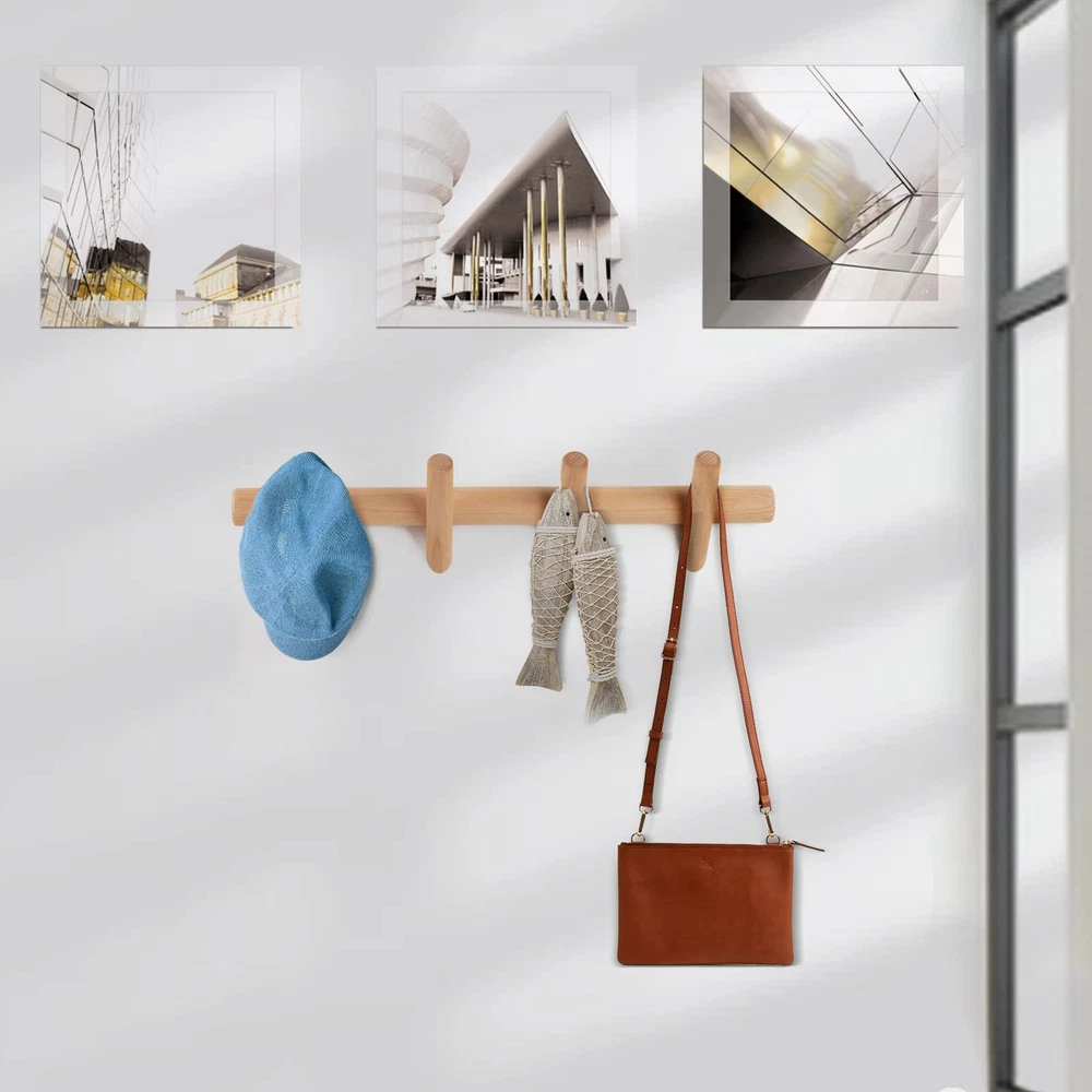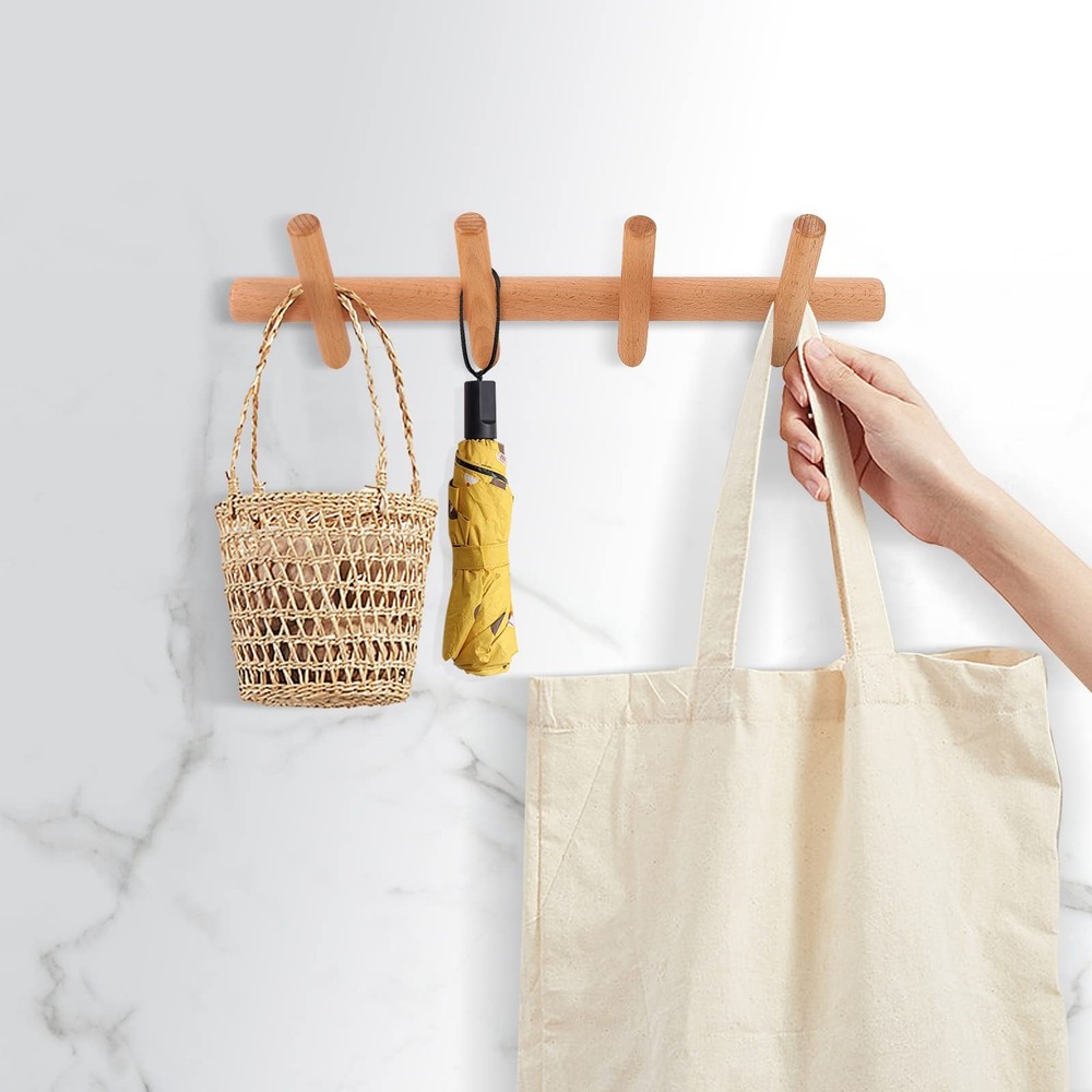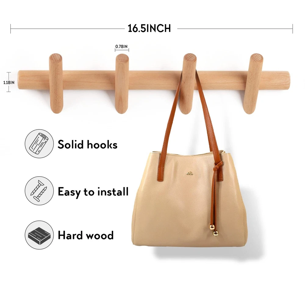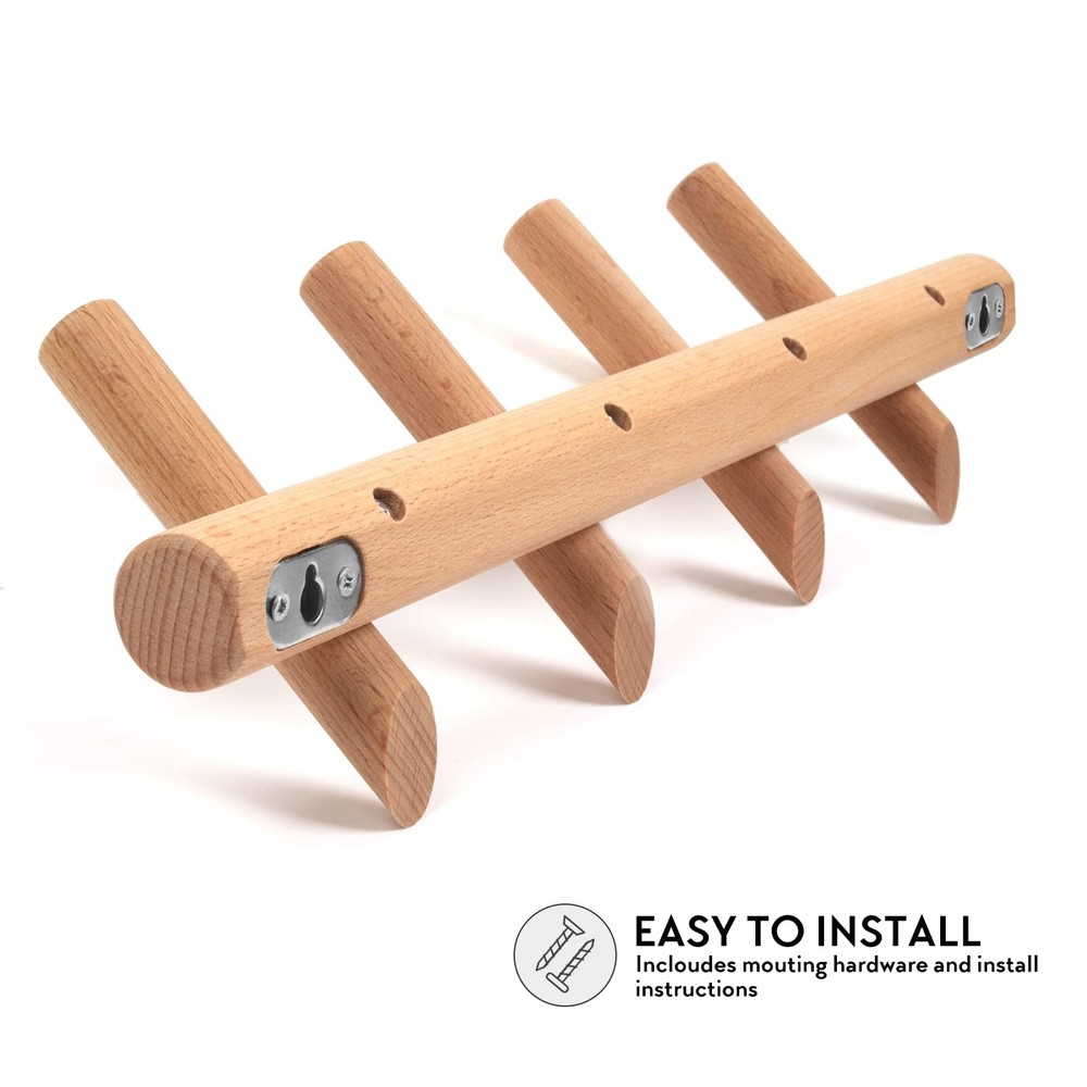 Modern Wall Mounted Coat and Hat Rack with Pegs - Beautiful Wooden Entryway Hooks - Wood Hanger Robe Racks for Bedroom and Bathroom - Durable, Easy Assembly, 4 Hooks Decorate Your Life: The coat rack wall mounted maintains classic beauty with a modern build, making it perfect for any entryway, mudroom, shed, garage, bathroom or bedroom, etc 100% Natural Beech Wood: The wood coat hooks was made of natural beech wood, polished smoothly rounded corners, easy to clean, healthy, durable Sturdy and Durable Rack: The wood coat rack can hold up to 20lbs, 5lbs for each hook; Smooth satin and moisture resistant finish Easy to Assemble: This wall rack with coat hooks comes fully assembled. The package includes the two screws to drill the holes for installation Rack Length 16.8 inches, Peg Length 5 inches; Quality and satisfaction