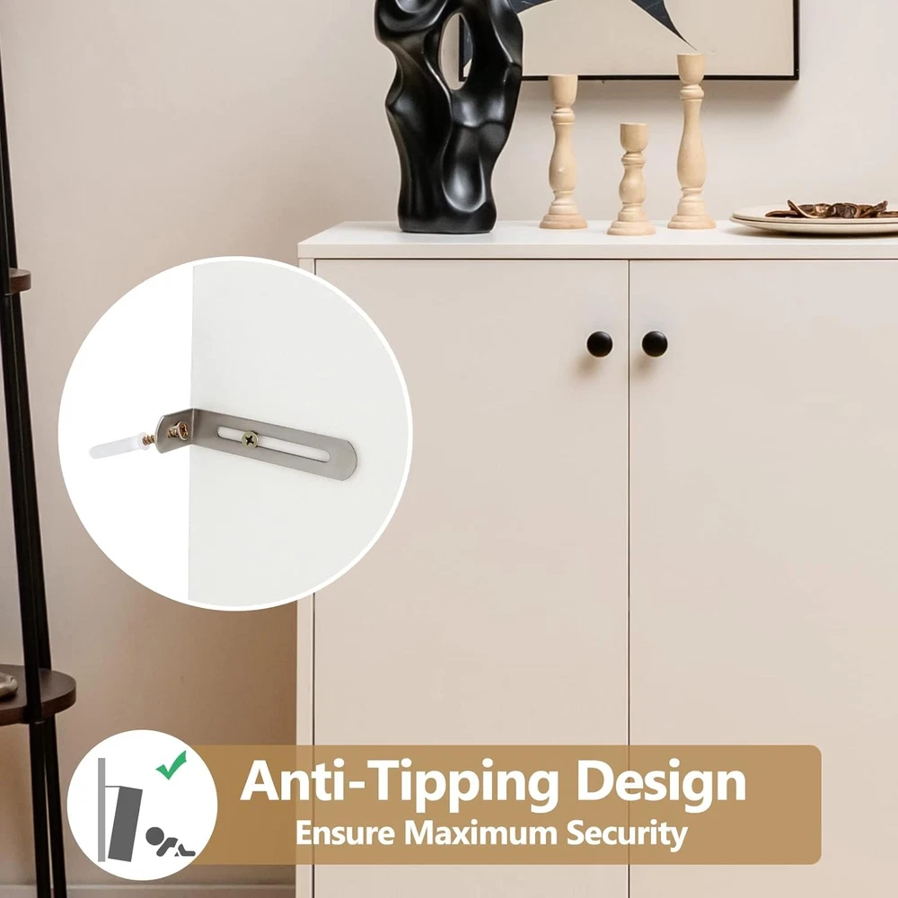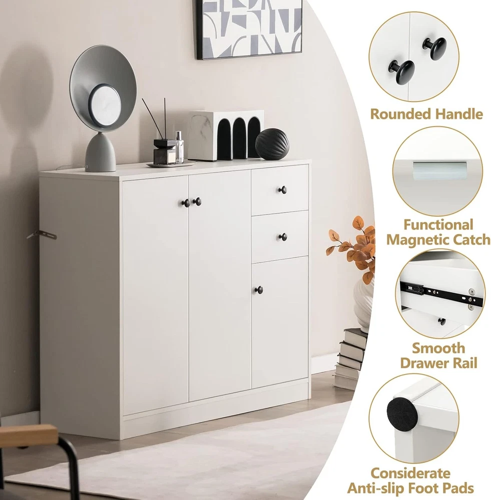 Product Description About this item [Ample & Classified Space]: The open spacious tabletop of this modern buffet cabinet allows you to place daily necessities and display your ornaments. In addition, the 2 storage drawers and 2 cabinets of different sizes can store the tableware, glass, cooking utensils, etc., hiding them to avoid dust. [3-Level Adjustable Right Shelf]: The shelf in the small cabinet features 3 adjustable heights. According to the height of the stored item, it can be easily adjusted up or down. Or, you can just remove the shelf to get more storage space for bigger and taller items. [Sturdy & Durable Materials]: Made of thick MDF boards and engineered wood boards, this buffet sideboard is not easy to bend. The surface is covered with scratch-resistant veneers that are also smooth and easy to clean. Besides, the drawers are equipped with premium metal rails, allowing you to slide them smoothly. [Safe Anti-Tipping Design]: This white sideboard features a large and stable base, which makes the cabinet not easy to wobble. Moreover, the included anti-tipping accessories enable you to fix the kitchen sideboard to the wall, which ensures maximum security and additional stability. [Easy Assembly & Wide Applications]: Coming with detailed instructions and necessary hardware, this buffet cabinet is easy to assemble. It is a practical cabinet to add extra storage space to the dining room, living room, etc. Overall dimension: 42” x 13.5” x 33.5” (L x W x H). Description: Featuring a large tabletop, 2 drawers and 2 cabinets, this storage cabinet with ample space would be a good solution to say goodbye to your messy room. The shelf in the small cabinet can be adjusted to fit items of different heights. And the functional magnetic catch keeps the doors closed tightly, preventing dust from getting in. With the smooth drawer rails and rounded handles, you can easily slide the drawers. Constructed from premium thick boards, this buffet cabinet with storage is quite sturdy and durable. The surface is smooth and scratch-resistant. Thanks to the anti-tipping devices, this sideboard cabinet can ensure additional stability and safe use. When you need to move it, the considerate anti-slip foot pads will protect the floor from scratches. This simple and stylish console cabinet is suitable for the dining room, living room, etc. Features: Large tabletop, 2 drawers and 2 cabinets meet daily storage needs Shelf in the small cabinet is adjustable to store items of different sizes Boards of quality ensure sturdy structure and long-lasting use Scratch-resistant and smooth surface for easy cleaning Stable and safe enough with the anti-tipping device Premium metal drawer slides for smooth opening and closing Doors with magnetic catches keep items away from dust Anti-slip foot pads prevent the floor from getting scratches Versatile to be used in the kitchen, dining room, living room, etc. Clear instructions and included hardware make the assembly easier Specifications: Color: White Material: Engineered Wood, MDF Overall Dimension: 42” x 13.5” x 33.5” (L x W x H) Inner Dimension of Each Drawer: 11” x 11” x 4” (L x W x H) Net Weight: 83 lbs Total Weight Capacity: 286 lbs Package Includes: 1 x Kitchen Sideboard 1 x Instruction