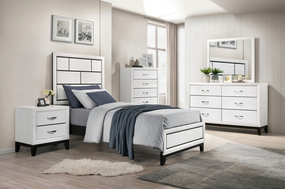 Modern White Finish Queen Wood Bed with Black Linens Stylish Bedroom Furniture