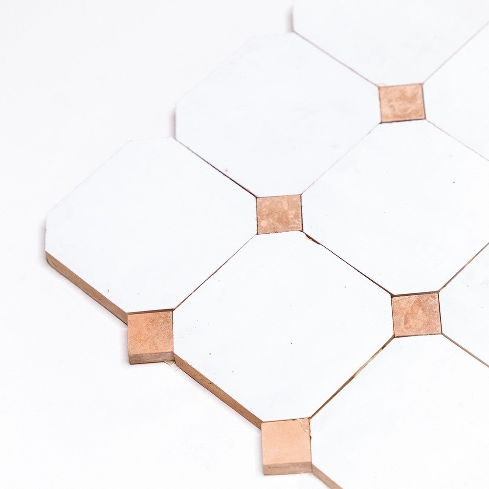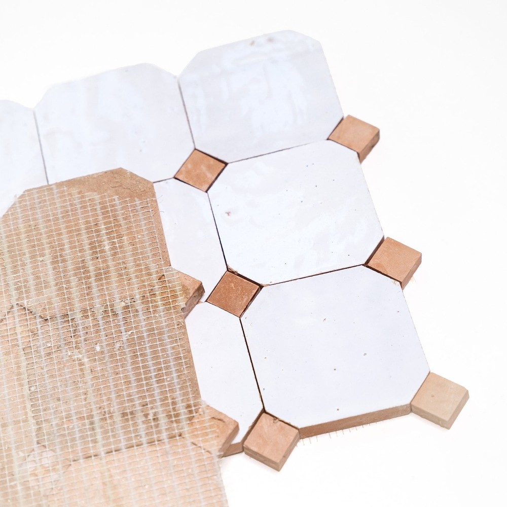 Our new contemporary zellige patterns feature handcrafted tiles that are water jet cut and glued by hand to a mesh backing making installation a breeze. These tiles are made with our standard 4" x 4" zellige tile cut into octagons and accented with small terra cotta diamonds. This stunning pattern has been used for hundreds of years and will never be out of style. Brand: Moroccan Mosaic and Tile House Type/style: Floor and Wall Tile Materials: mesh backing zellige tile Dimensions: 12 inches long x 12 inches wide x 0.5 inches thick (each) Square footage per tile/ box: 1 tile=1 square foot, 8 tiles per box (8 sq. ft. per box) Installation: Professional installation is recommended. Pack/case of: 8 tiles per box Handmade, durable, Indoors/ Outdoor, high quality materials, Free Shipping Over $49.99* Details Contemporary Zellige Panels, 12x12x0.5, White-Terracotta accents Product Description: Our new contemporary zellige patterns feature handcrafted tiles that are water jet cut and glued by hand to a mesh backing making installation a breeze. These tiles are made with our standard 4" x 4" zellige tile cut into octagons and accented with small terra cotta diamonds. This stunning pattern has been used for hundreds of years and will never be out of style. BrandMoroccan Mosaic and Tile House Type/styleFloor and Wall Tile Materialsmesh backing zellige tile Dimensions12 inches long x 12 inches wide x 0.5 inches thick (each) Square footage per tile/ box1 tile=1 square foot, 8 tiles per box (8 sq. ft. per box) InstallationProfessional installation is recommended. Pack/case of8 tiles per box Handmade, durable, Indoors/ Outdoor, high quality materials, environmentally responsible and resource efficient, low maintenance **Please noteThat each tile is hand made individually and minor variations in color, or surface texture are natural characteristics of all our Handmade tile and it 's also part of the Charm. Story Behind the Art: "It's more than tile, it's art." That simple statement is what sets the craftsmanship of Moroccan Mosaic apart from the rest. Based in the small city of Sale, Moroccan Mosaic is a family business going back 4 generations. When Simo, the current head of the business graduated from university in New York, he had little interest in the family business. But on a return trip home, he saw that the business was not doing well and set about reviving it. One important change he made was introducing black, grey, and white designs to appeal to American and European customers. It worked. When he started, they employed 2 workers and now they have nearly 80 on staff. The workshop itself is fairly simple, and the techniques used to create the tiles are steeped in tradition. Some modern equipment is available, though the workers prefer to use the more rustic tools. The creative process is time intensive and done by hand, as Simo insists on no corners be cut or production be rushed. Environmentally responsible and resource efficient, no chemicals are used at any step. For example, colors used come from nature literally. Green comes from mint leaves, orange from orange peel, and black from charcoal. The tiles themselves are a simple mixture of cement, sand, and granite powder. Moroccan Mosaic hires only local workers, teaching them a valued skill as well as paying them fair wages. Simo's goals for his business are to share the tradition of gorgeous Moroccan tile, grow the business, and employ more and more workers. What is Worldstock? The handcrafted touch of artisan skill will create variations in color, size and design. Color differences may occur between the actual product and your computer screen. If buying two of the same item, slight differences will occur from piece to piece. Imported Please note: Orders over 180-pounds or in 7 or more boxes will be shipped via Freight carrier and our Oversized Item Delivery/policy will apply. Please click here for more information. Country of OriginMorocco