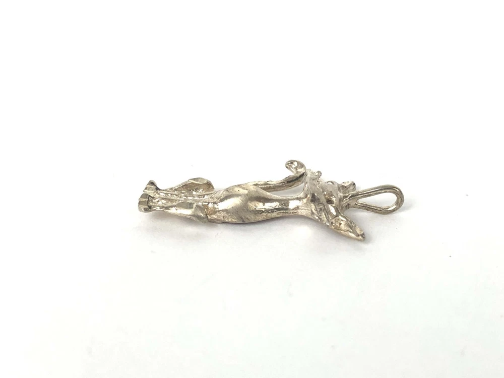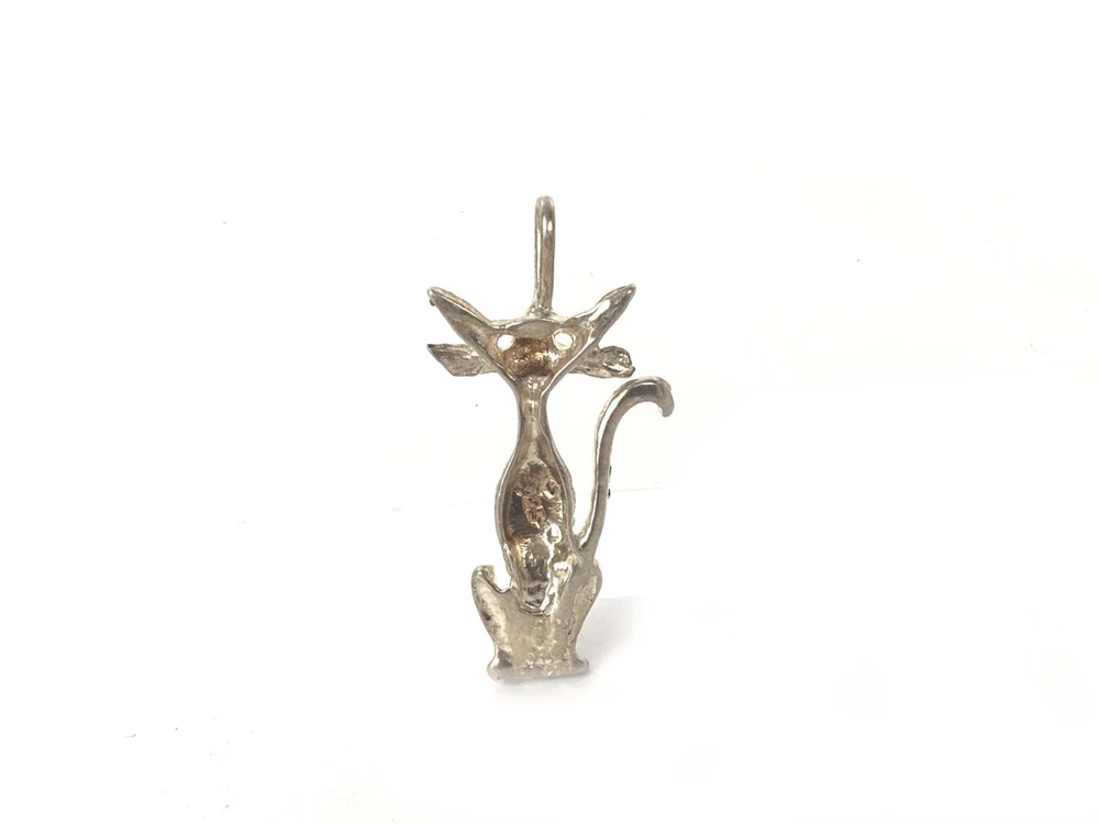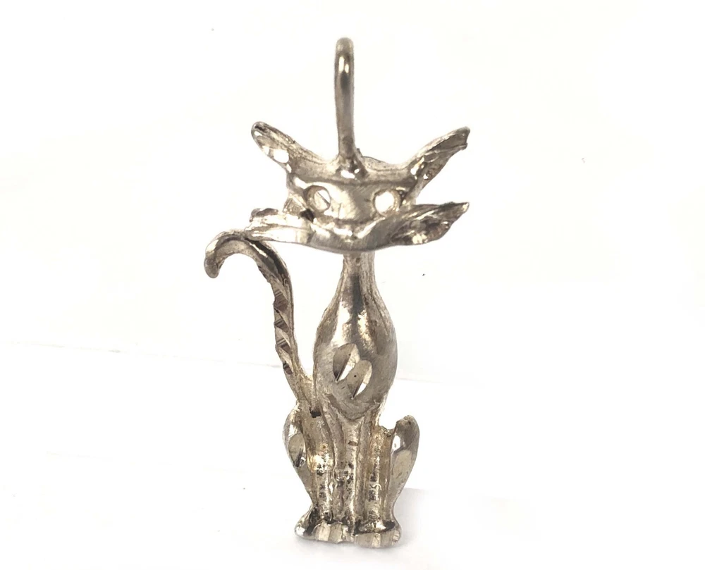 Modernist Kitty Cat Pendant Diamond Cut Sterling Silver 925 Pre-Owned Estate This petite pendant features a sleek cat design crafted from fine sterling silver (925). With its whimsical animal theme, this piece is perfect for lovers of all things cat. The silver color and simple style make it a versatile addition to any jewelry collection. Whether you're looking to add a touch of elegance to a casual outfit or to accessorize an evening look, this pendant is sure to get attention. Don't miss out on this pre-owned estate jewelry piece that is as timeless as it is adorable. 1 3/8" from the bale down. Not marked, tests as sterling